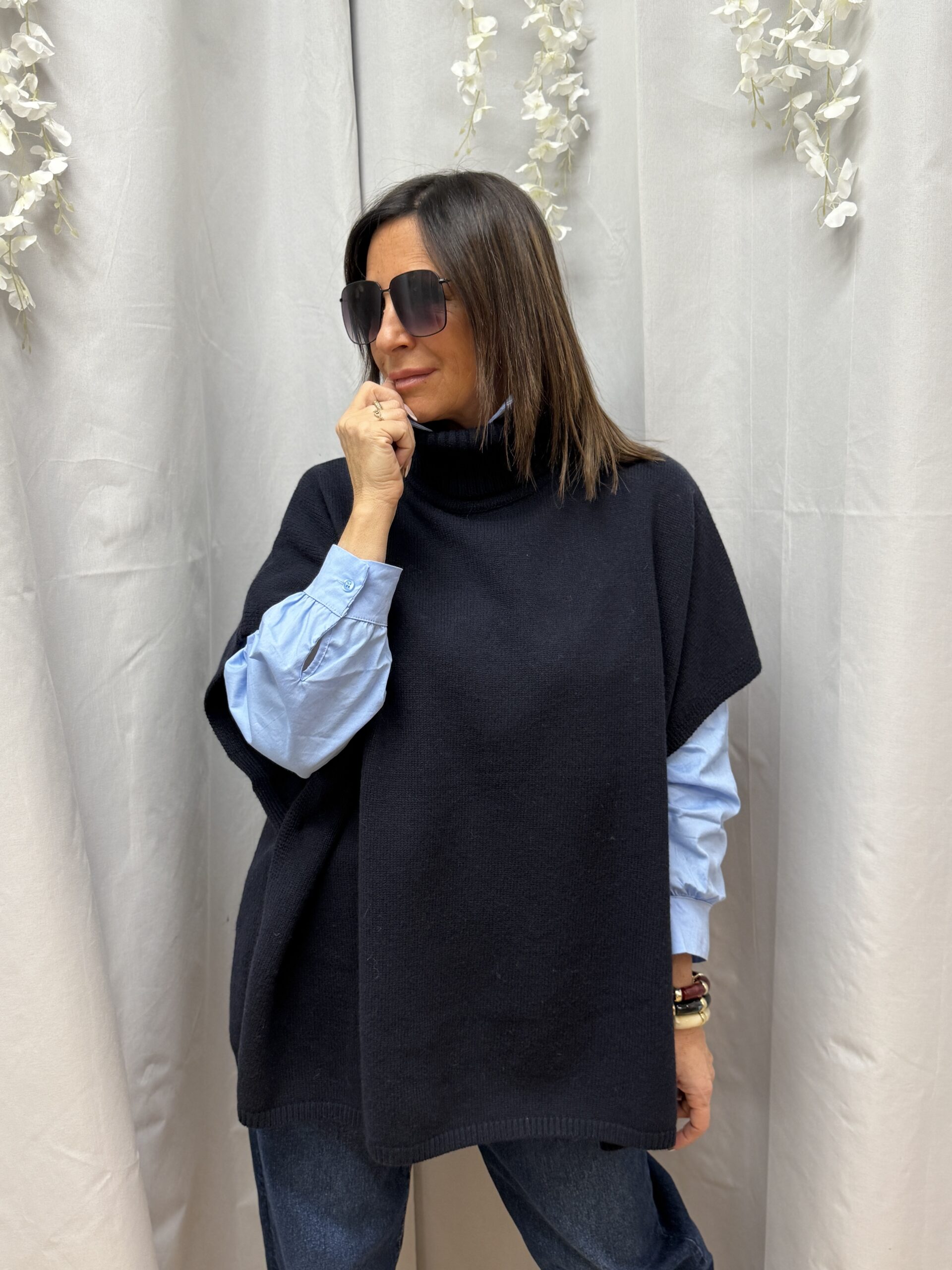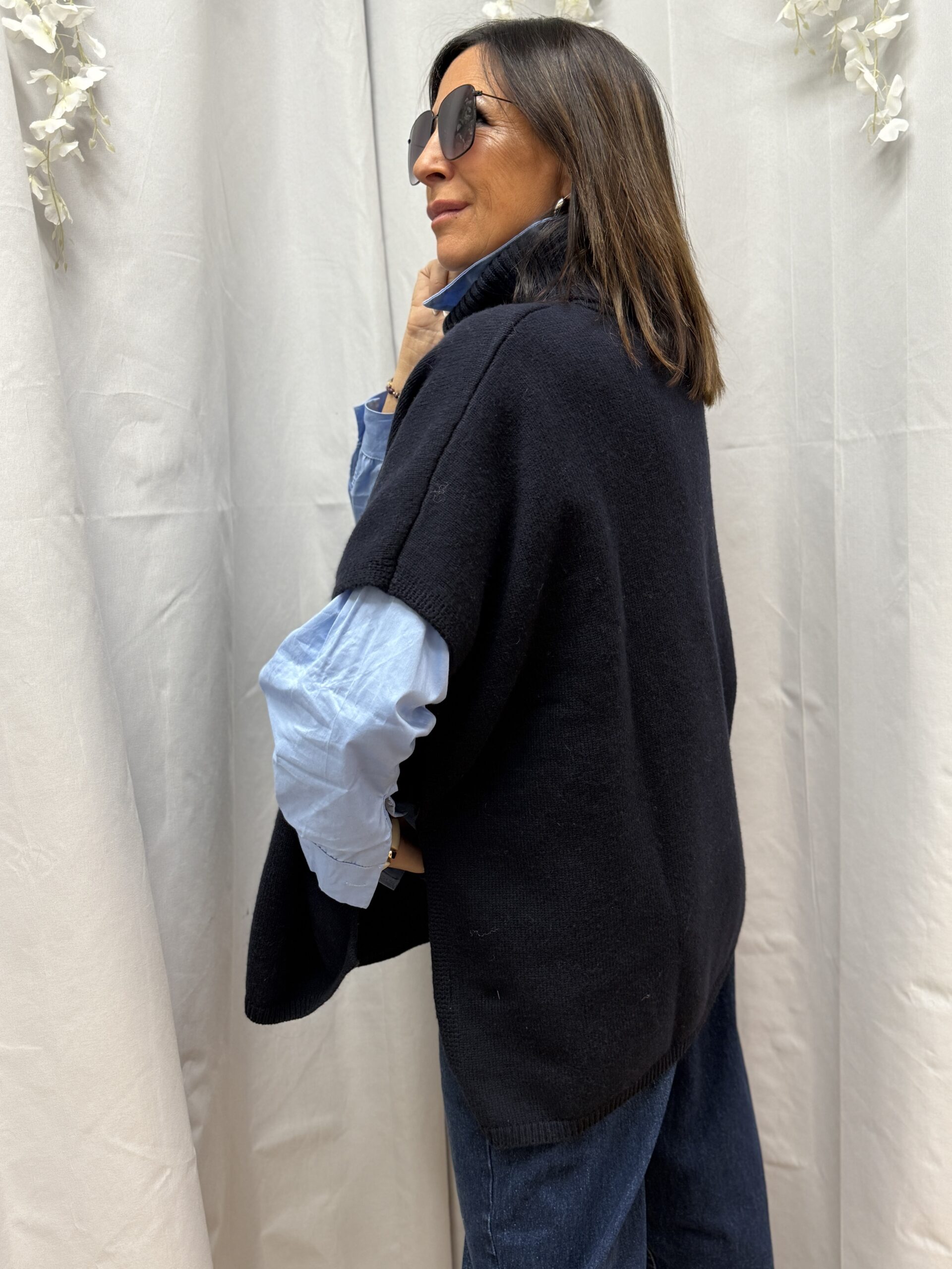 Conseil look de Nathalie : Ce pull cape est idéal pour moderniser un jean slim, portez-le par-dessus une chemise blanche pour un look élégant .