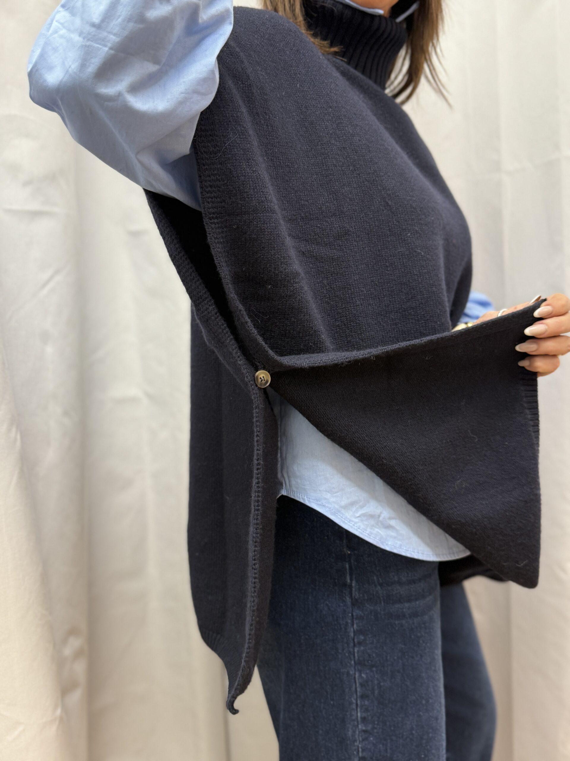 Ce pull cape bleu marine est la pièce parfaite pour celle qui recherchent confort, chaleur et élégance minimaliste.