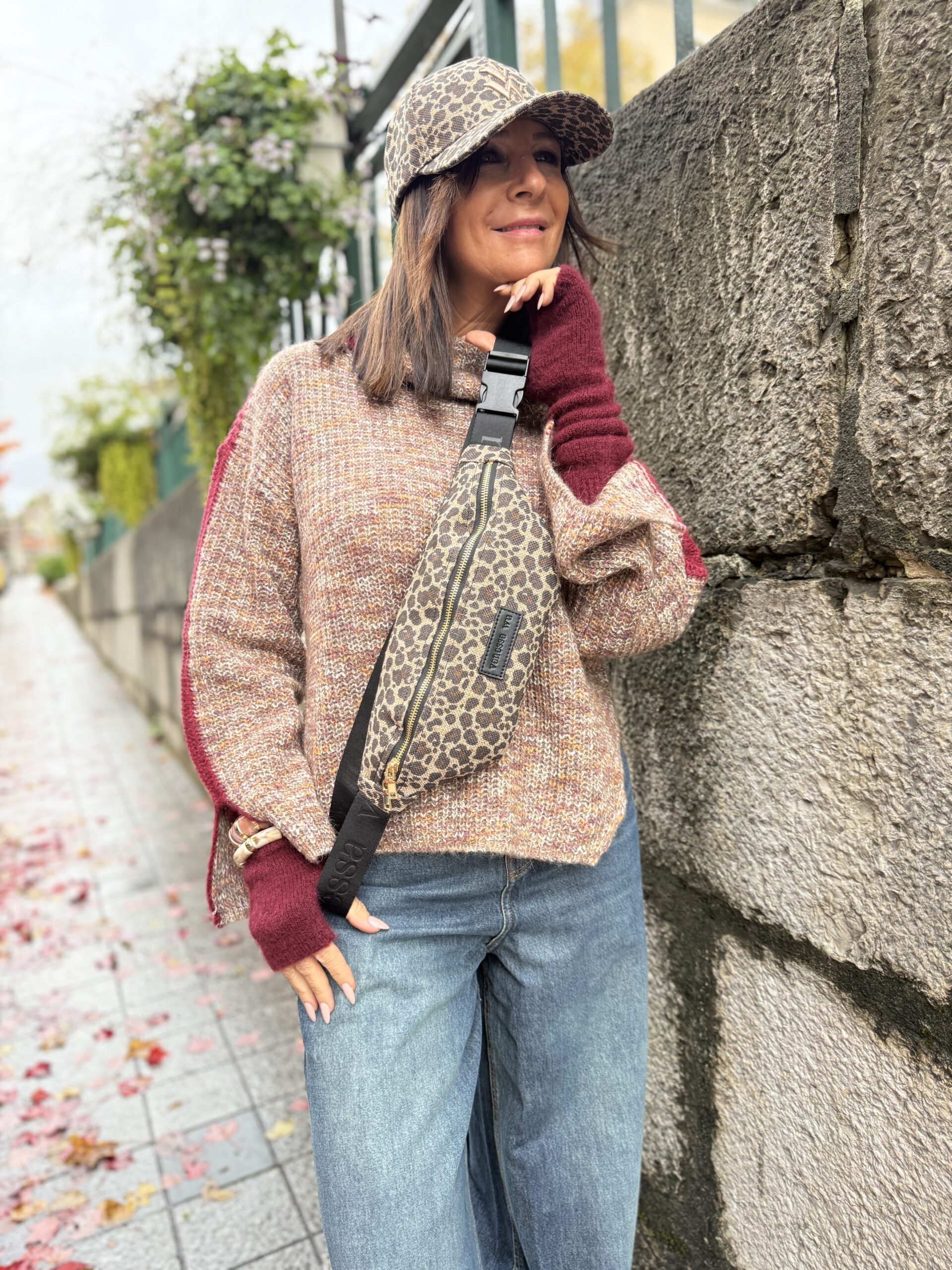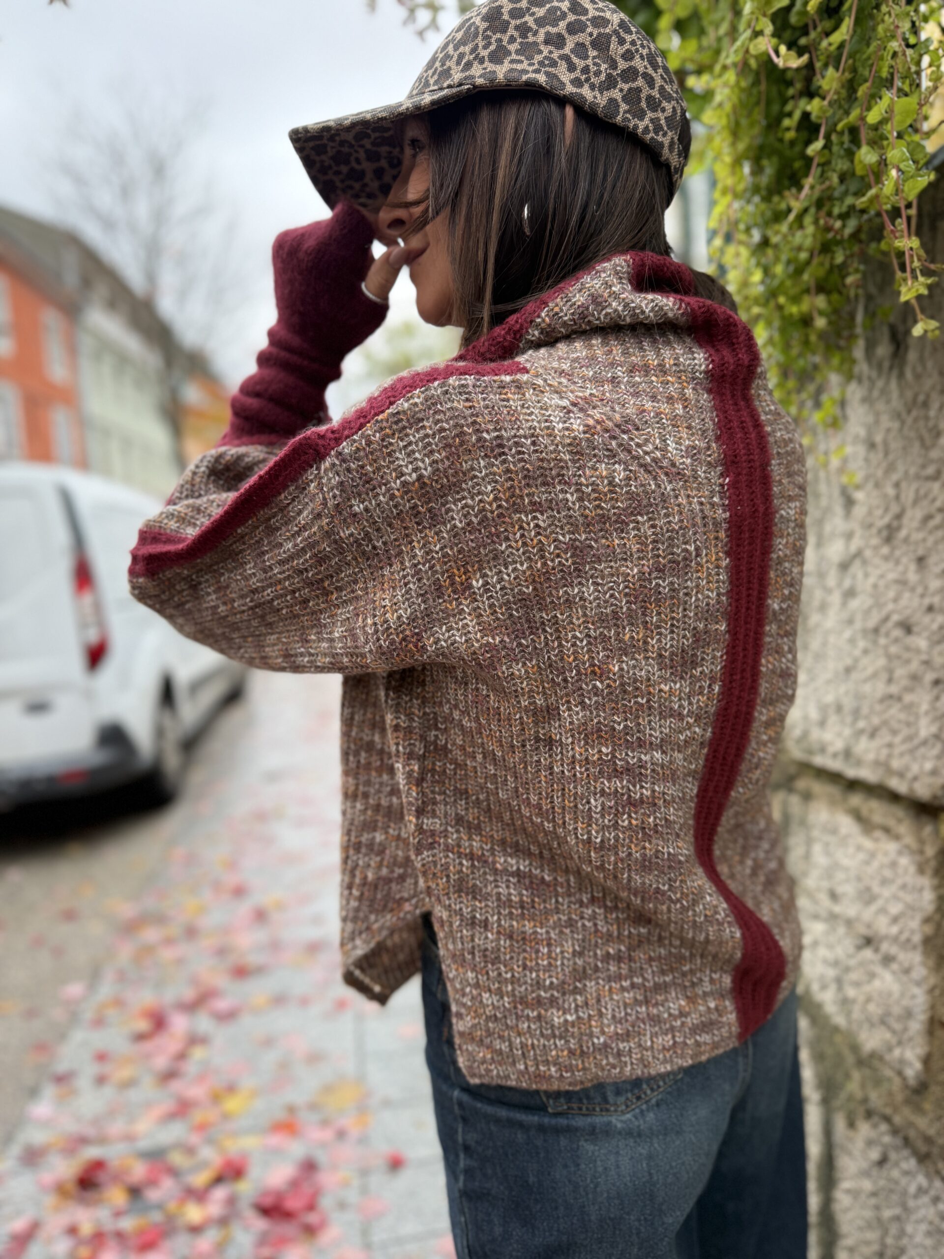 Ce pull montant femme, bicolore bordeaux est l’allié parfait des journées fraîches. Le col montant structure la silhouette tandis que les bordures bordeaux créent un lien fort avec les autres pièces du look.