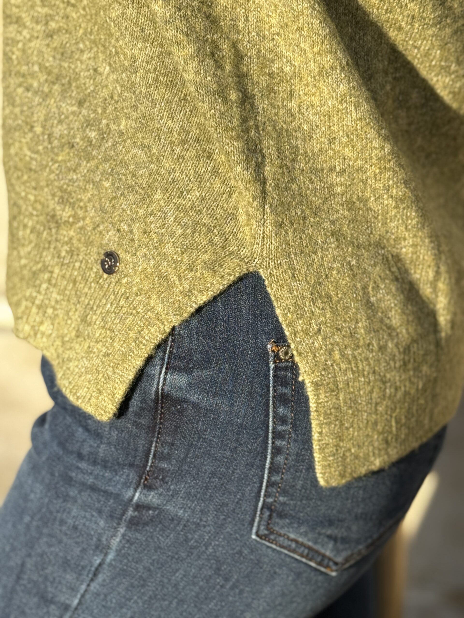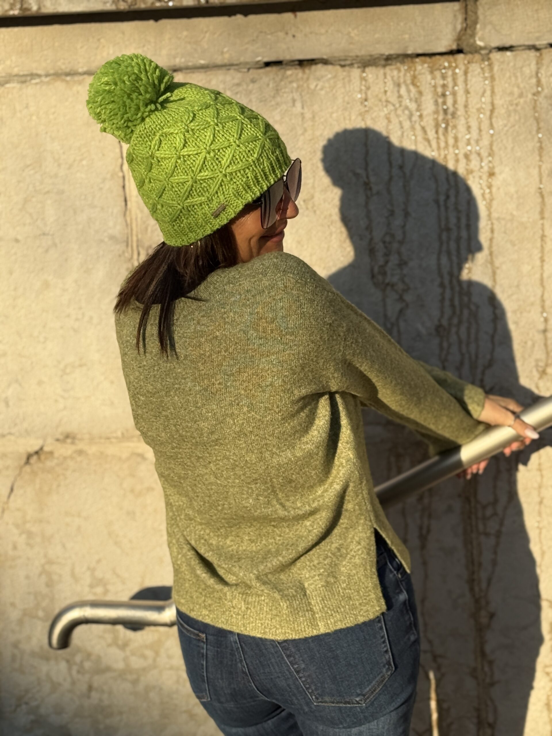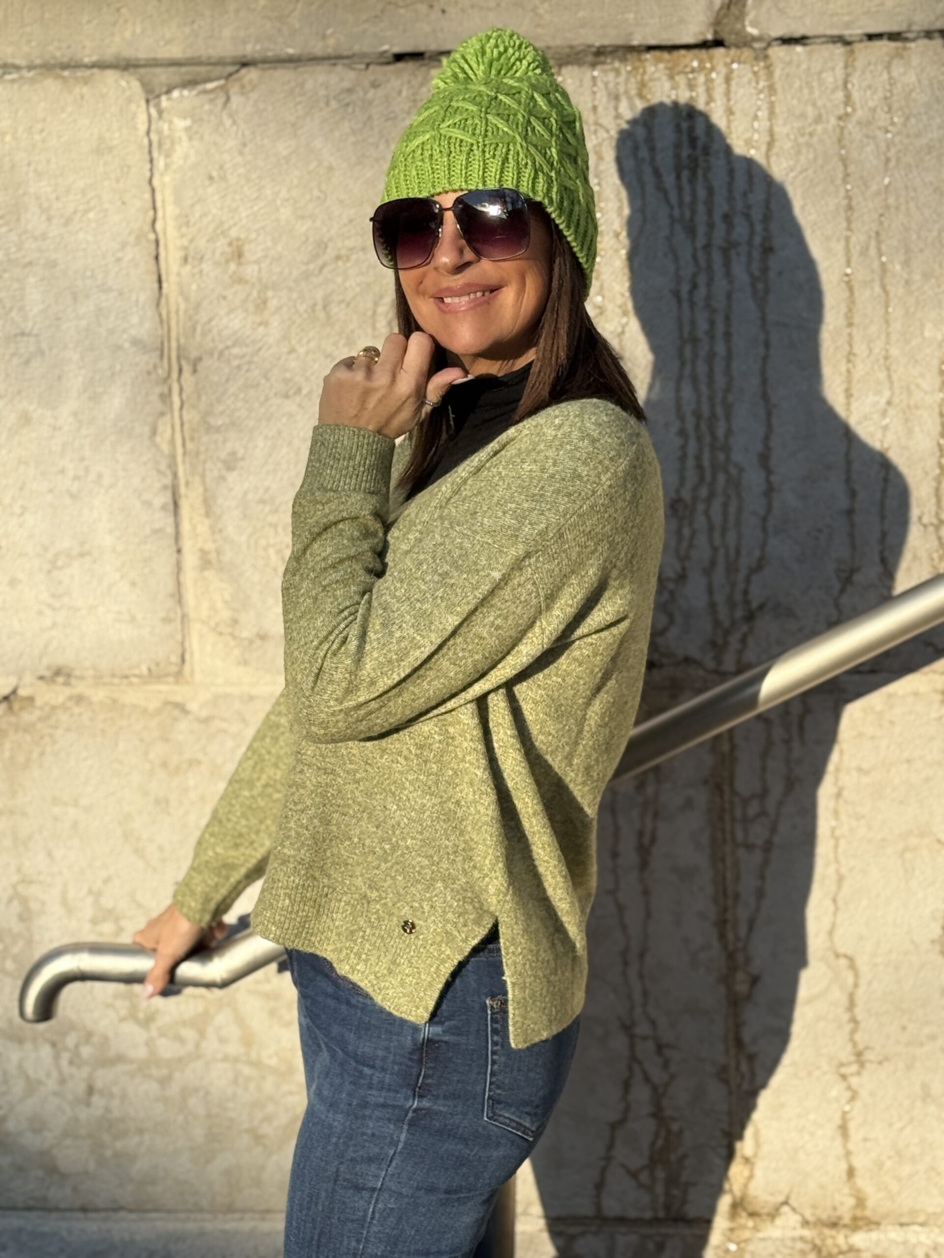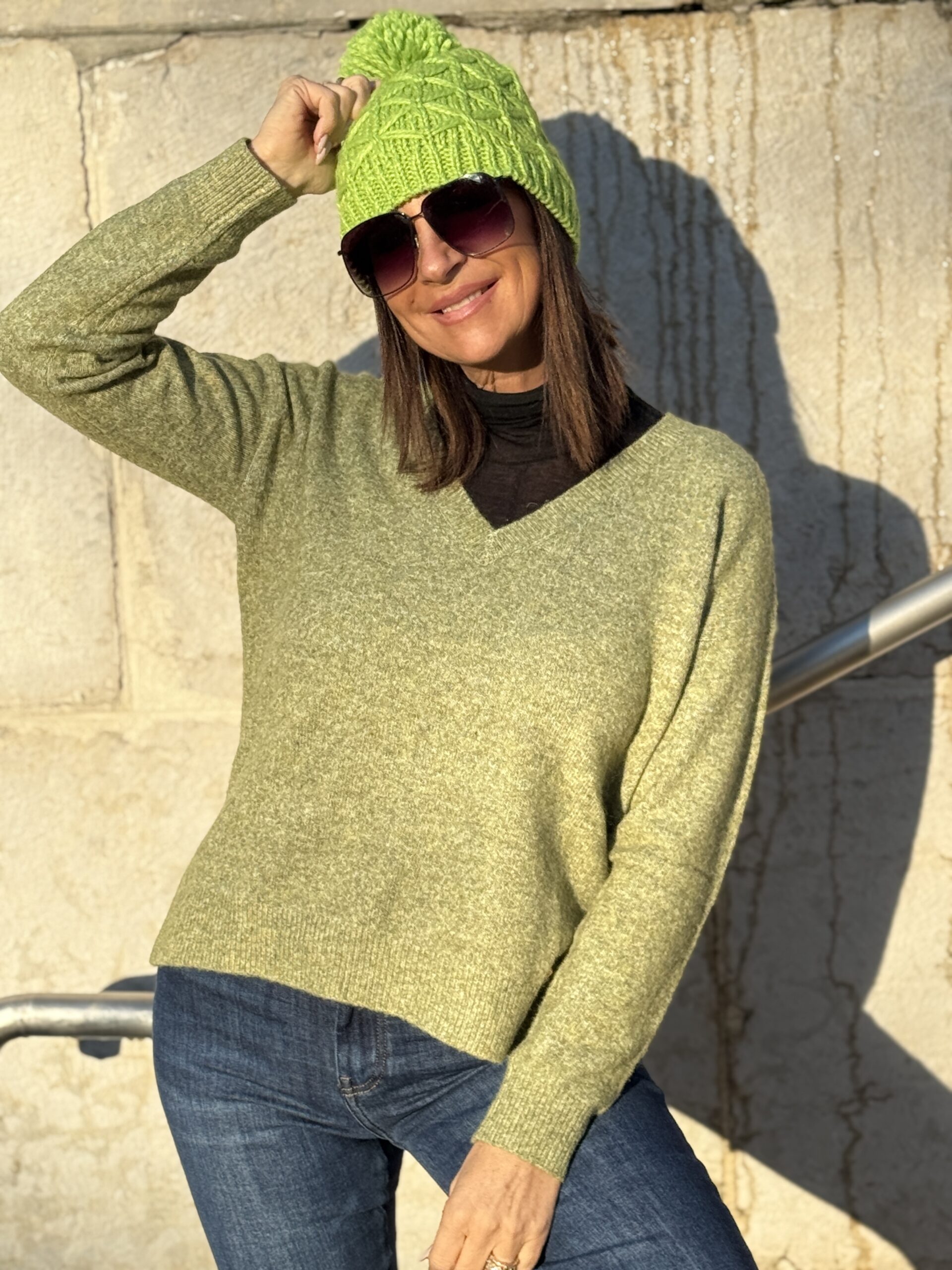 Ce pull en maille vert mousse offre un style doux et élégant!