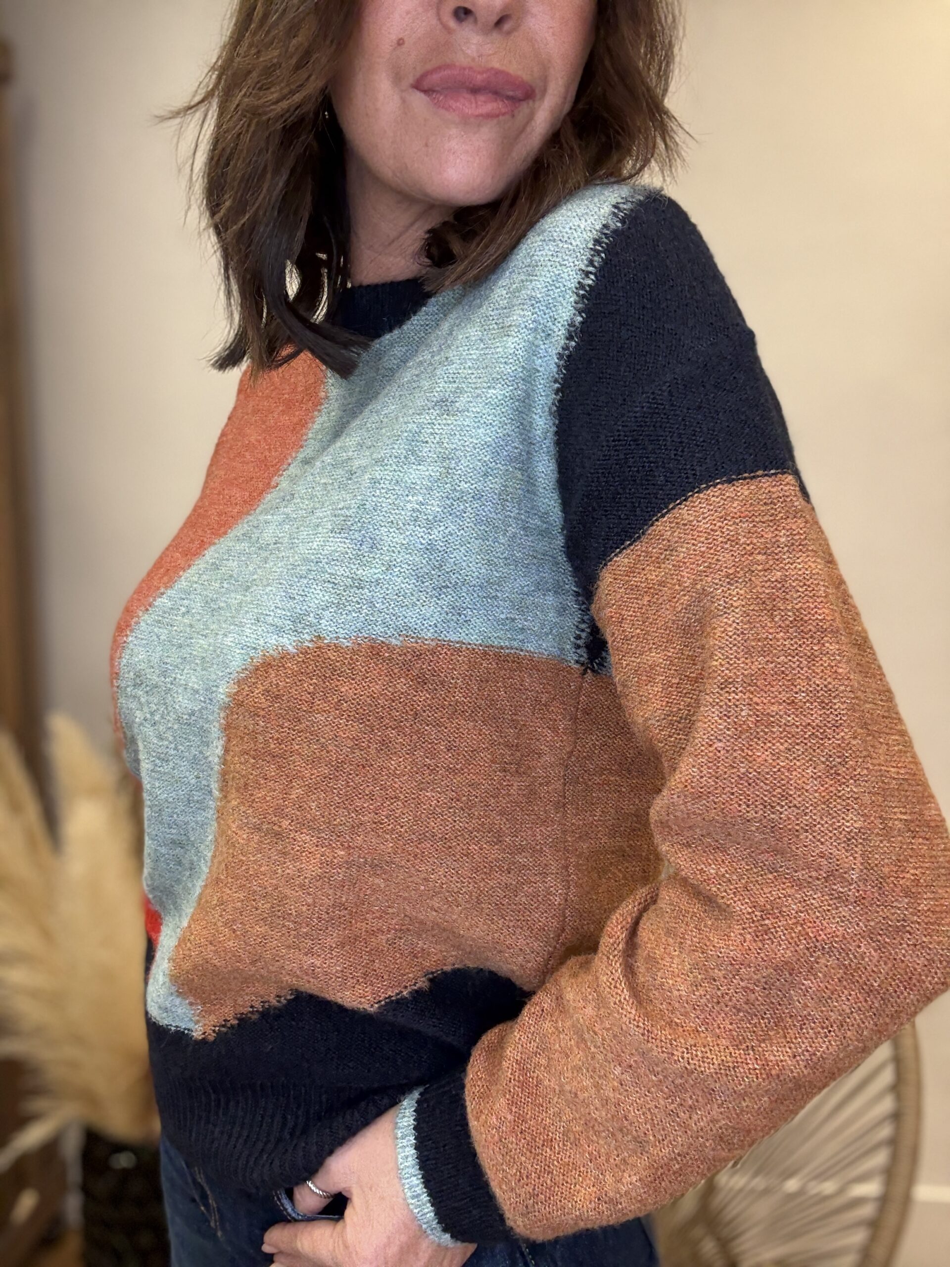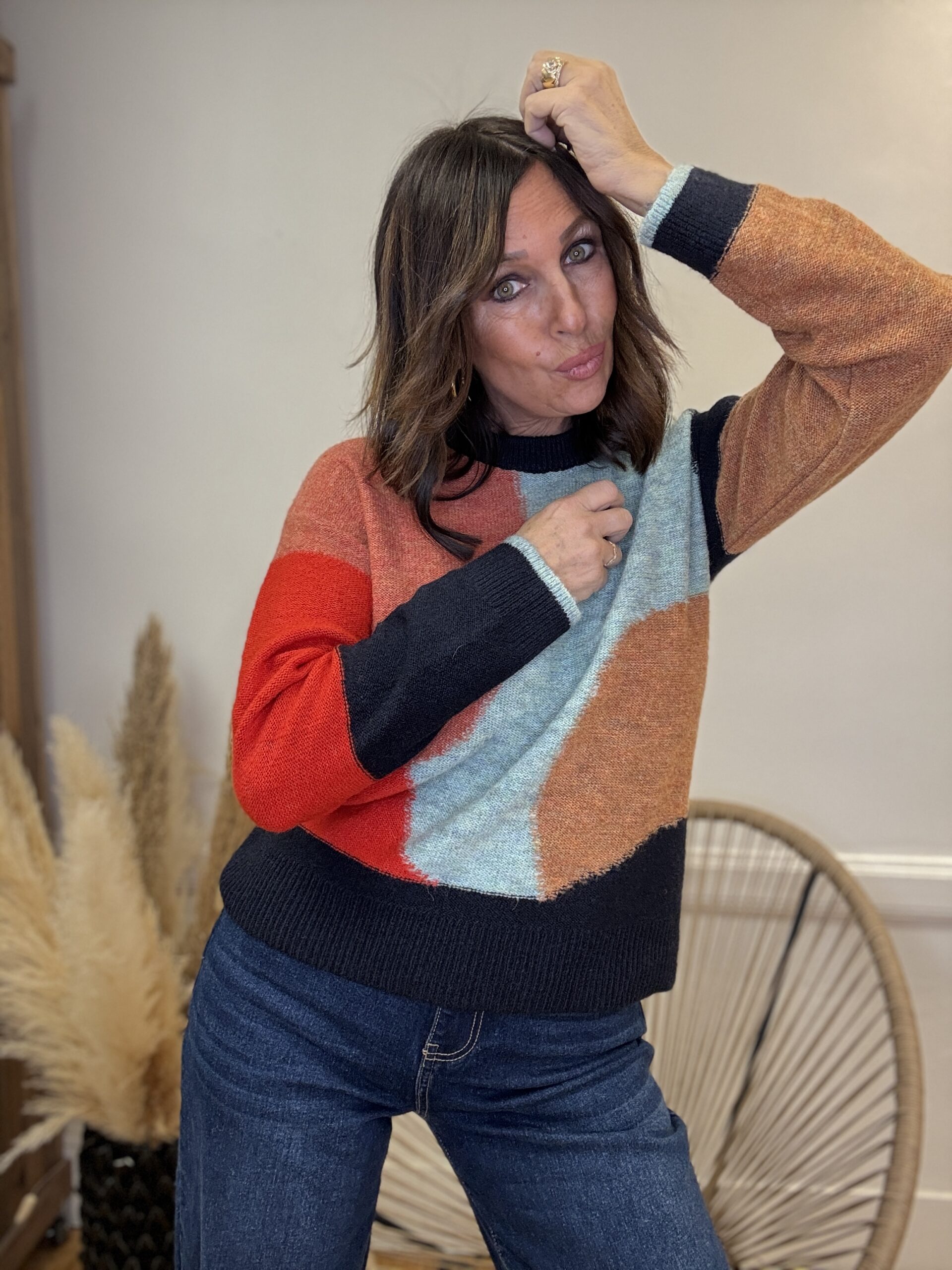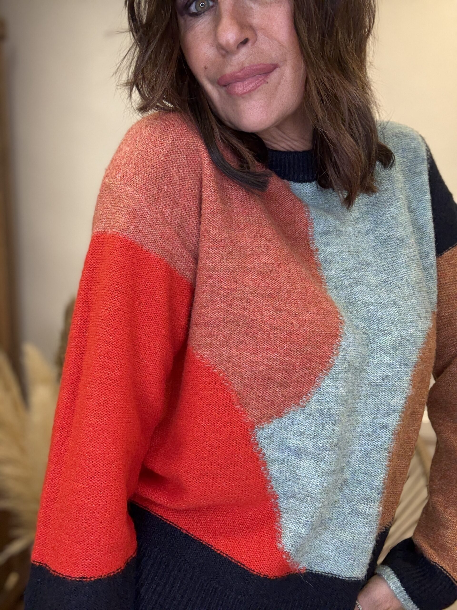 Ce pull original séduit par ses grandes zones de couleur contrastées dans des tons de chauds et modernes