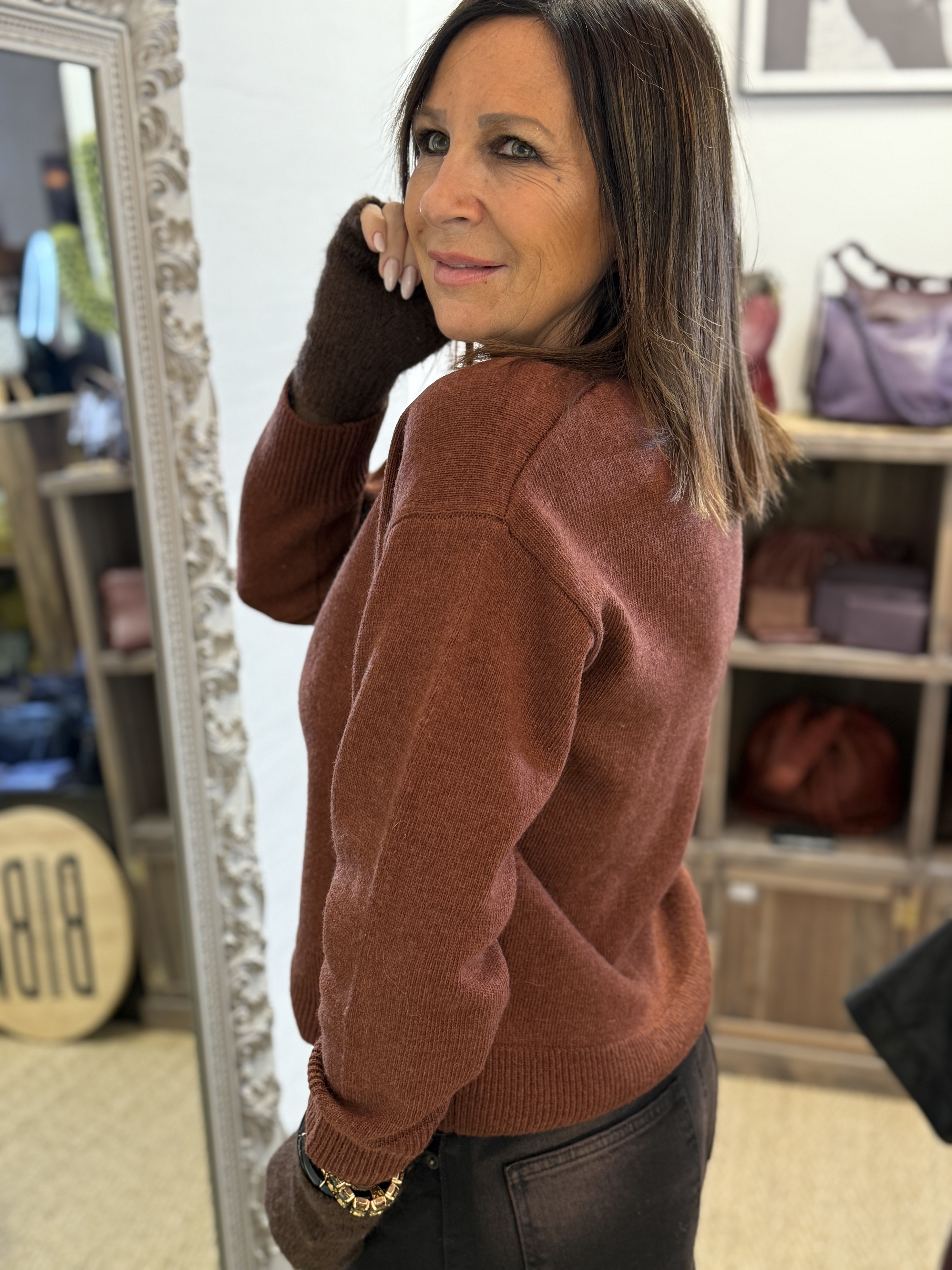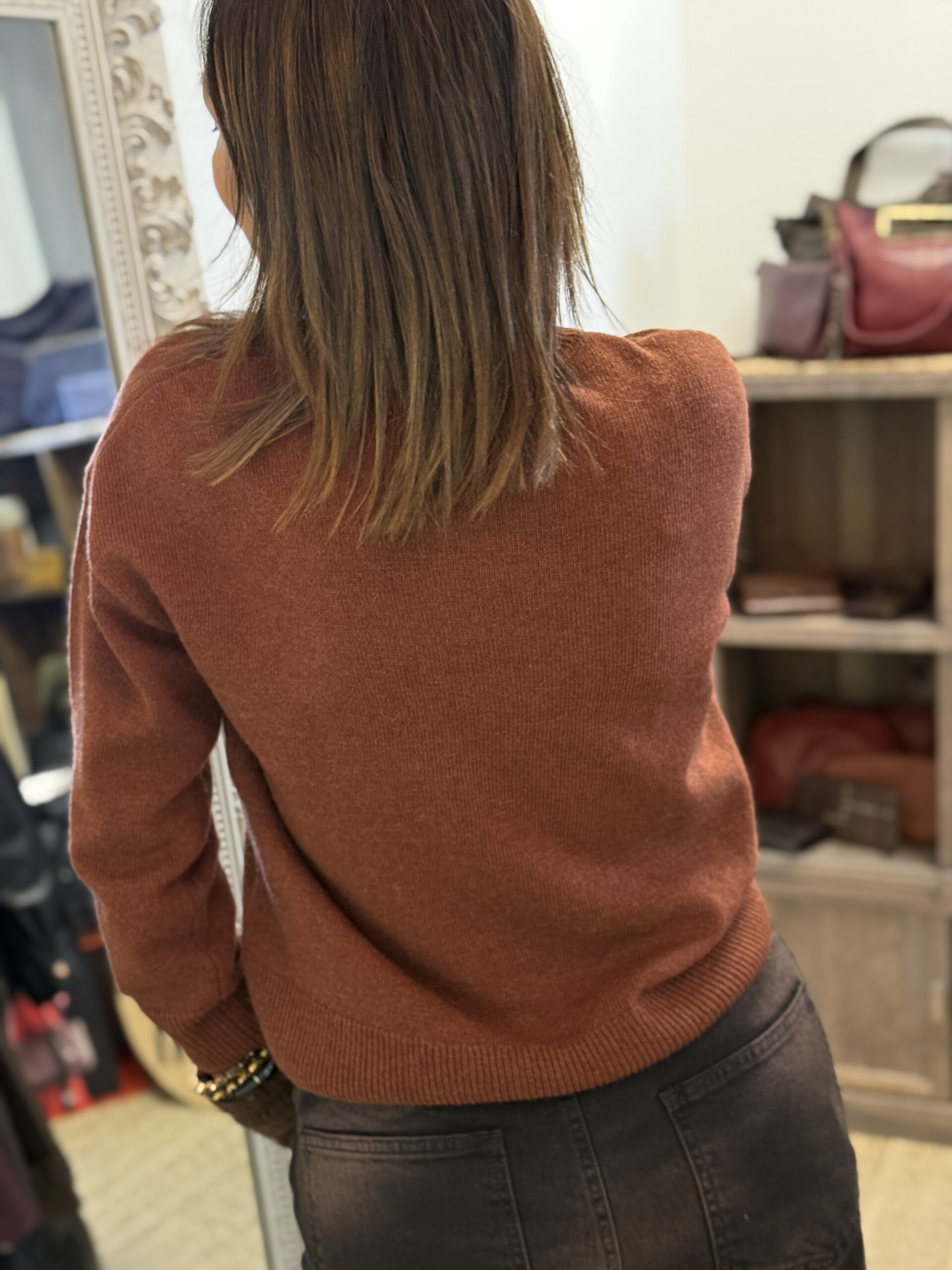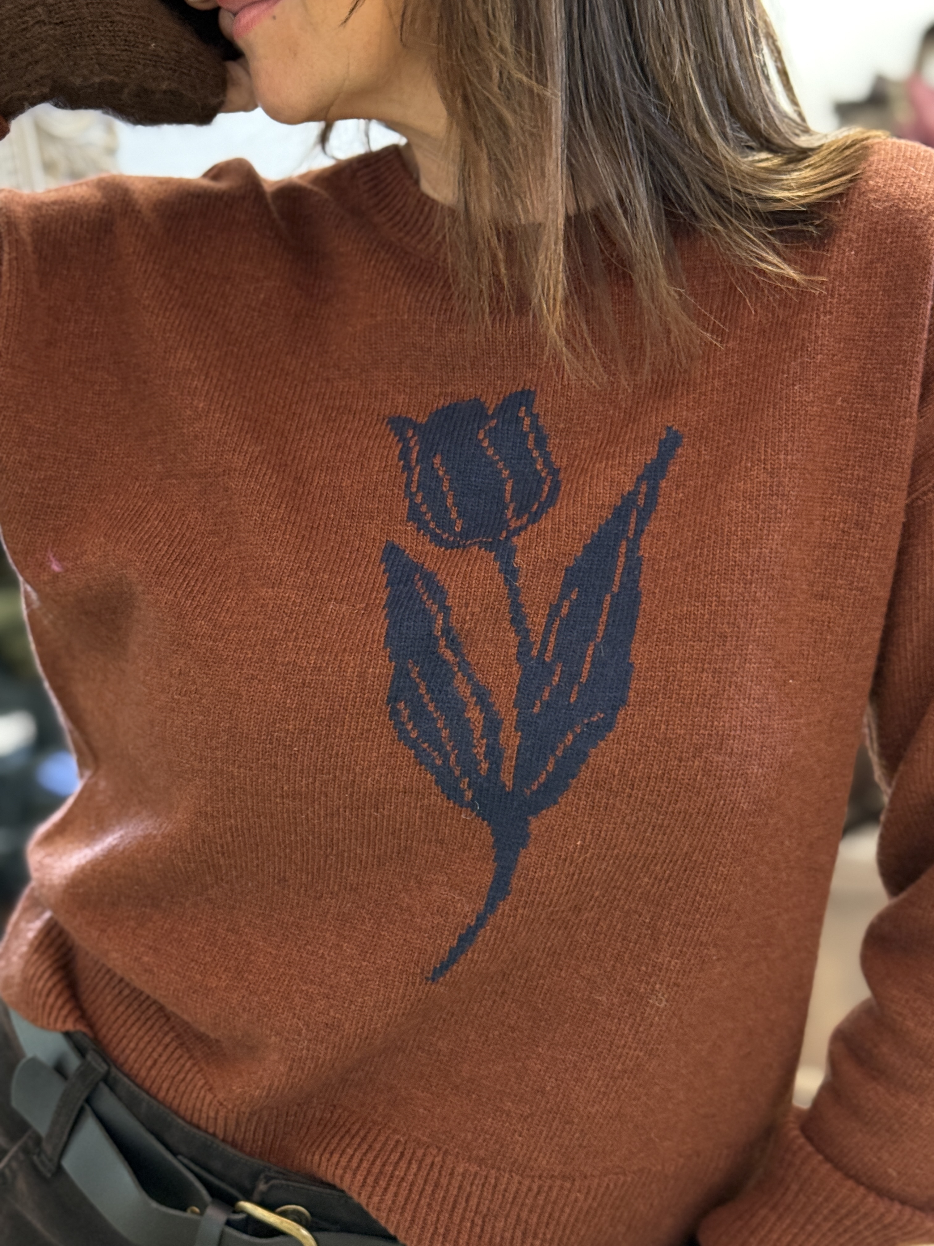 Conseil look de Nathalie : Porte ce pull rouille à motif tulipe avec une jupe longue en laine à carreaux et des bottines camel pour un look d’automne chic et chaleureux!