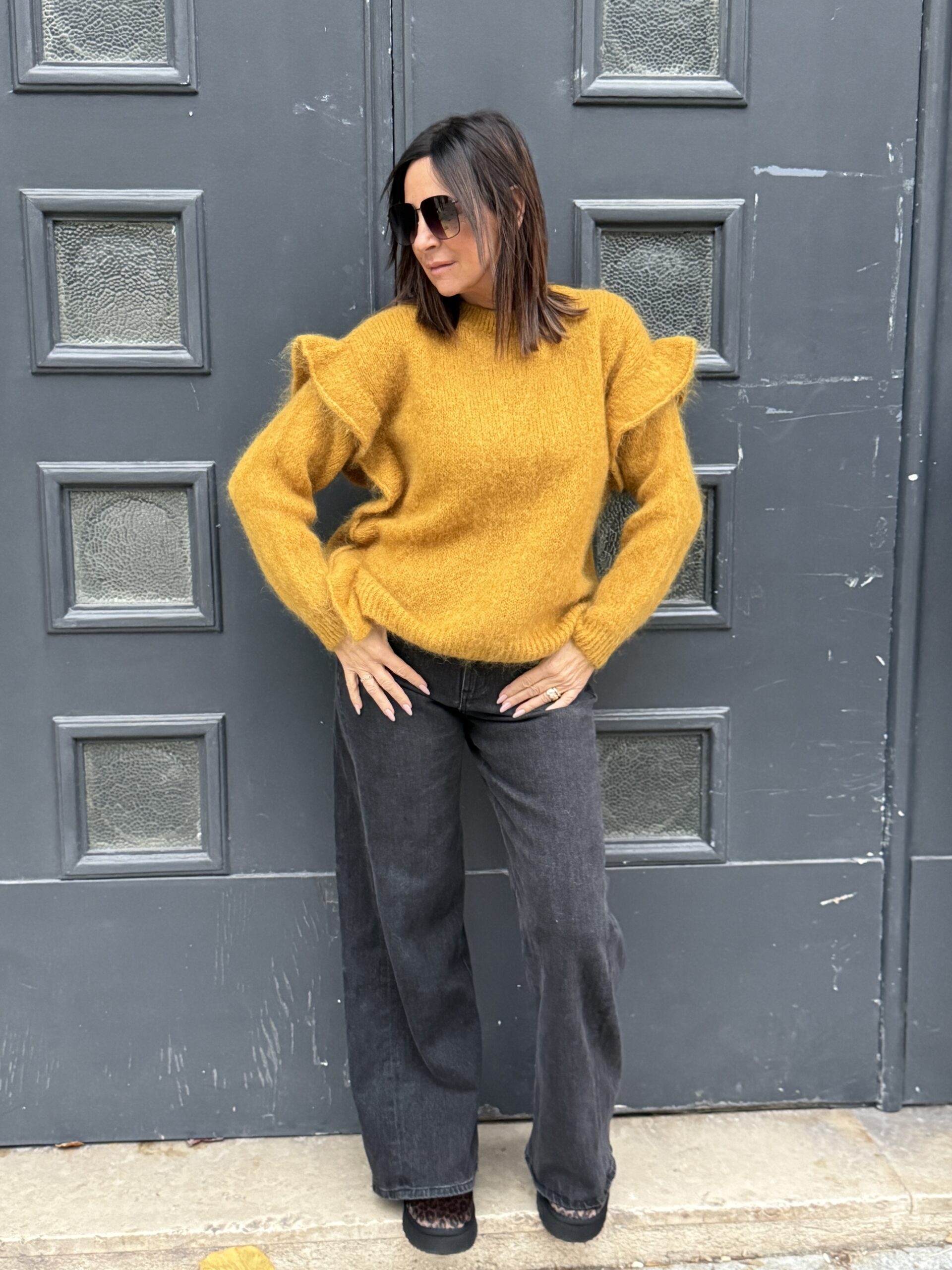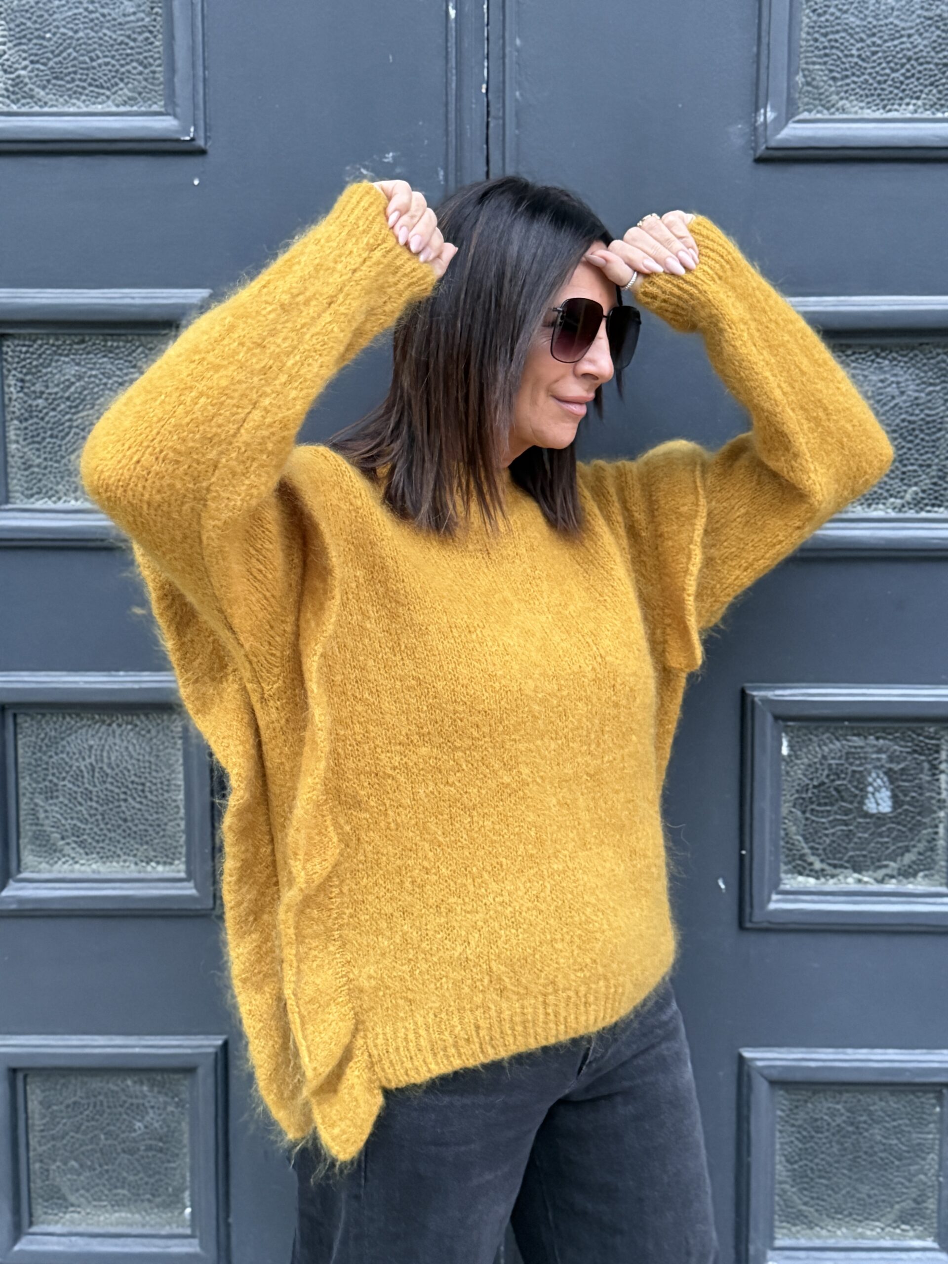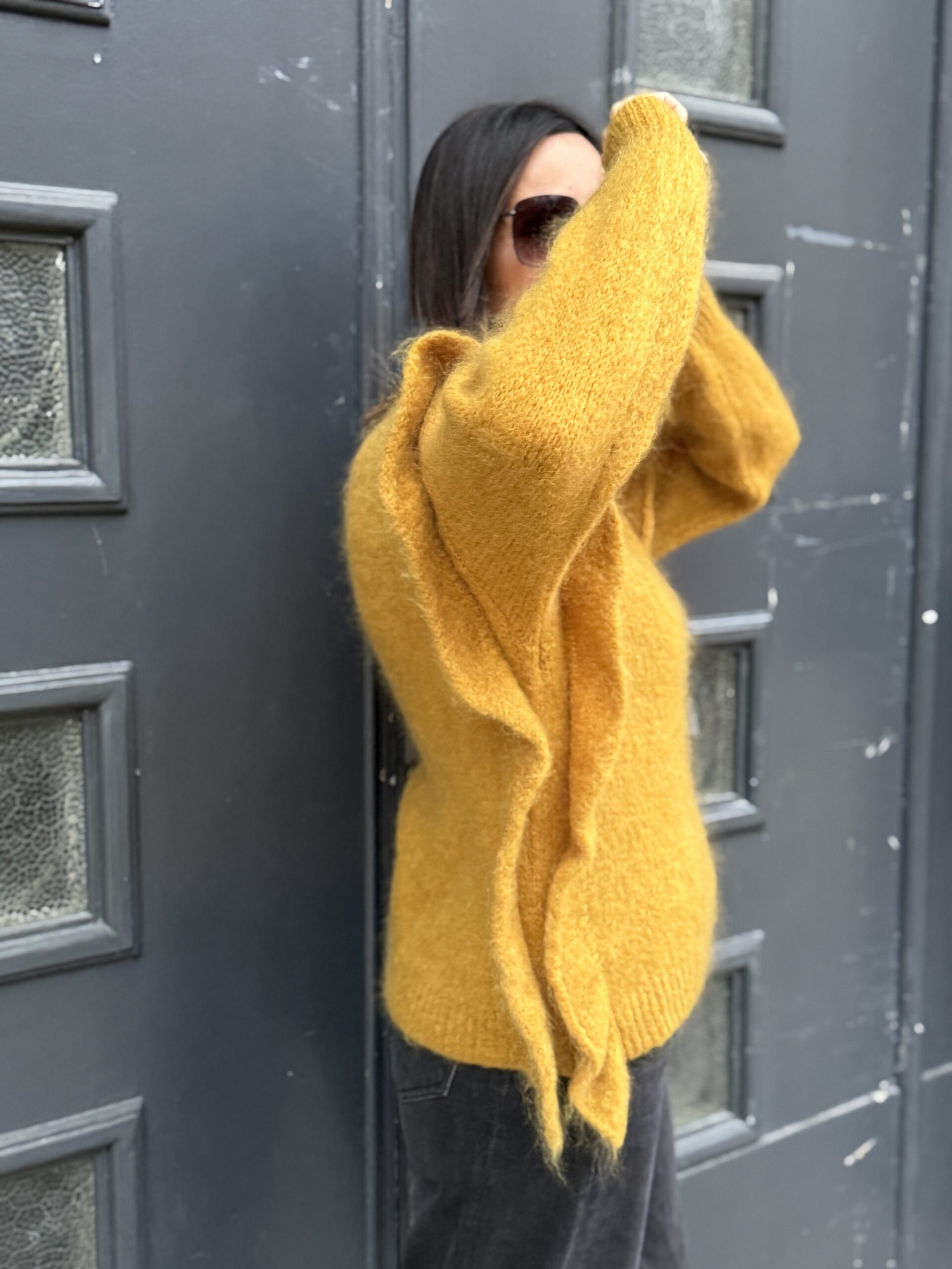 Douceur, chaleur et style, ce pull oversize en mohair moutarde est l’allié parfait des journées fraîches.