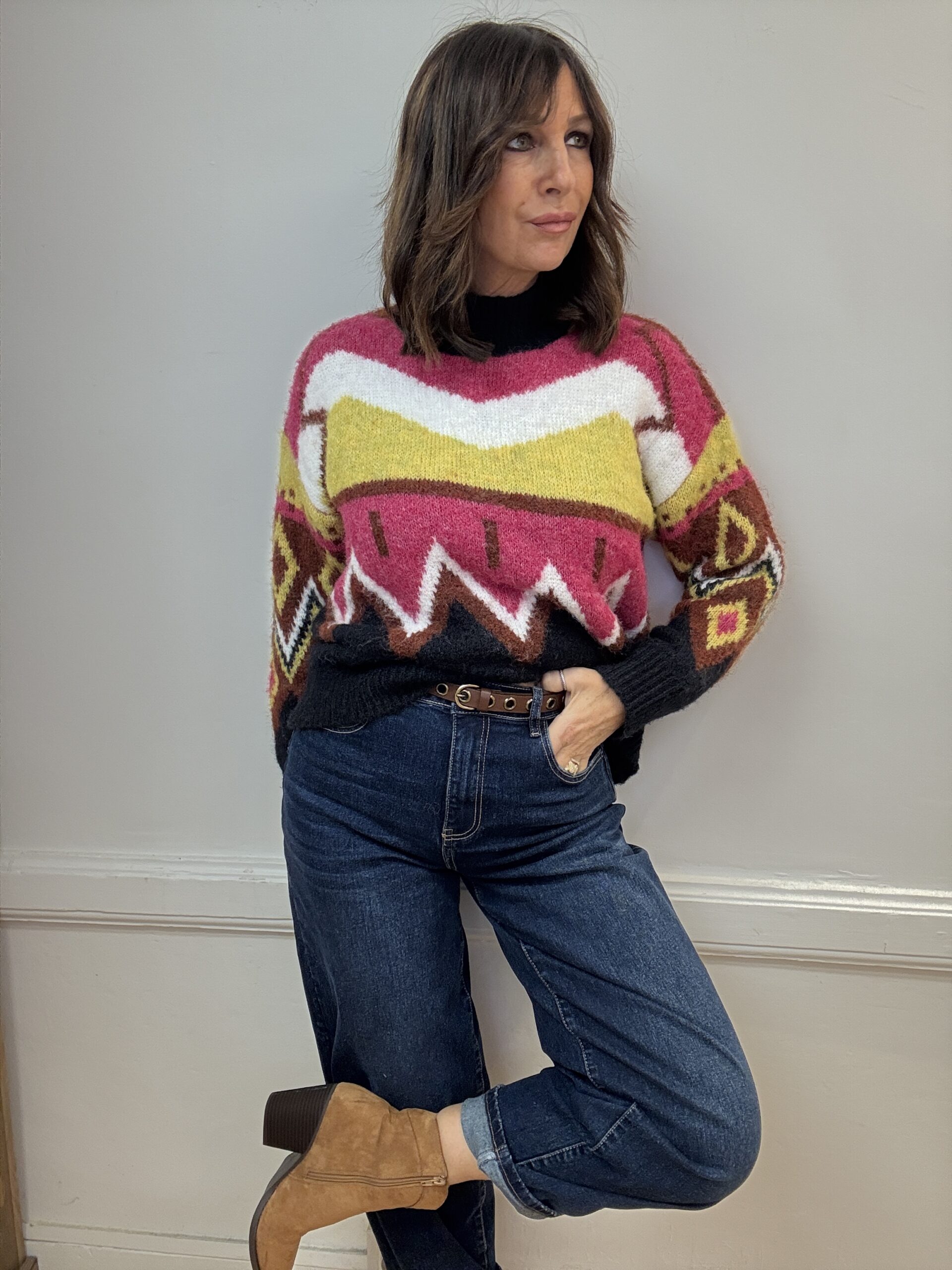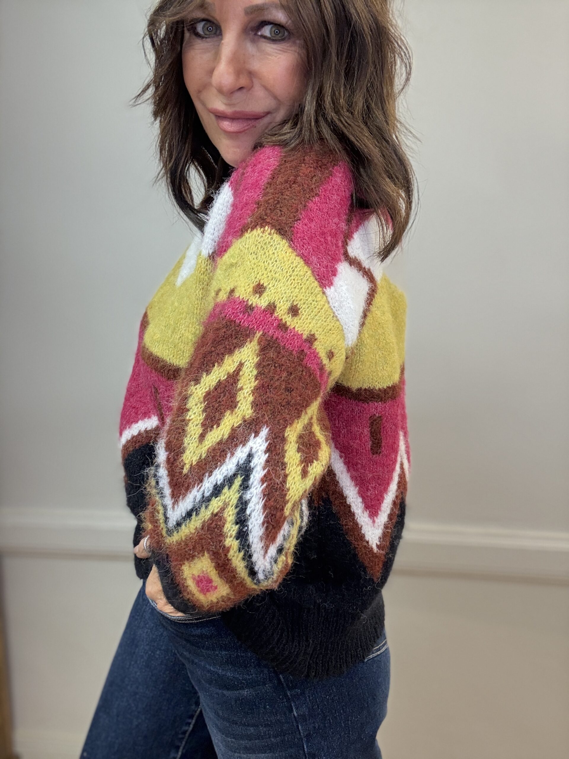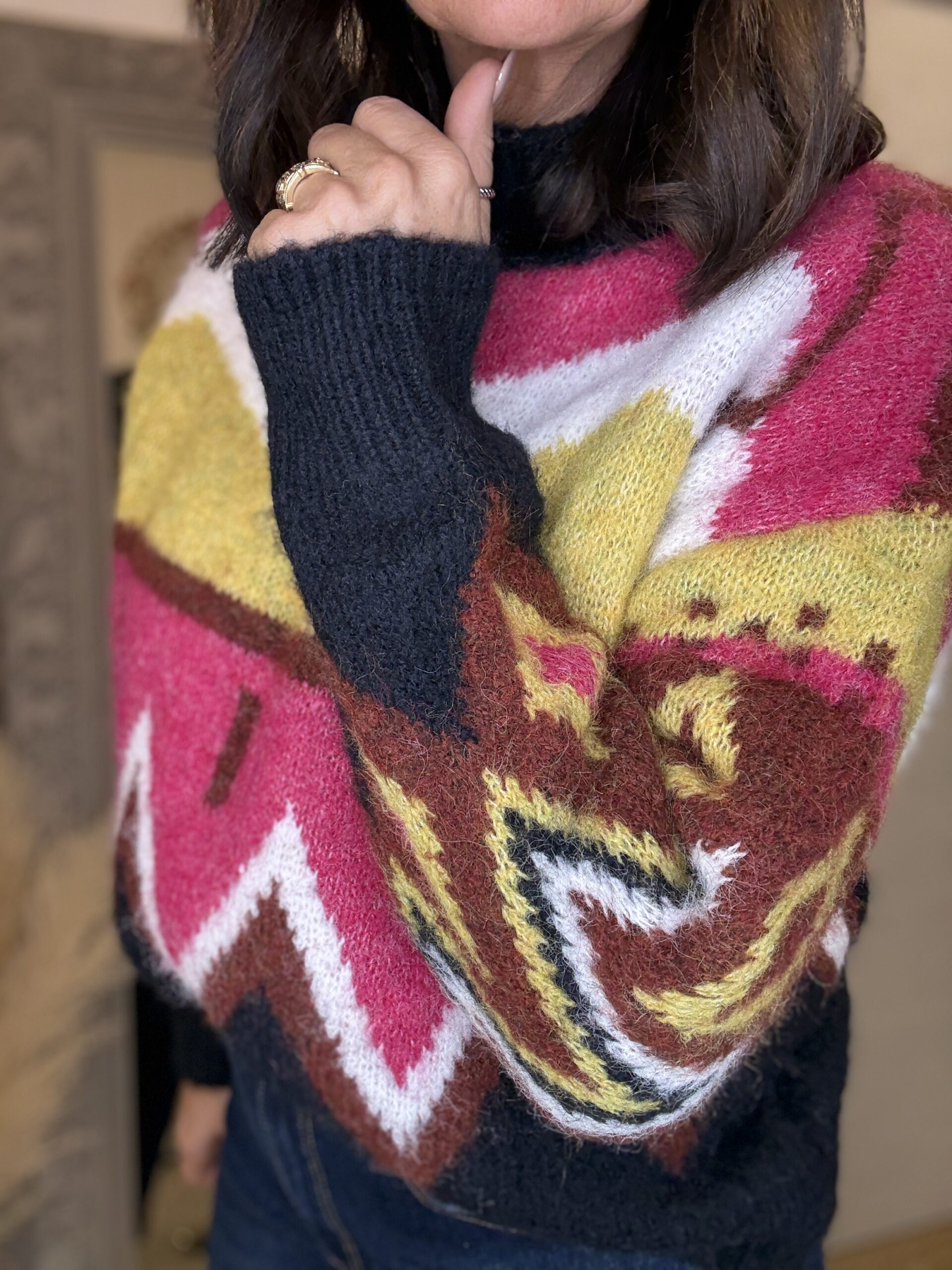 Ce pull a une vibe bohème chic mêlée à un esprit vintage 70′ grâce à ses couleurs vives et motifs graphiques