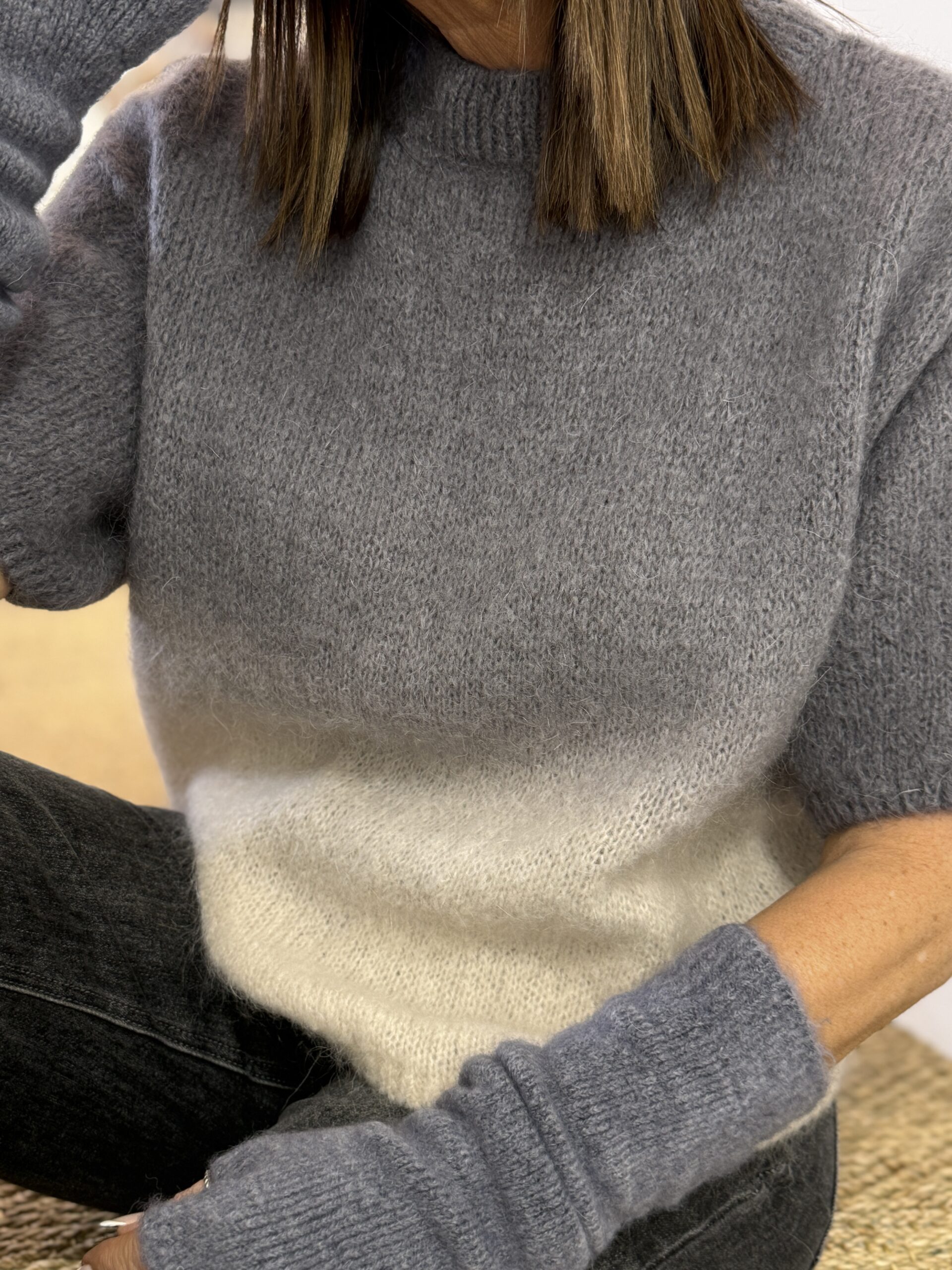 Ce pull à manches courtes au dégradé gris & écru offre un look à la fois cosy et moderne, parfait pour affronter la saison froide avec style !