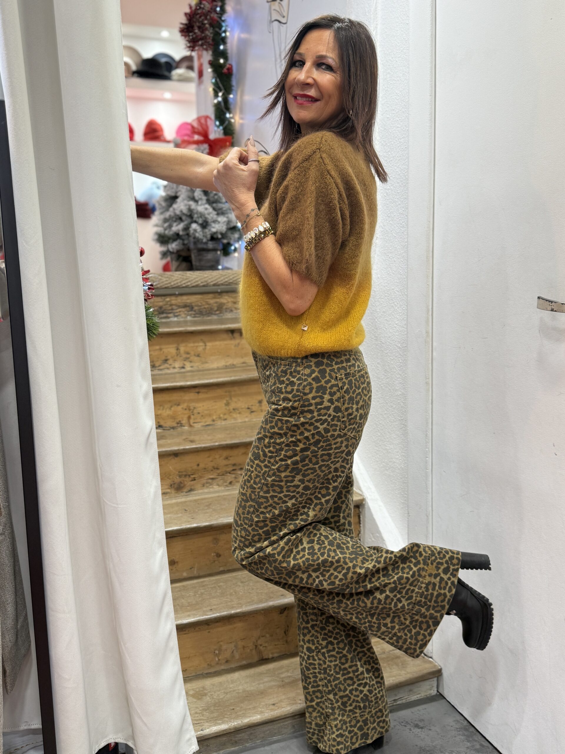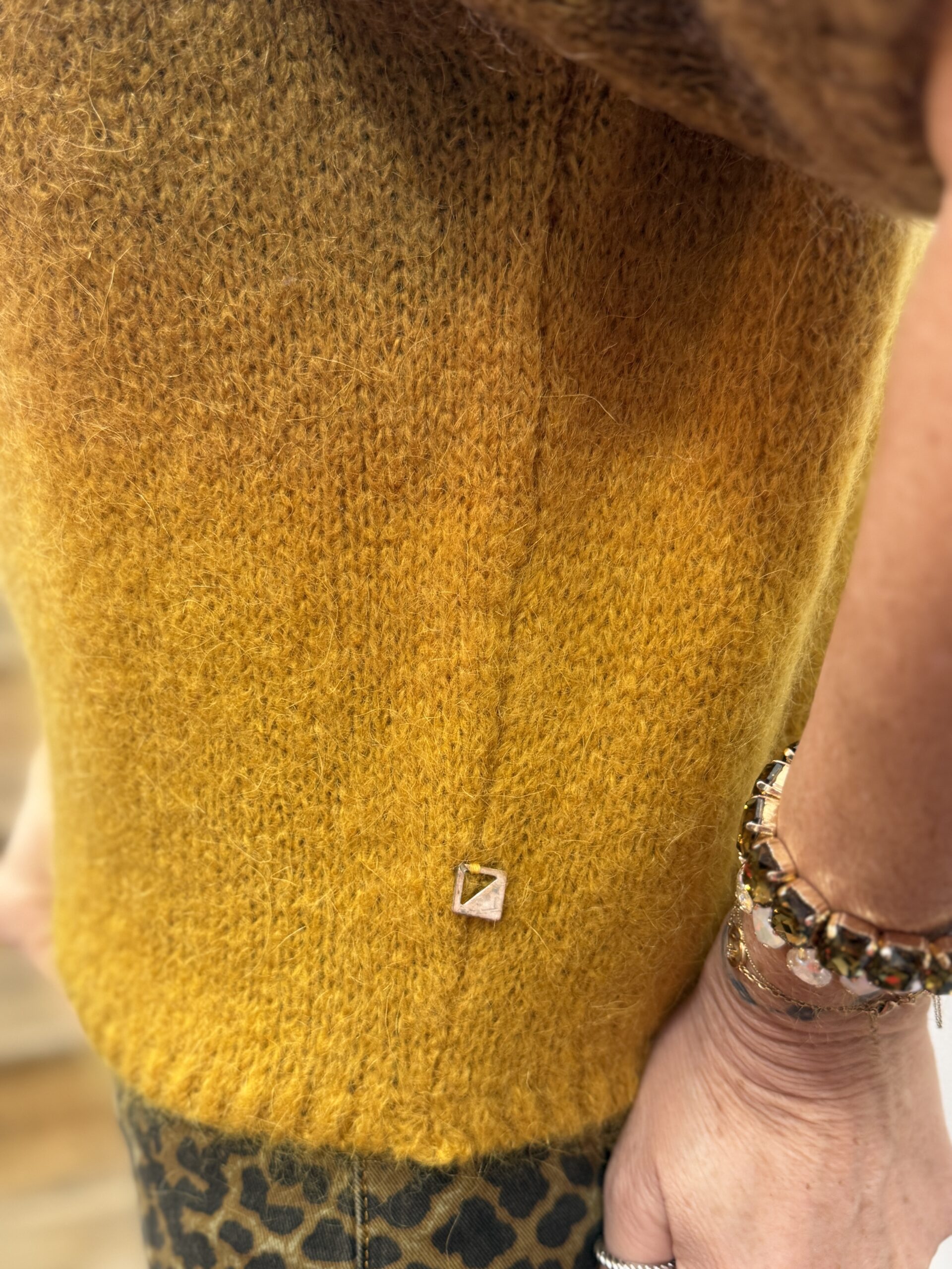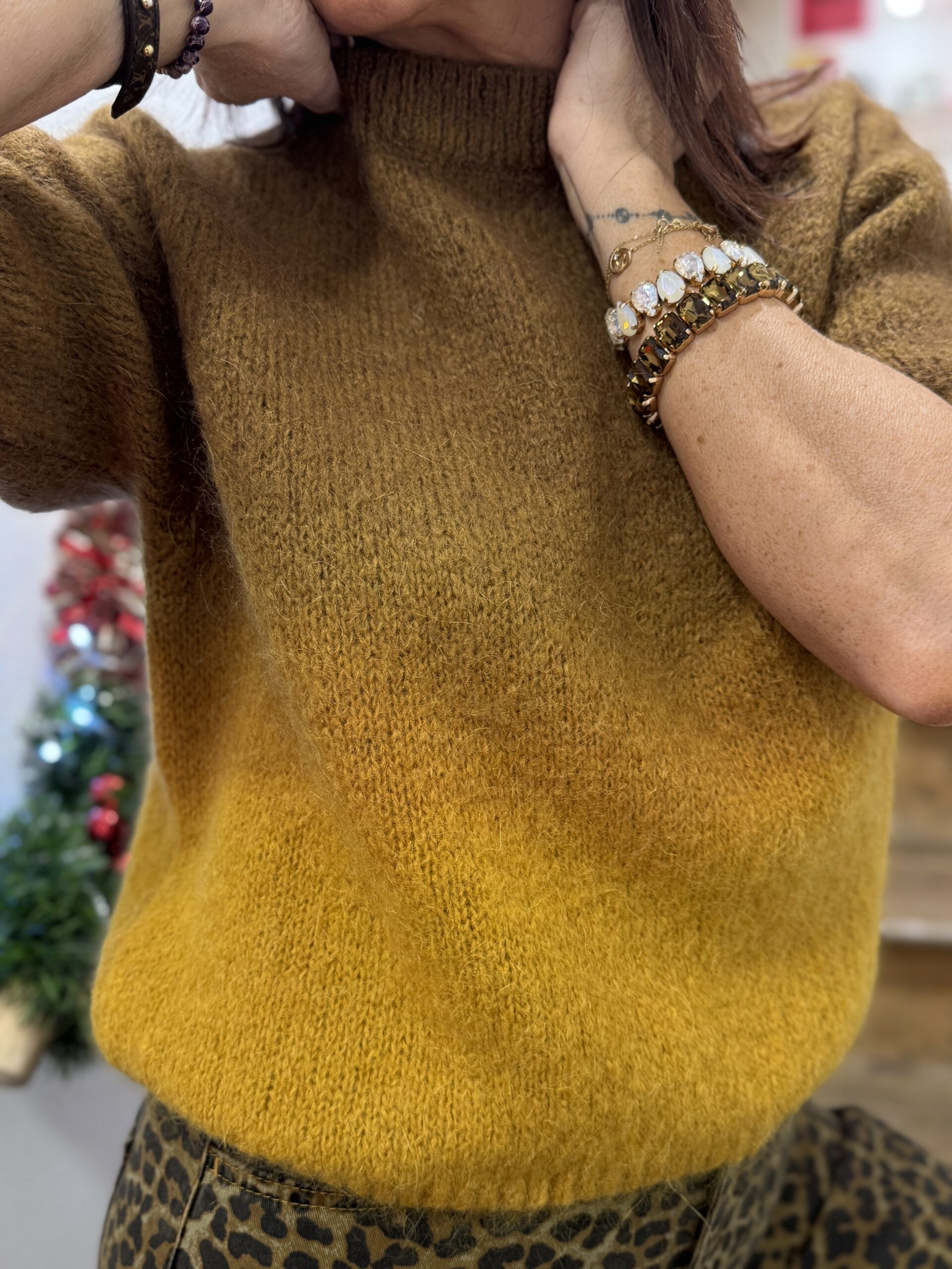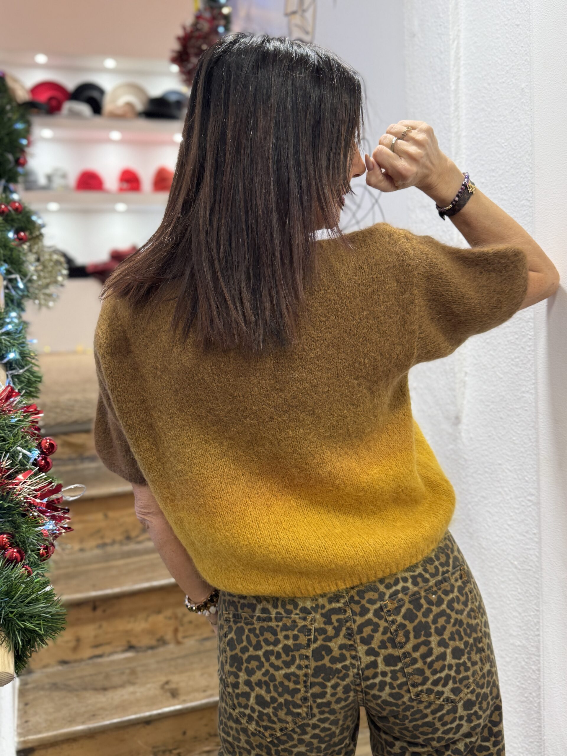 Ce pull à manches courtes au dégradé moutarde et camel offre un look à la fois cosy et moderne, parfait pour affronter la saison froide avec style !