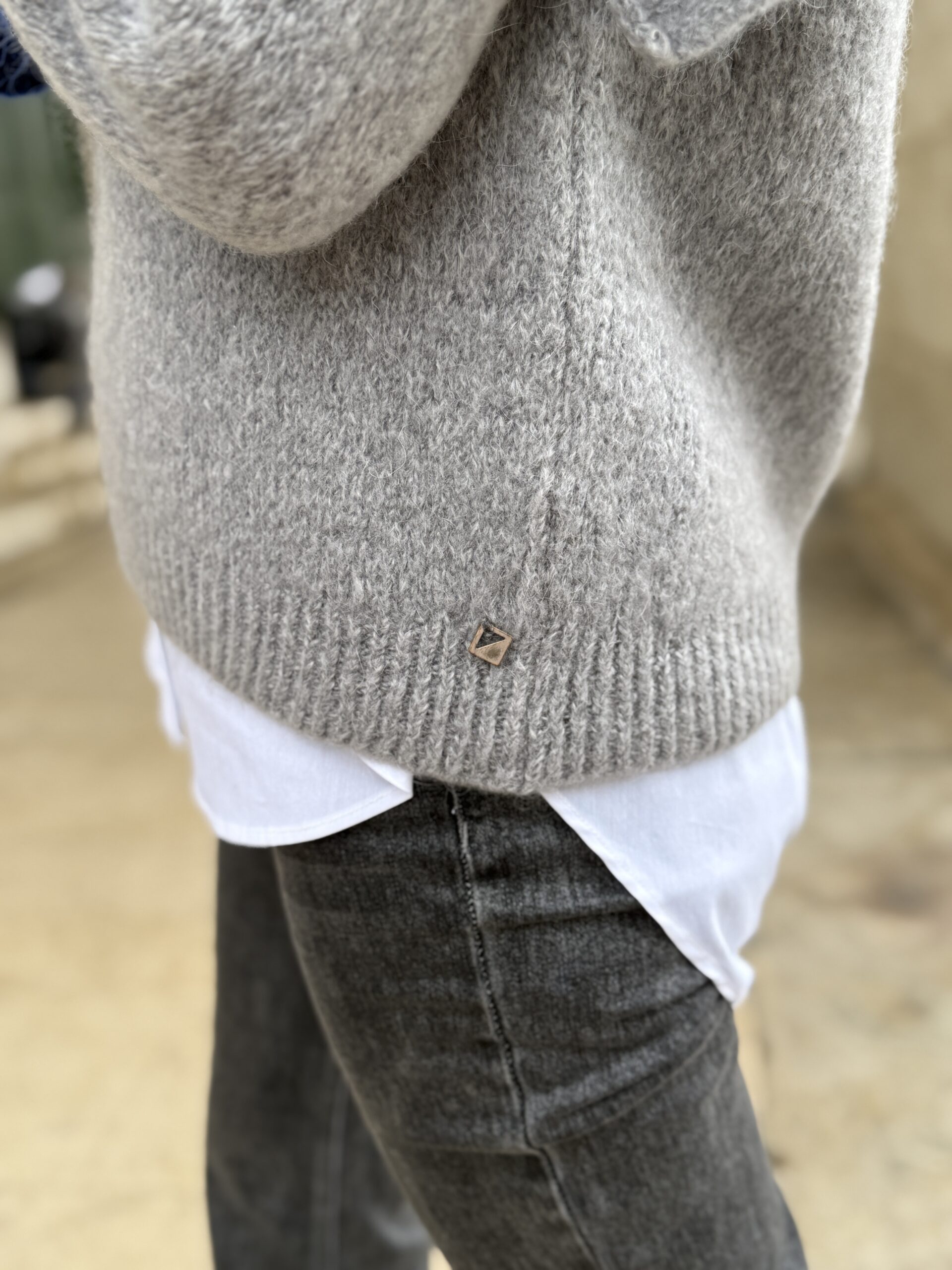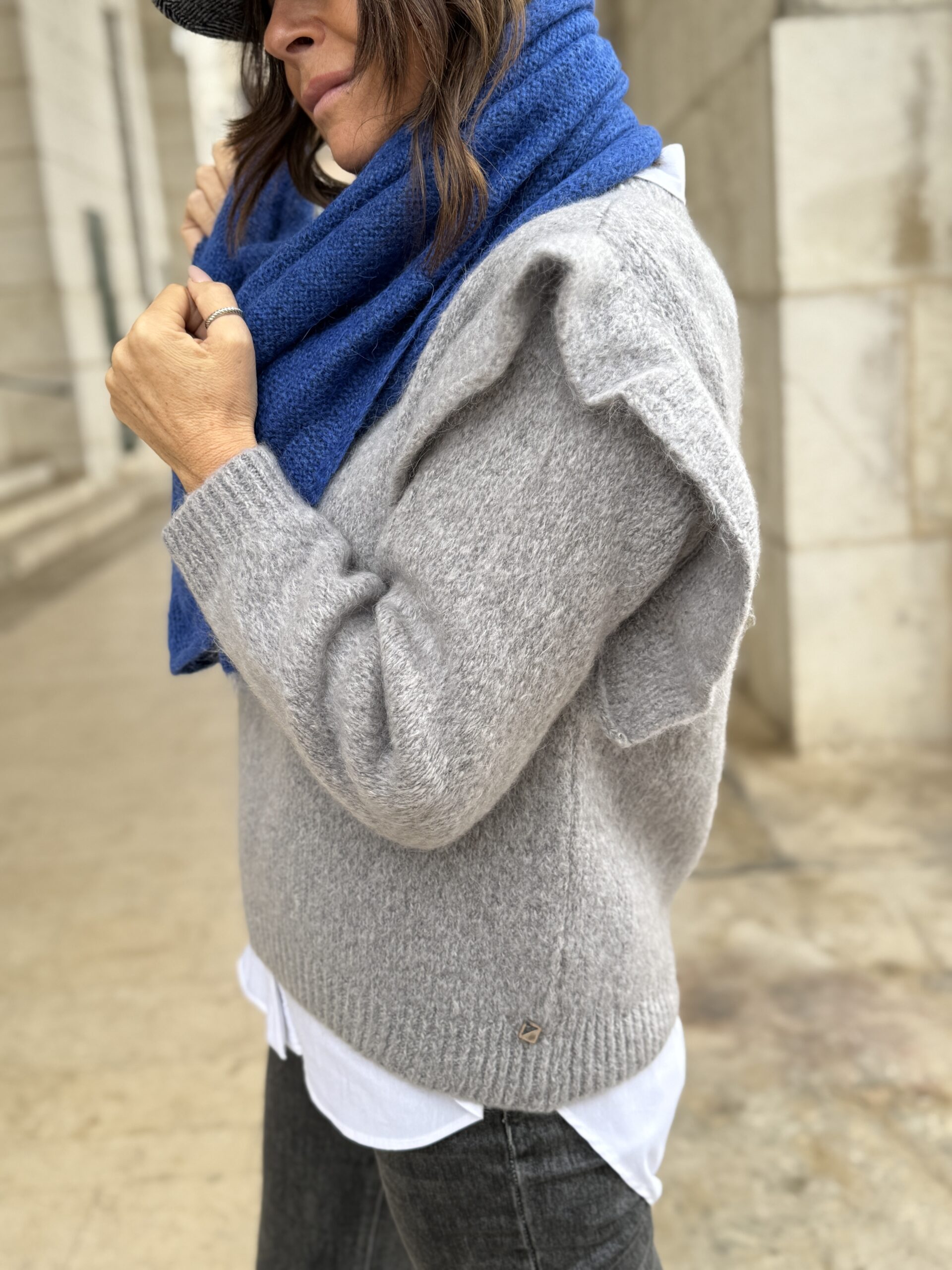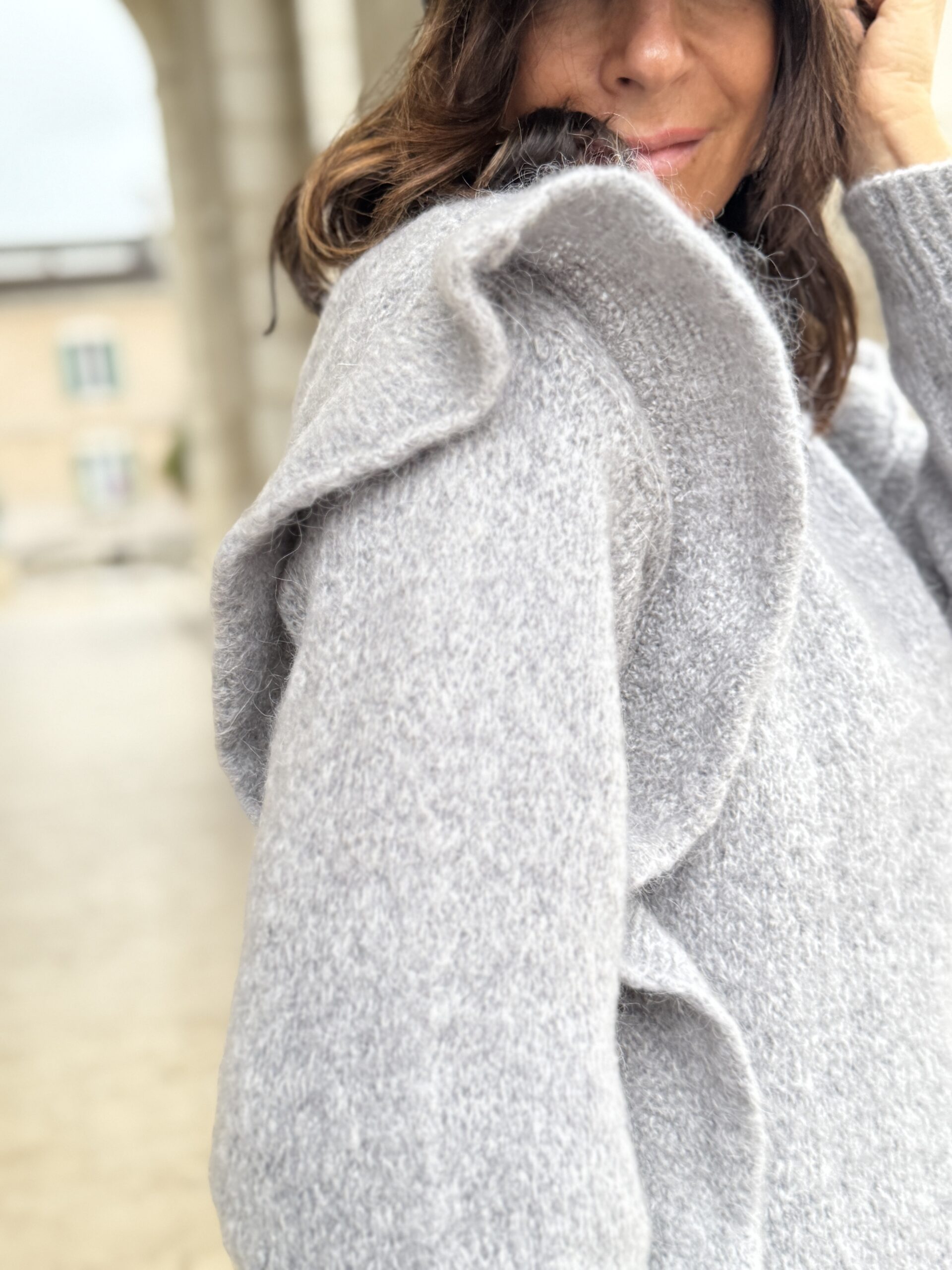 Conseil look de Nathalie : Associez ce pull gris à volant avec une petite chemise claire en dessous qui feras ressortir la couleurs, un jeans ou pantalon bien ajusté pour un look chic et effortless.