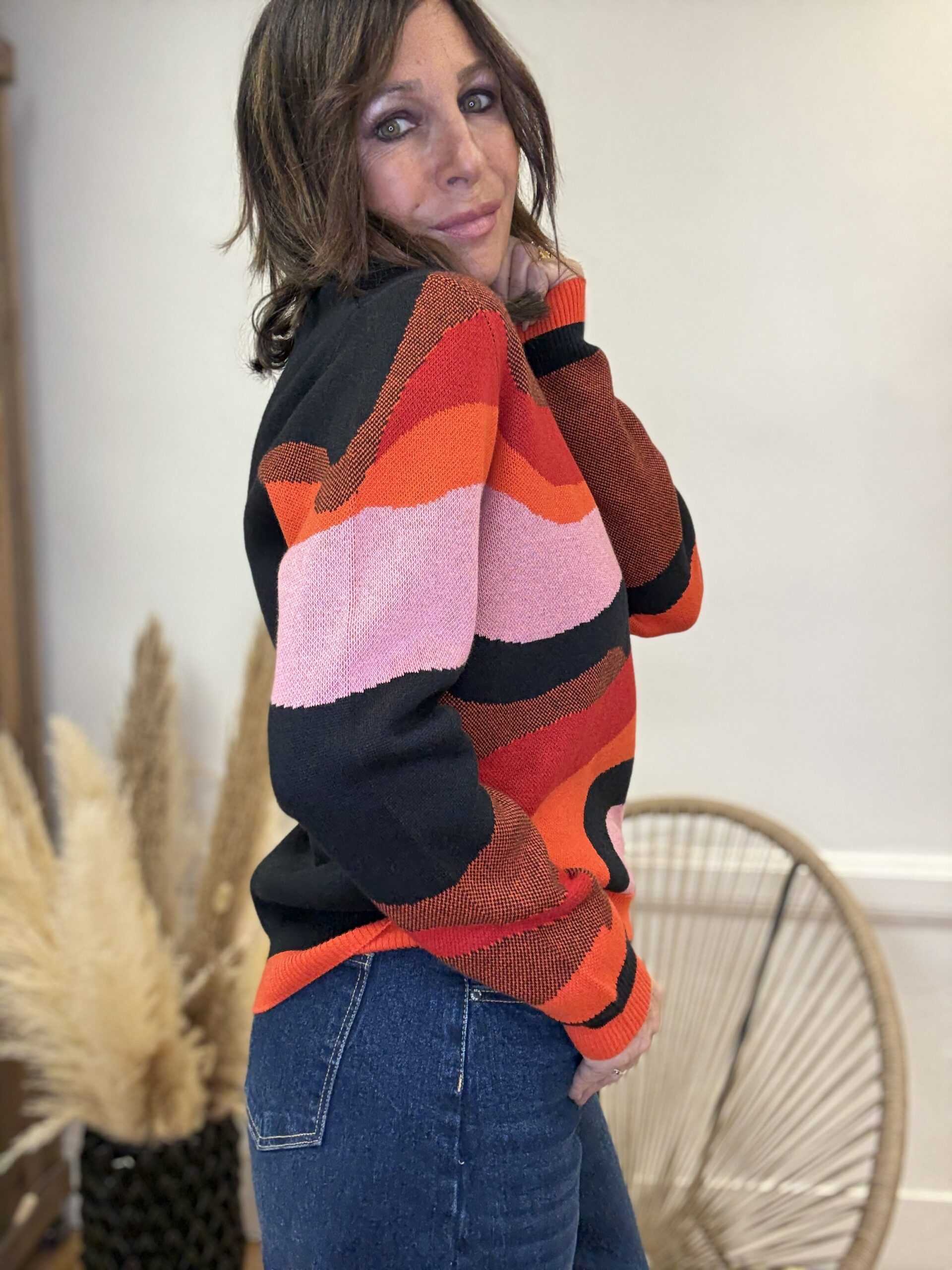 Ce pull original séduit par ses grandes zones de couleur contrastées dans des tons de chauds et modernes