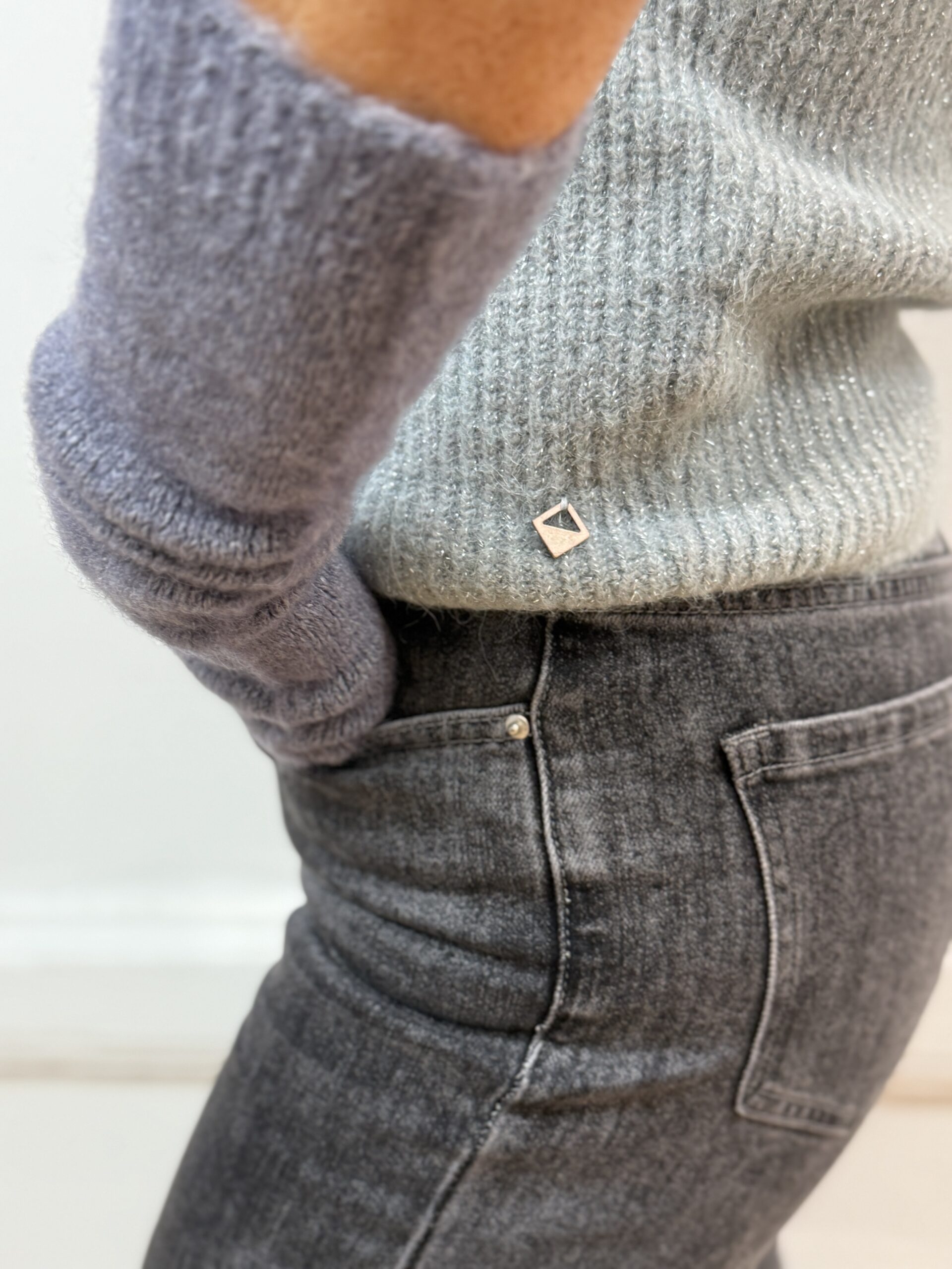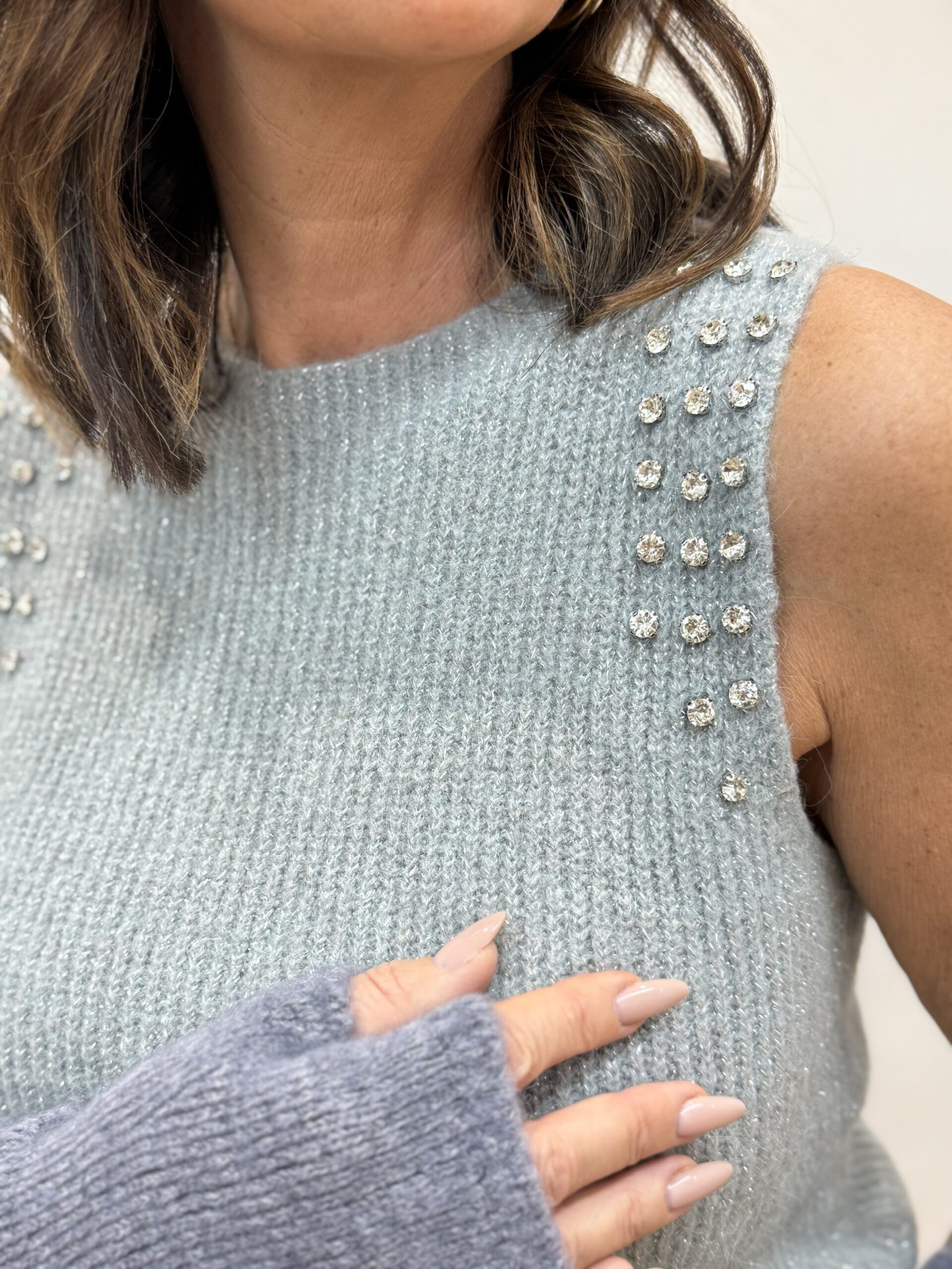 Ce pull sans manches en maille gris bleuté allie élégance et confort, les strass brodés sur l’épaule ajoutent une une touche féminine et sophistiqué.