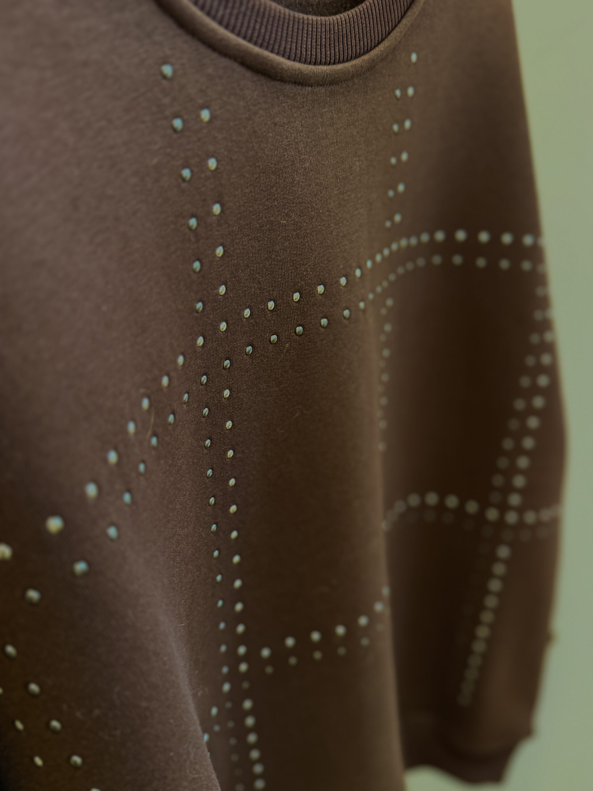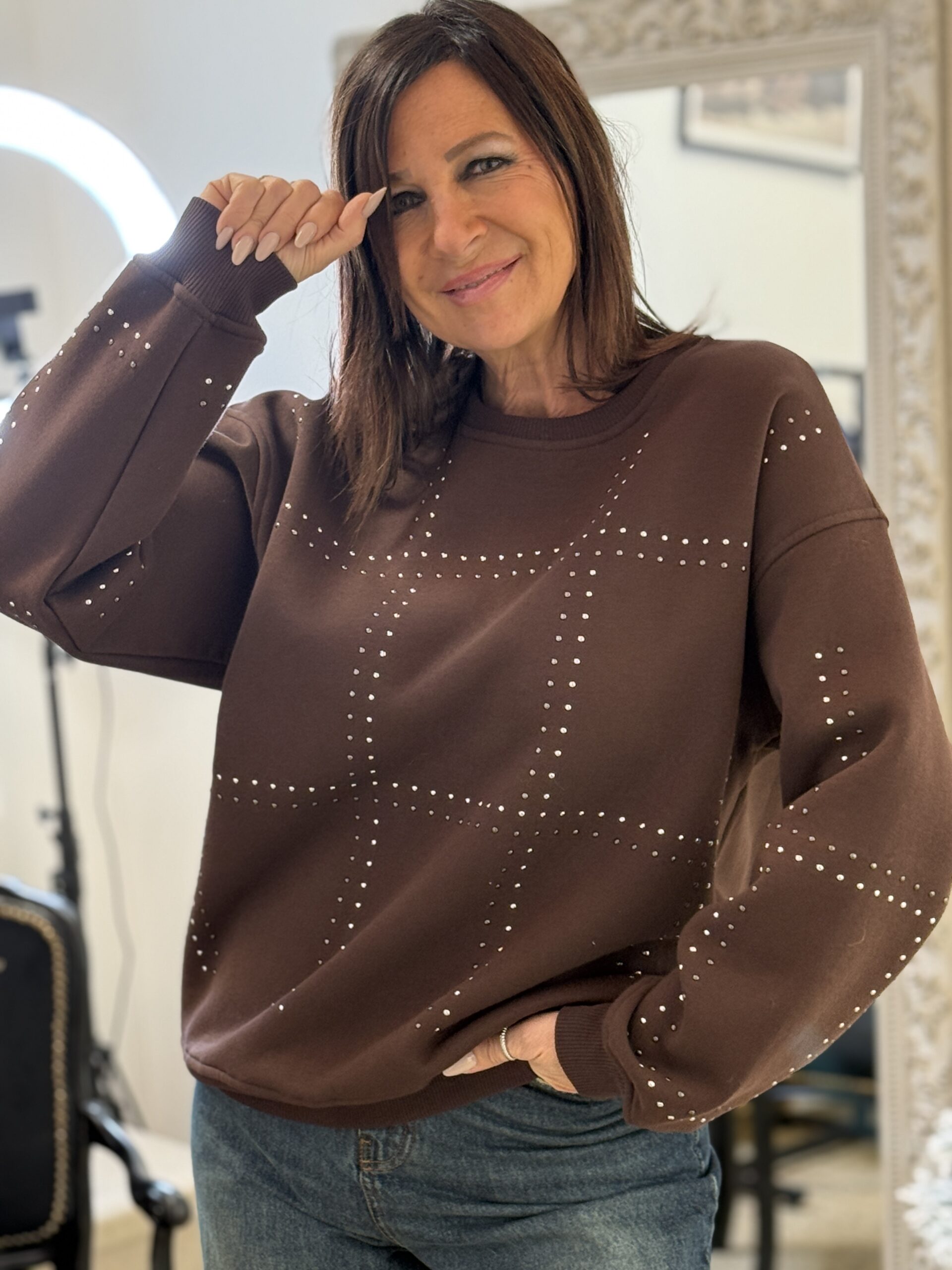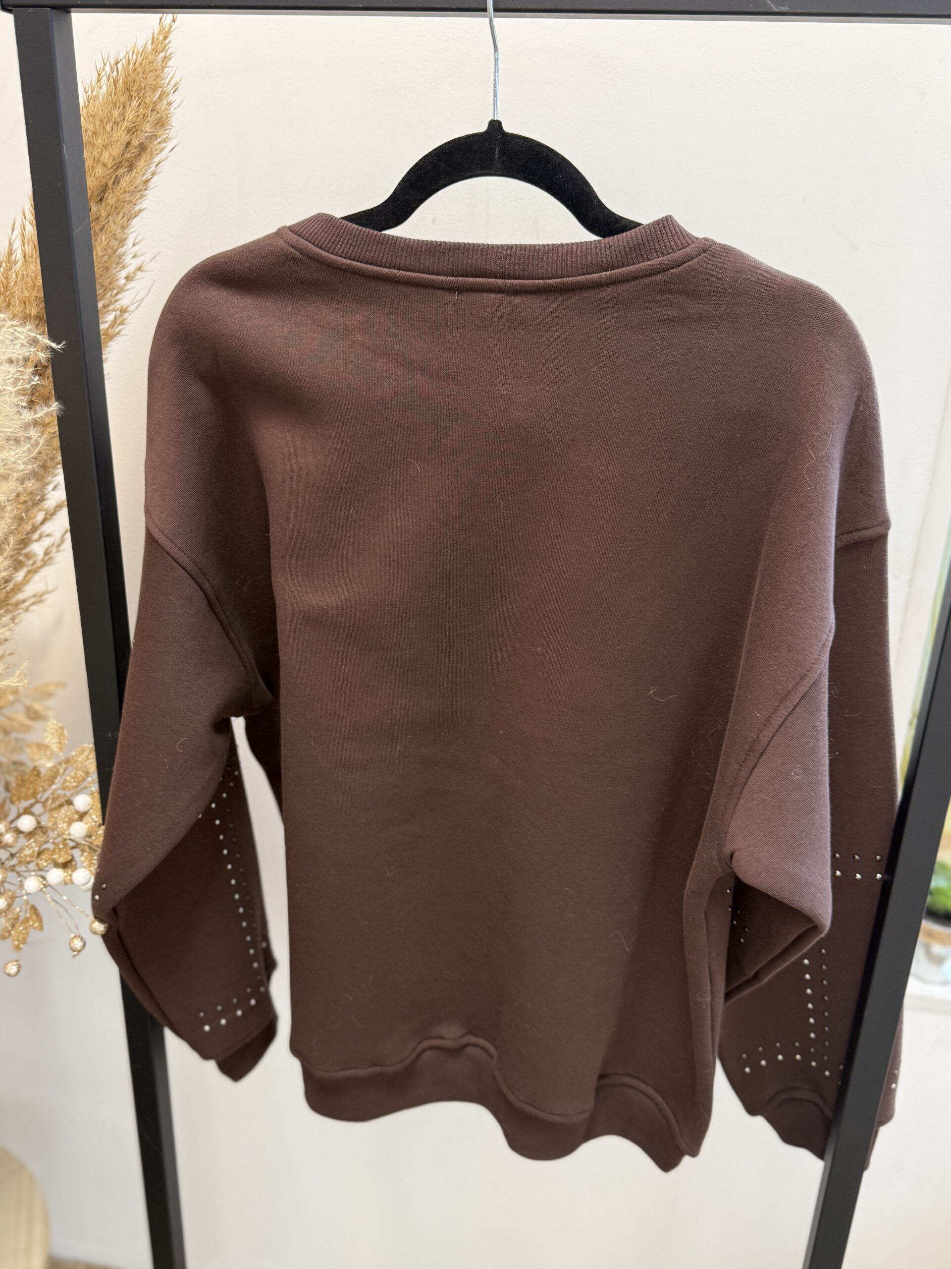 Sweat à manches longues marron ,orné de lignes ondulées en strass pour une touche lumineuse et élégante !