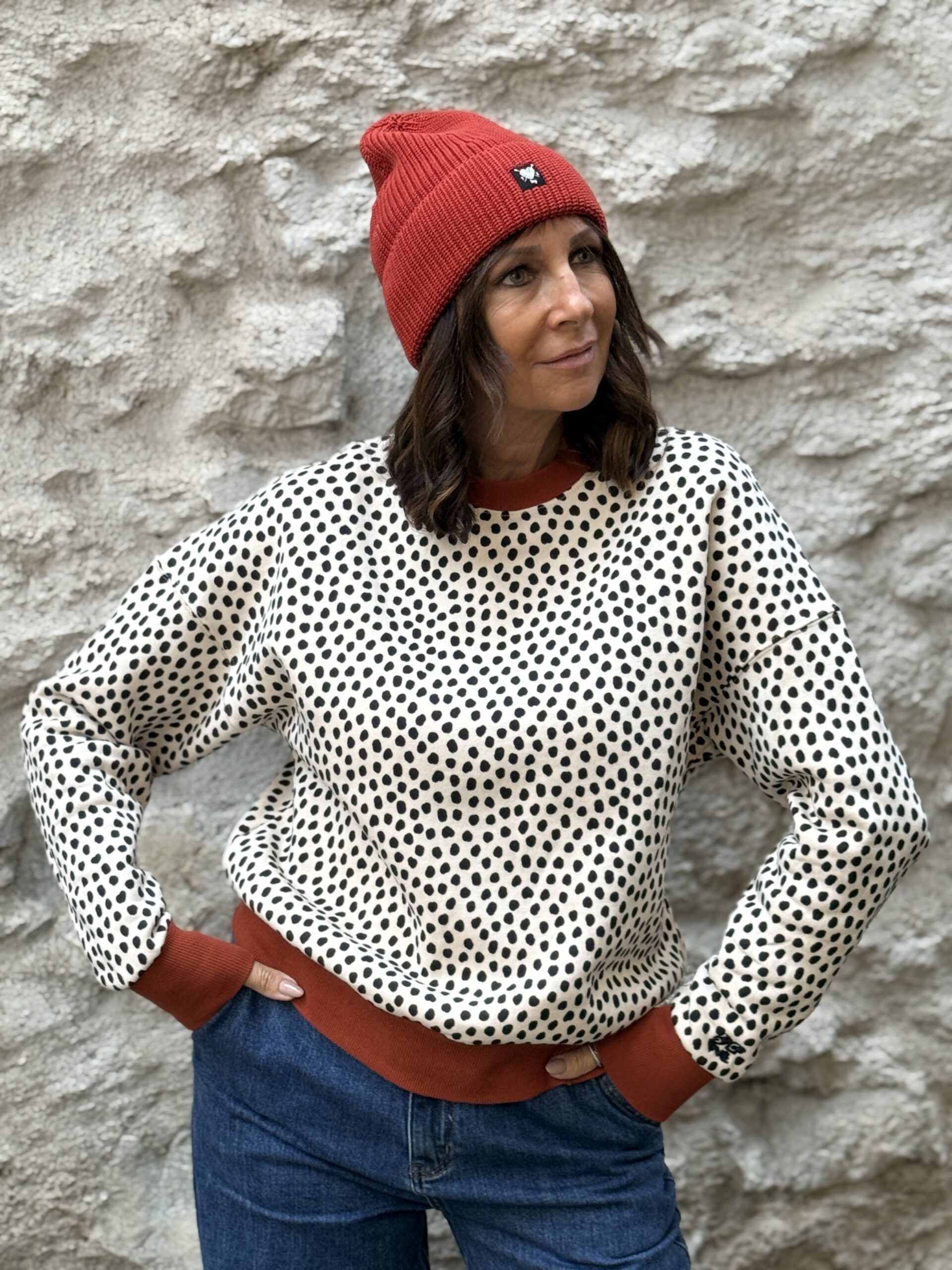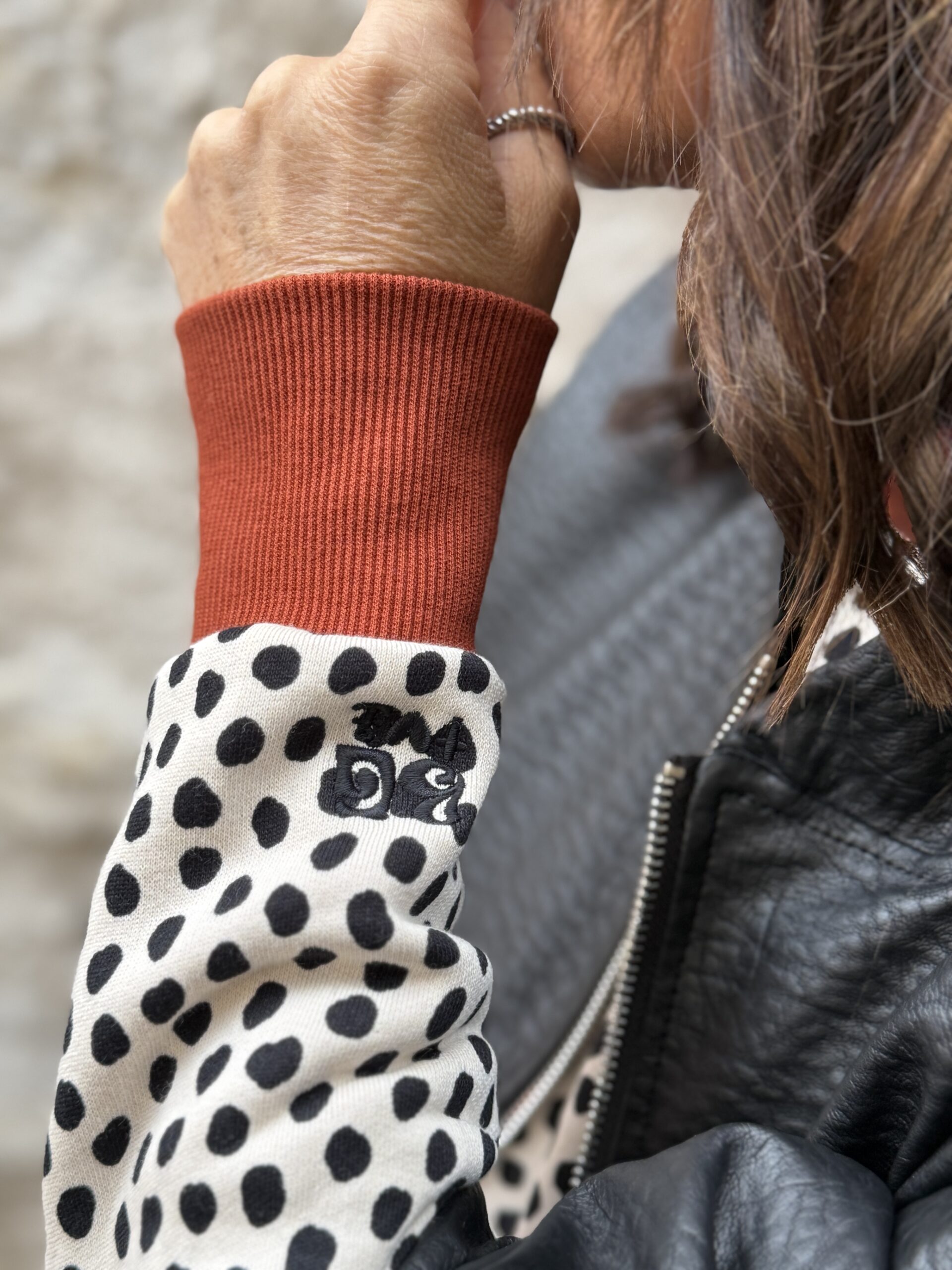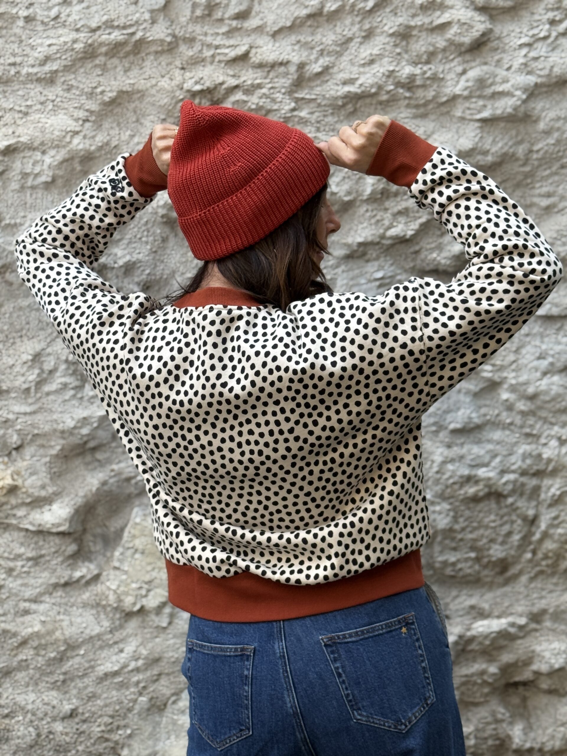 Ce pull original séduit par ses grandes zones de couleur contrastées dans des tons de chauds et modernes