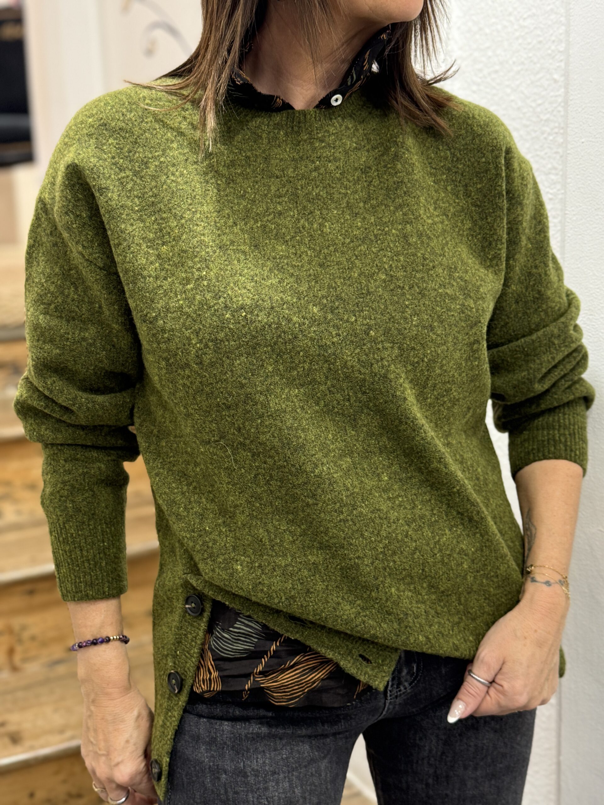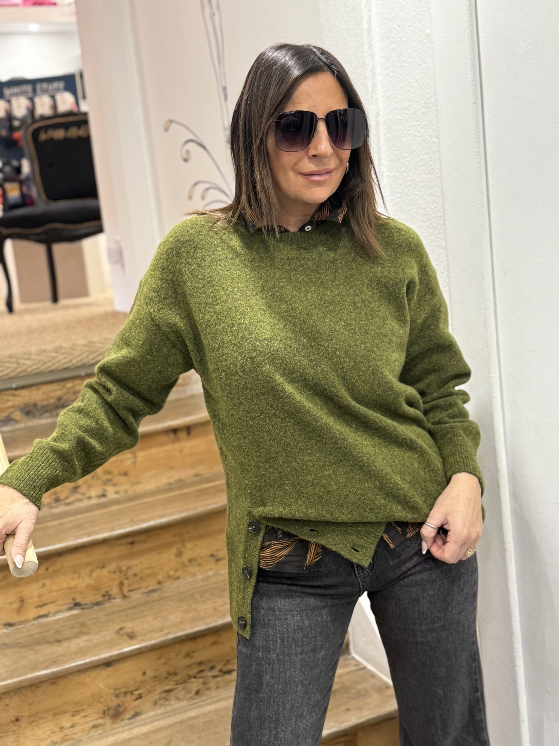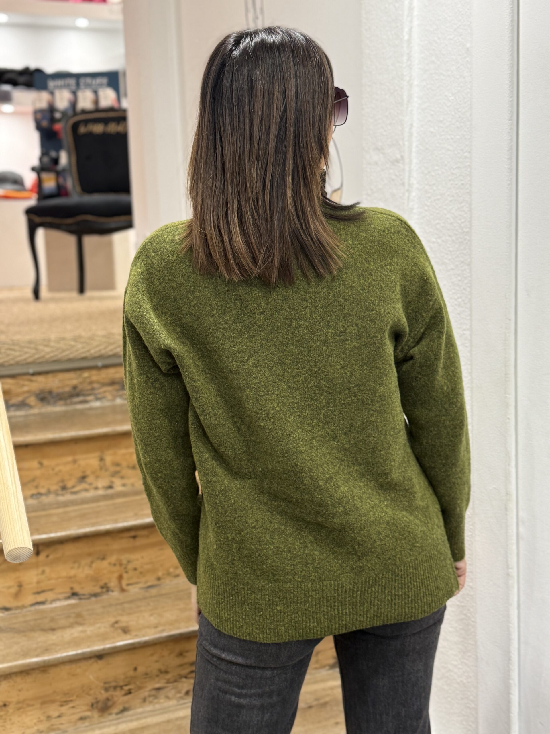 Ce pull en maille vert mousse est la pièce idéale pour allier confort et style au quotidien!