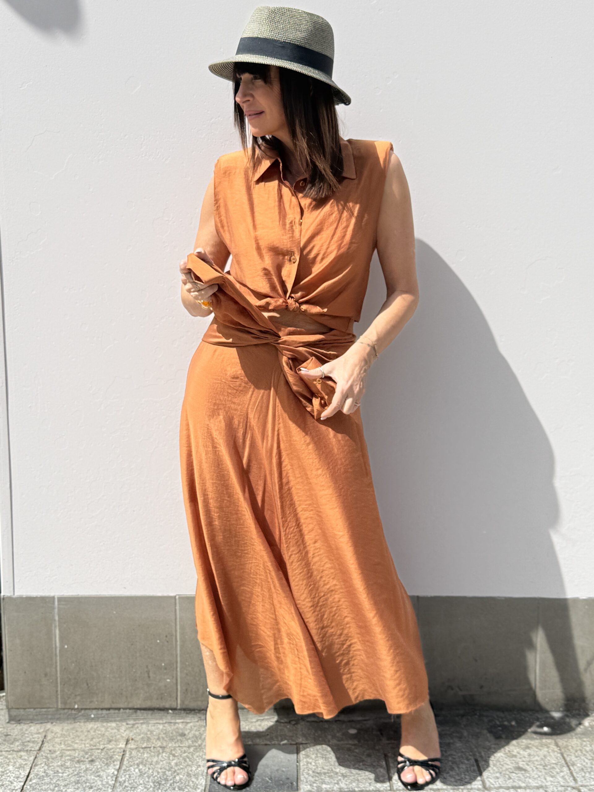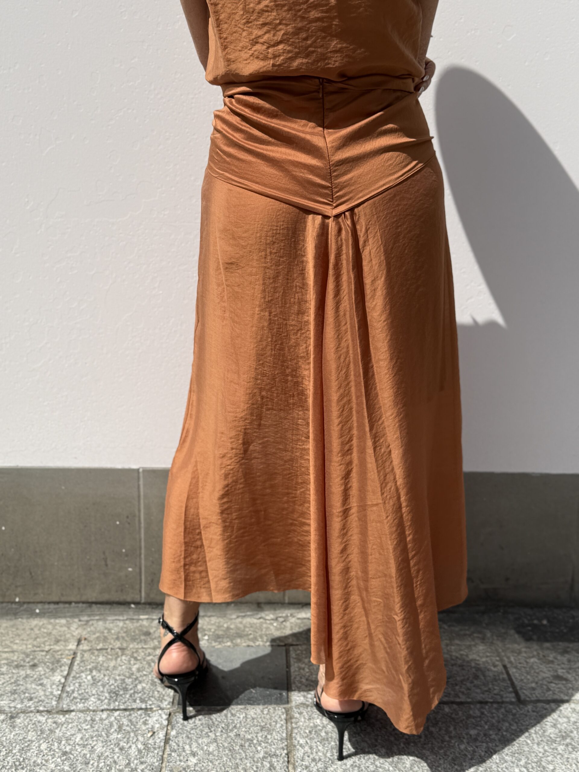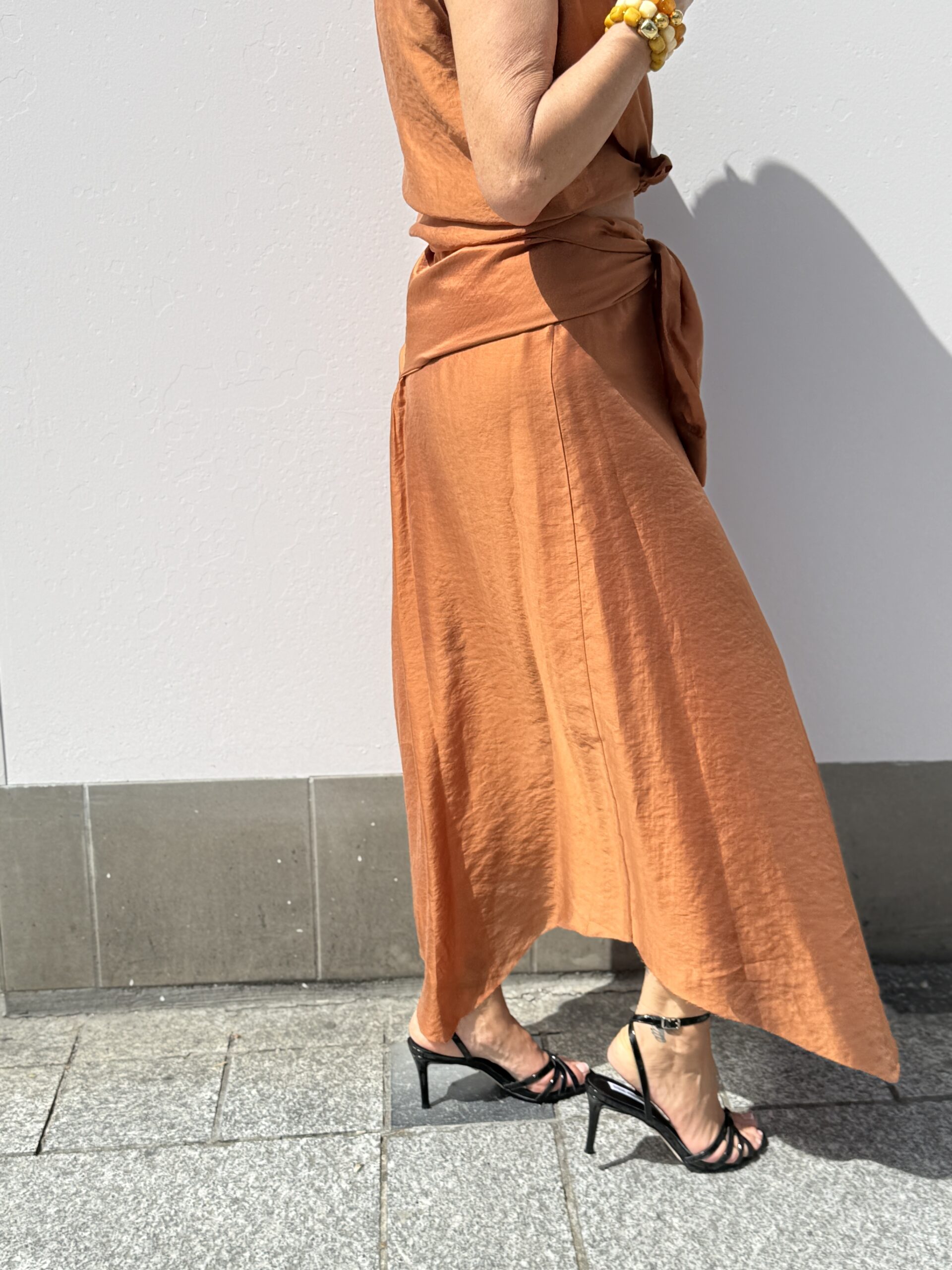 Jupe midi à l’allure sophistiquée, confectionnée dans une matière fluide au tombé léger. Son design “manches” nouées à la taille crée un effet très féminin et stylé.