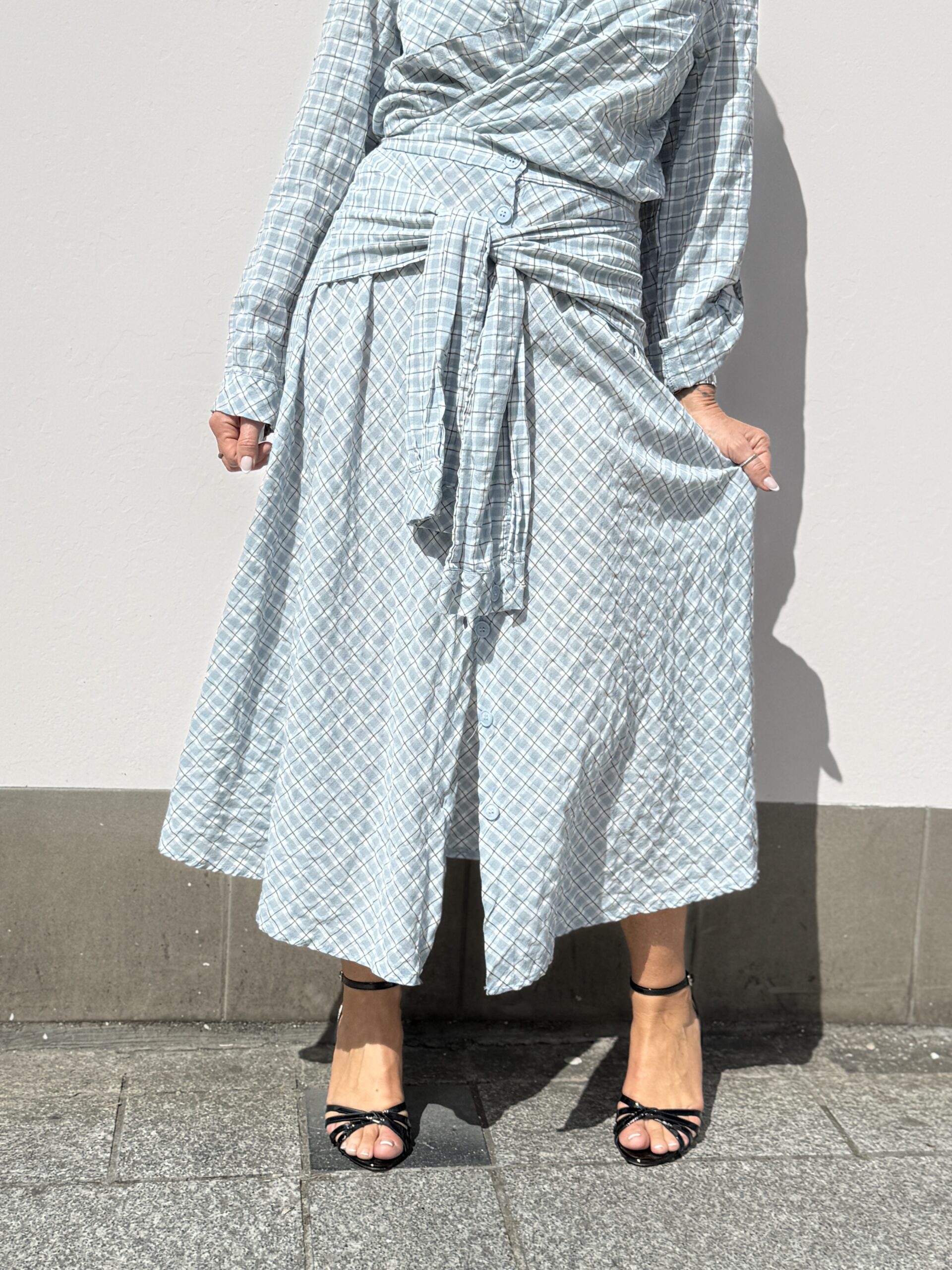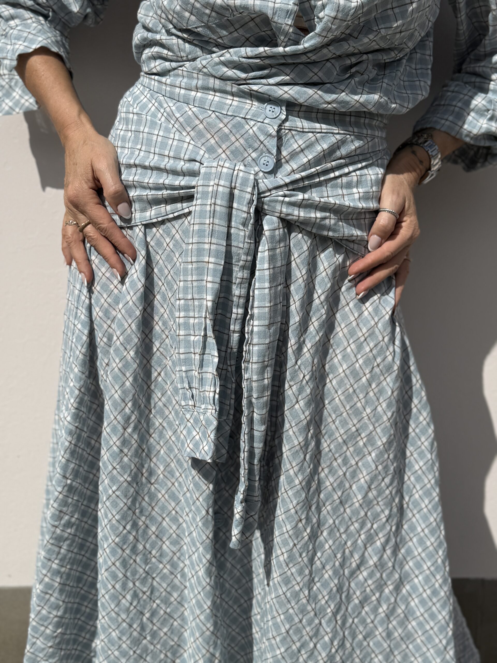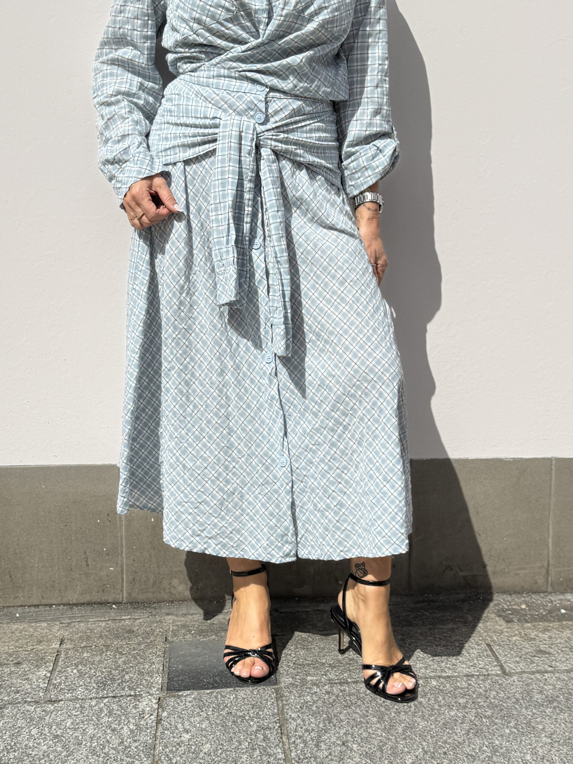 Jupe longue fluide à motif carreaux, esprit chic et casual. Coupe évasée avec boutons et liens a nouer pour une silhouette féminine et ajustable.