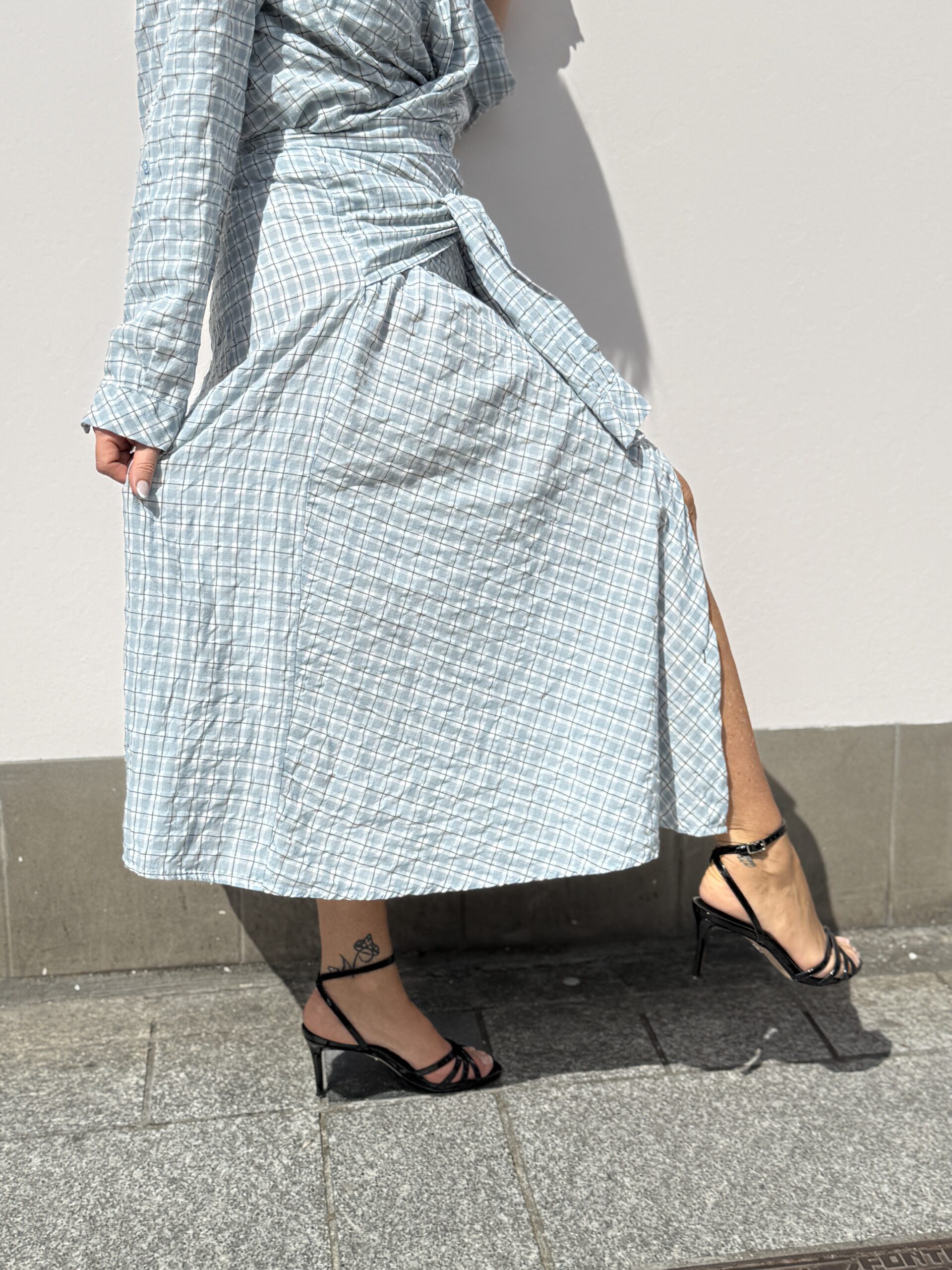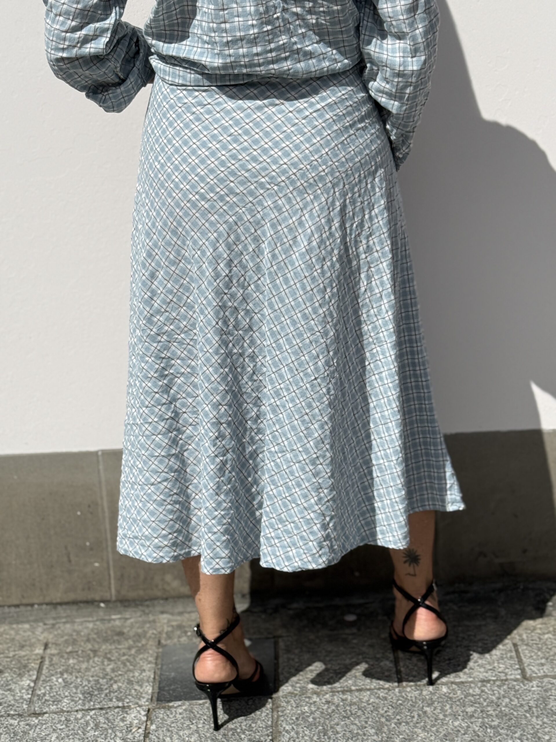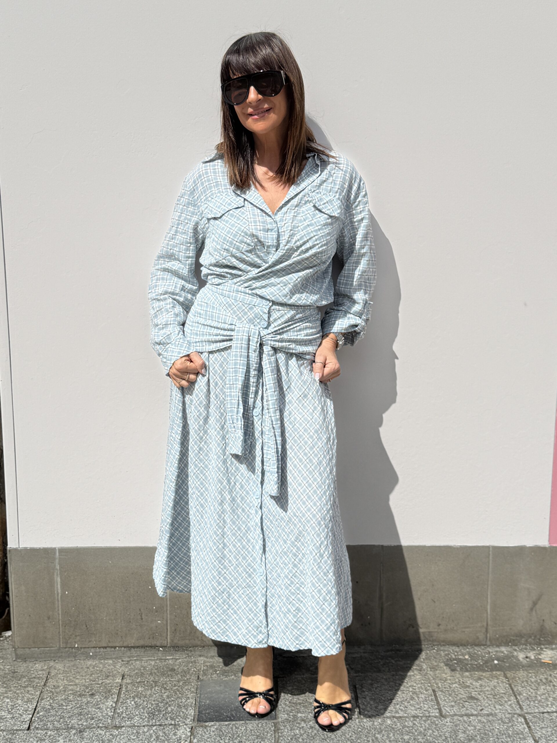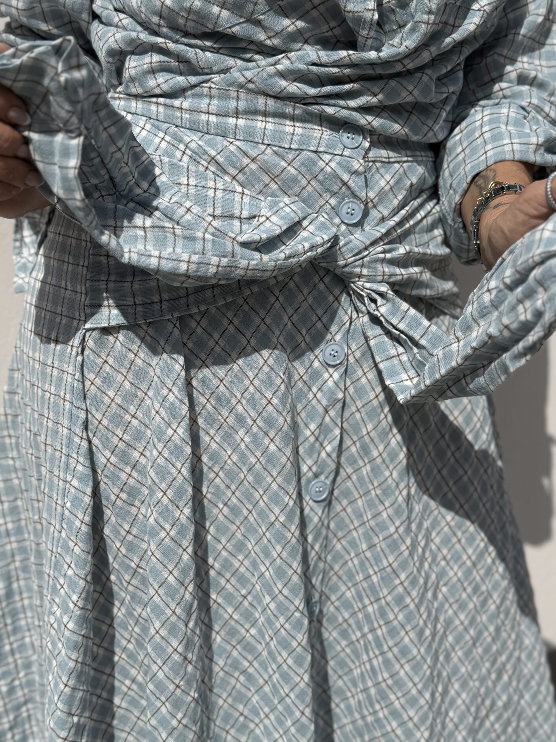Jupe longue fluide à motif carreaux, esprit chic et casual. Coupe évasée avec boutons et liens a nouer pour une silhouette féminine et ajustable.