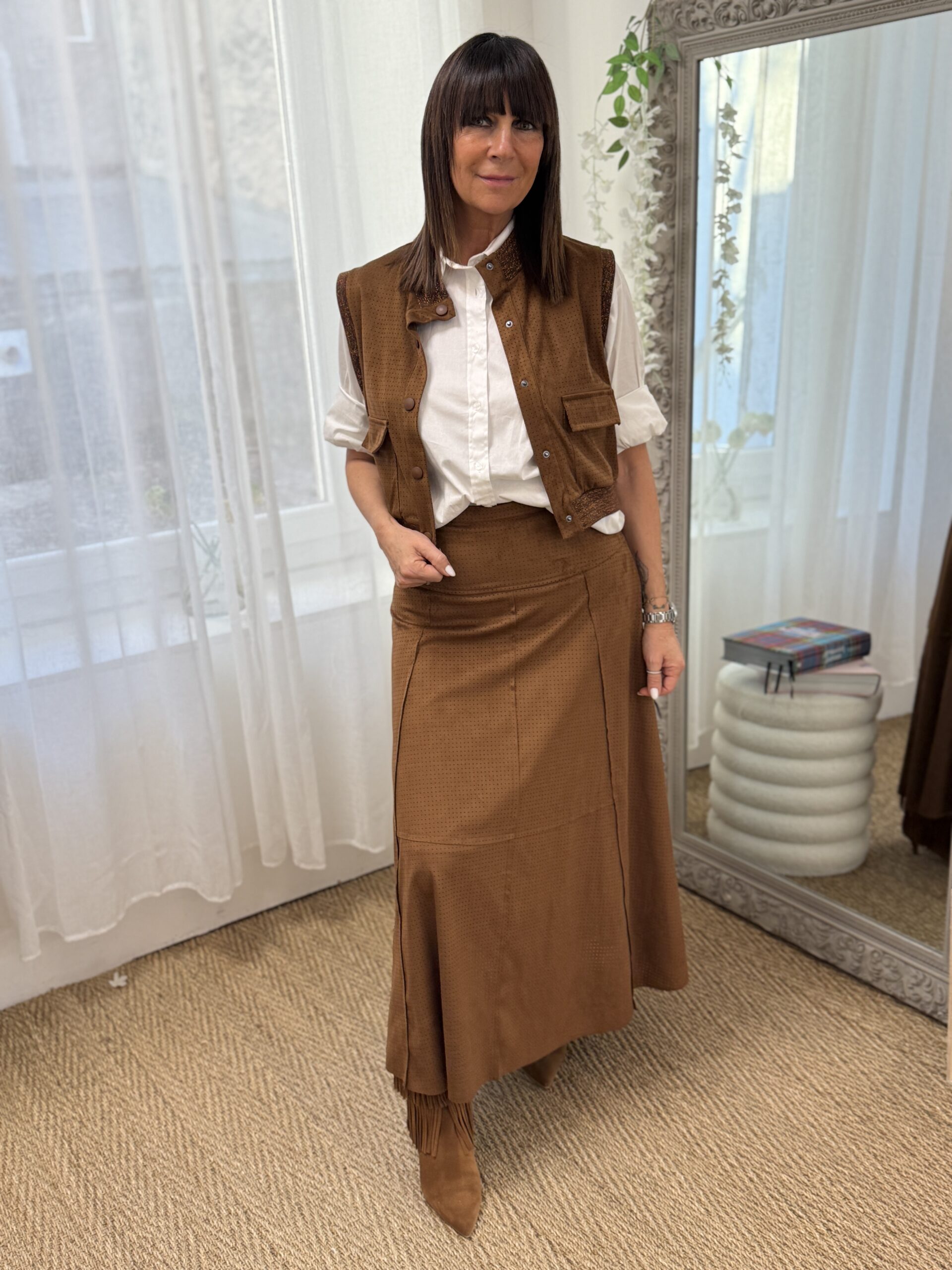 jupe midi au design épuré et moderne, confectionné dans une matière fluide, légèrement stretch au fini mat. Son motif micro perforé apporte une touche graphique subtile tout en conservant une allure chic et minimaliste.