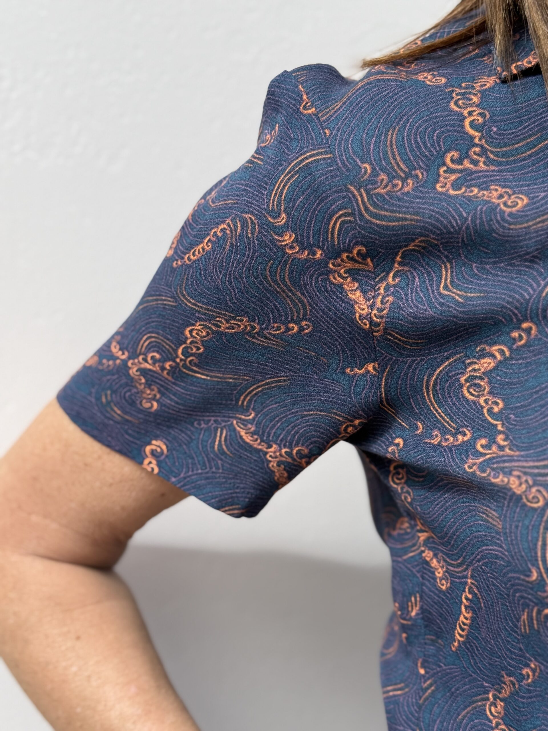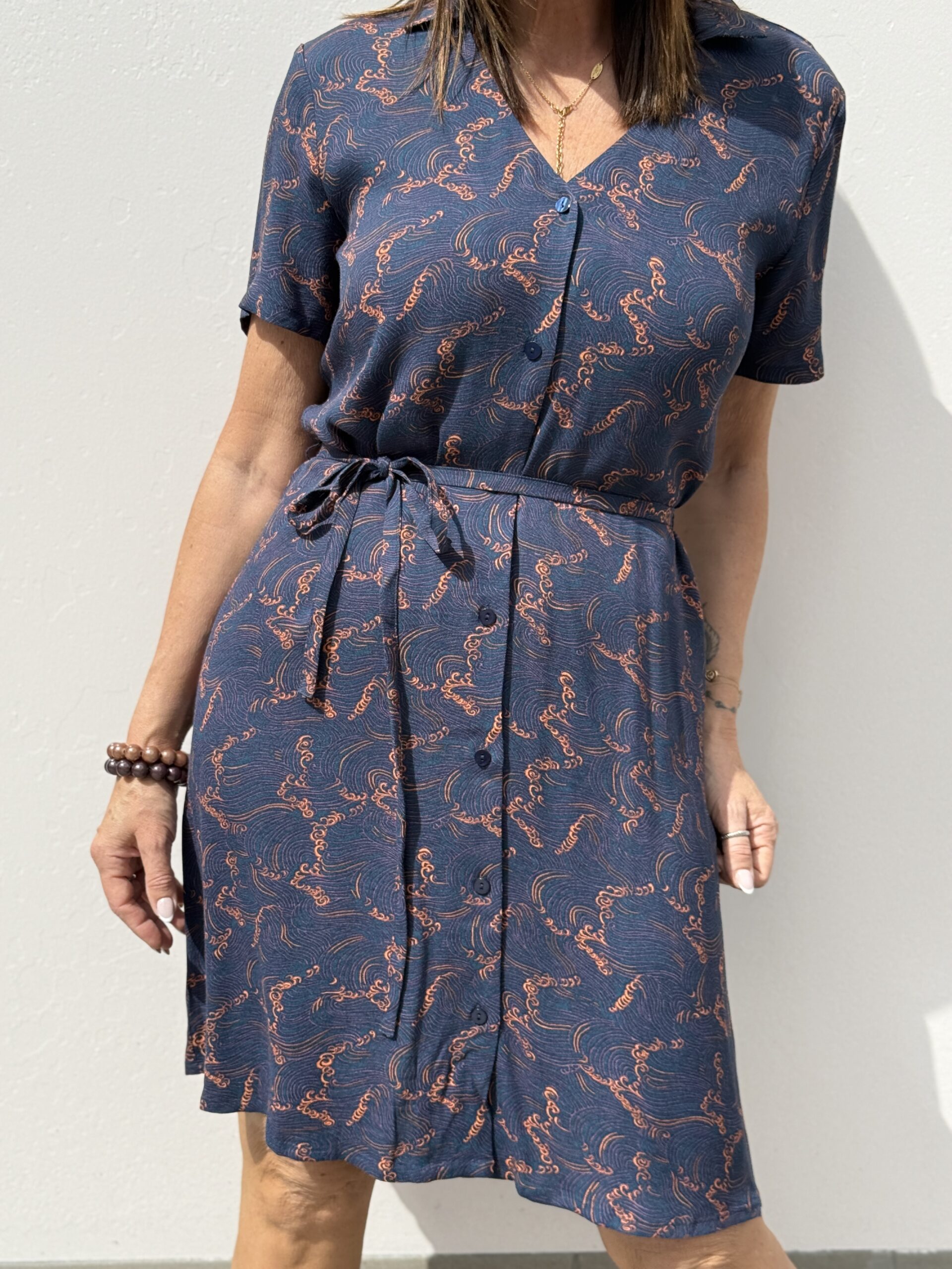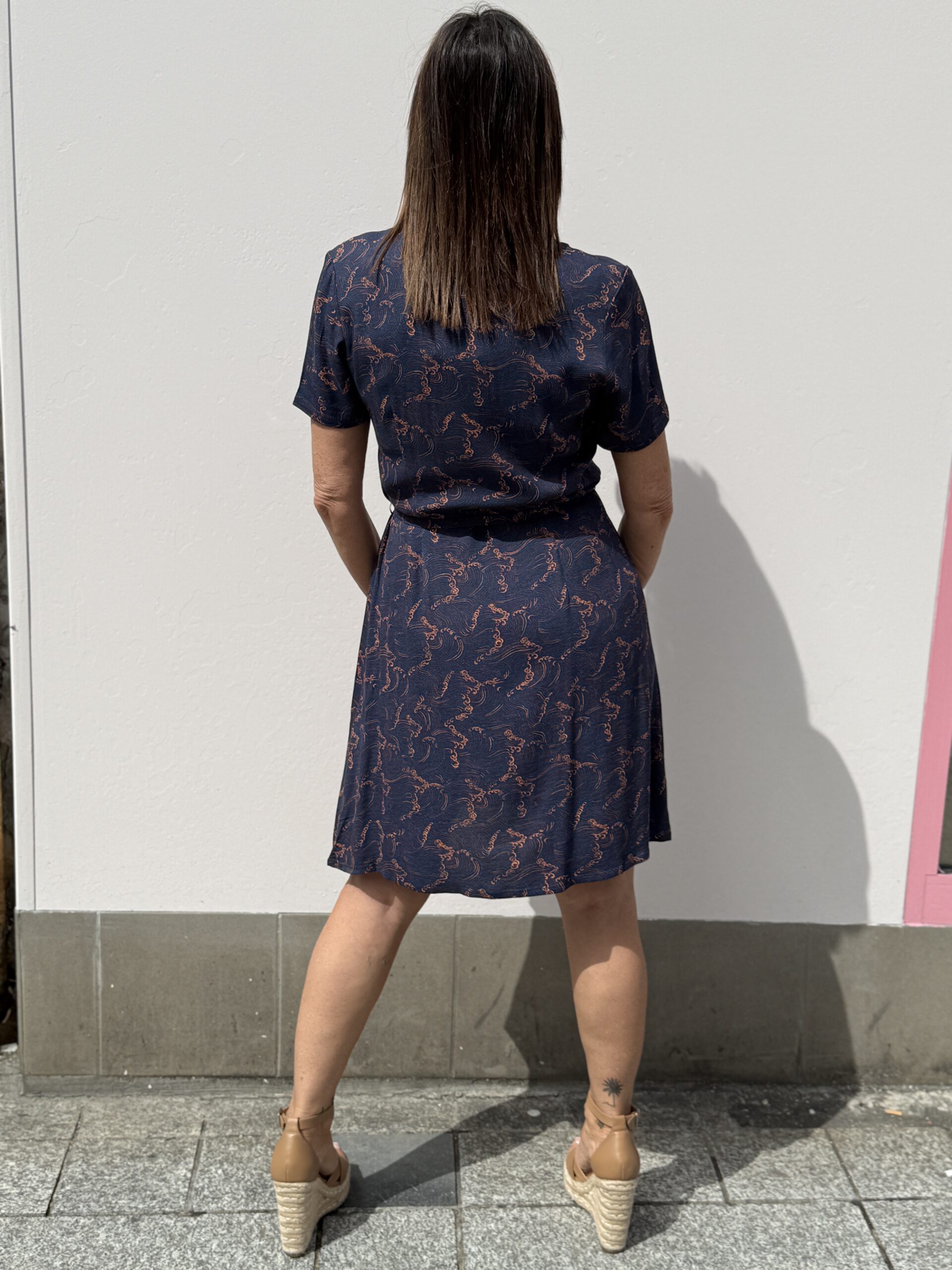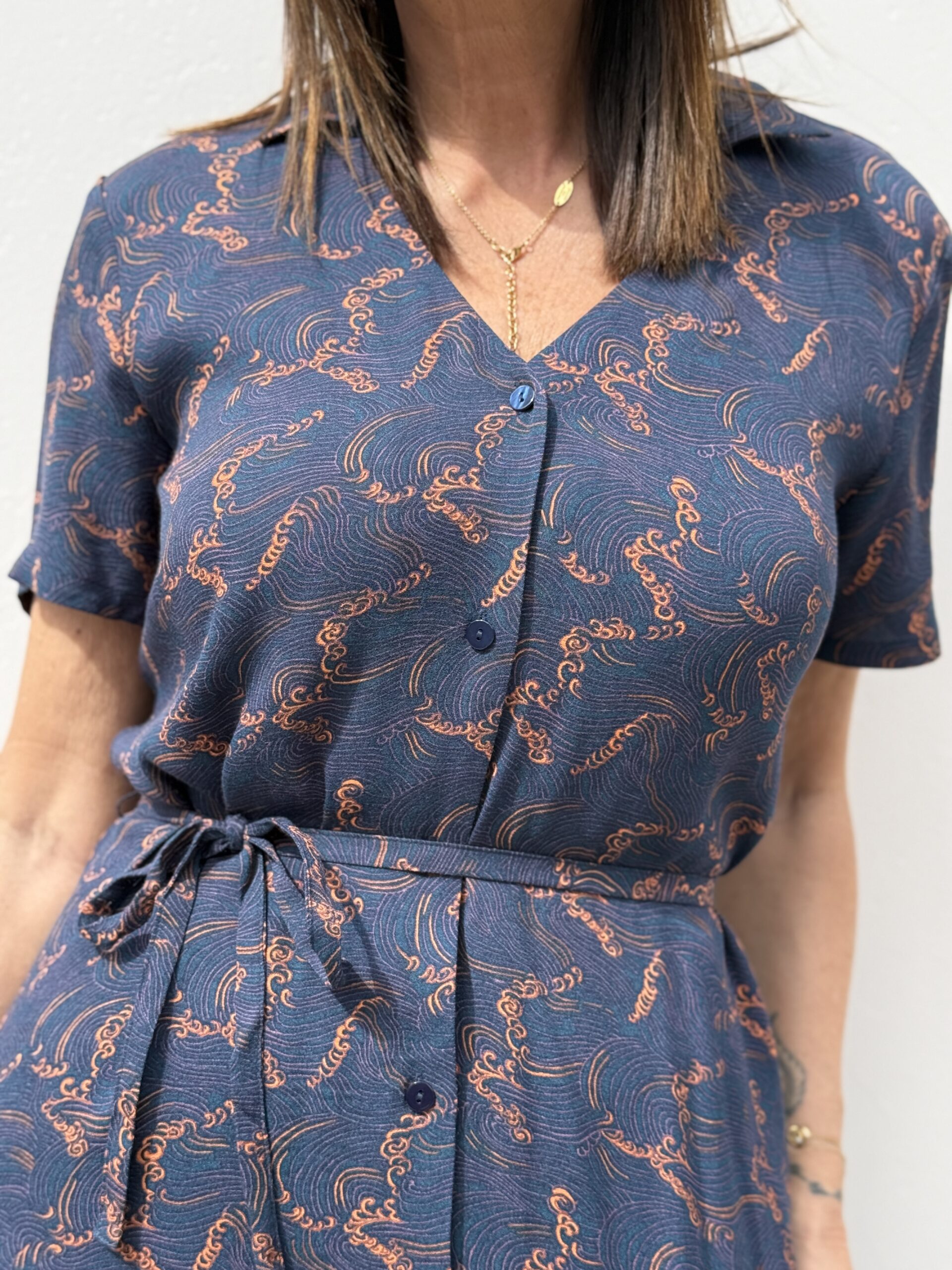 Une robe fluide et originale qui allie confort et élégance avec une touche graphique.