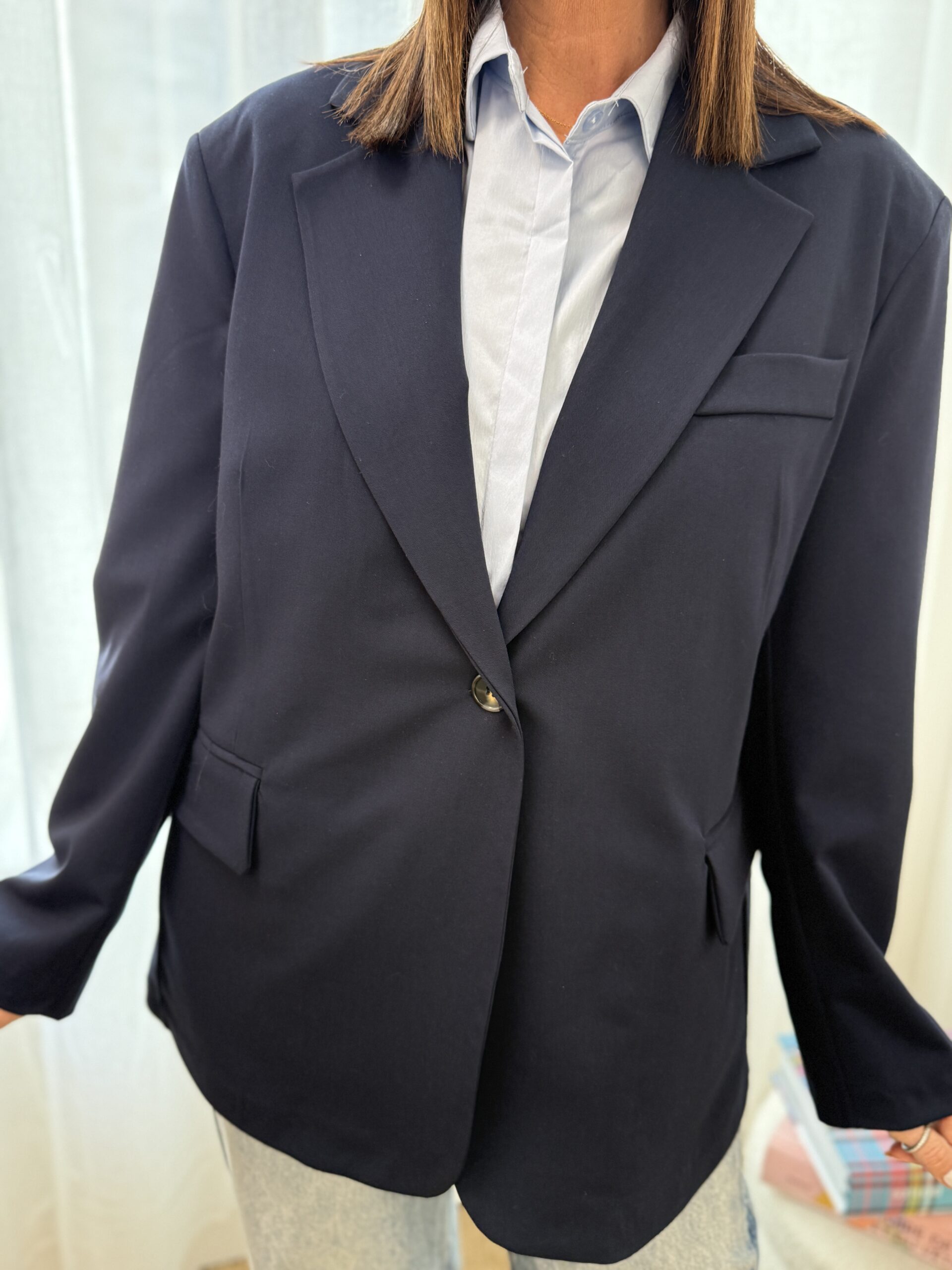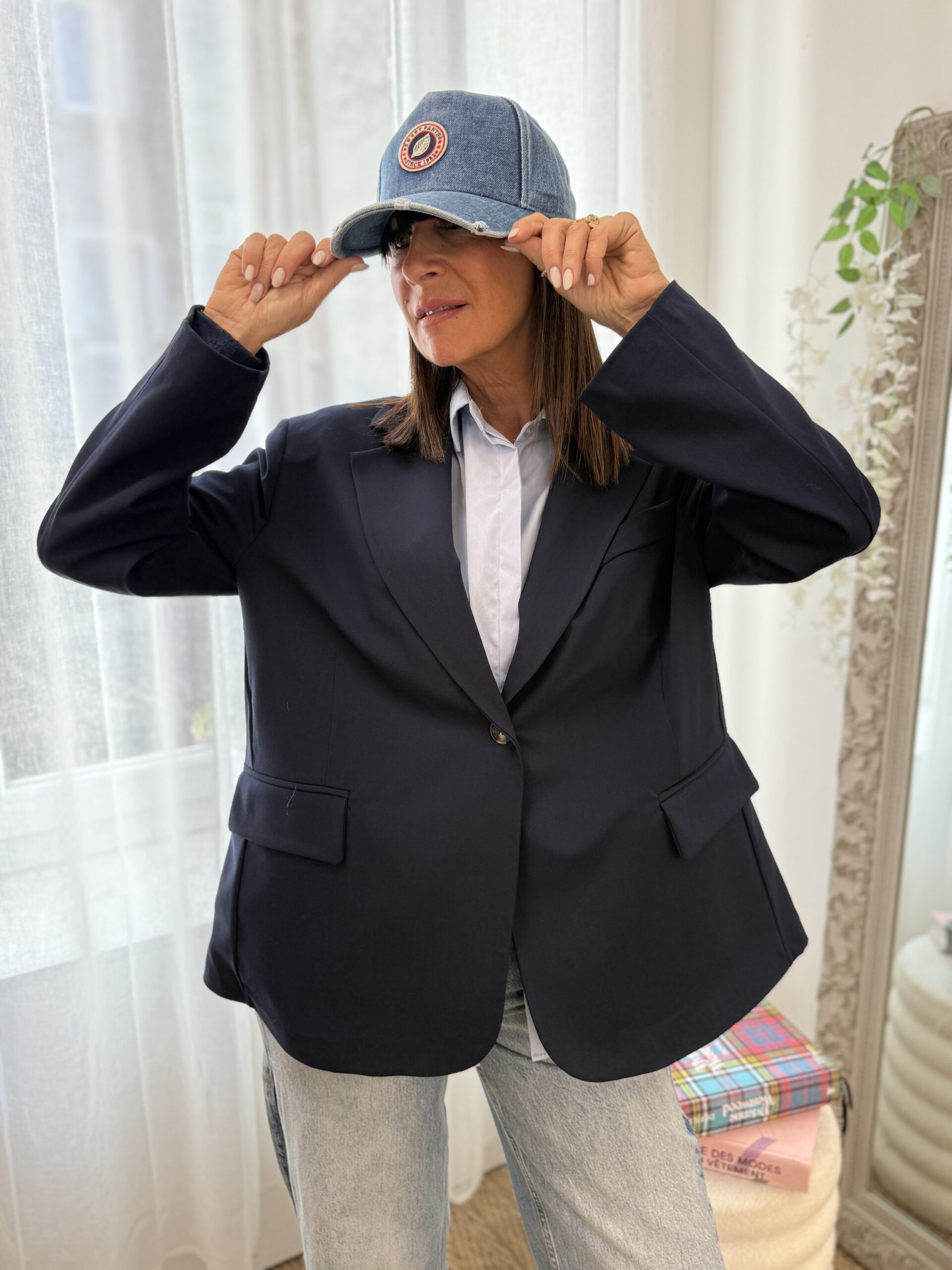 Conseil mode de Nathalie : Associez ce blazer bleu marine avec un pantalon tailleur pour un ensemble professionnel ou portez-le avec un jean et T-shirt pour une allure moderne et décontractée.