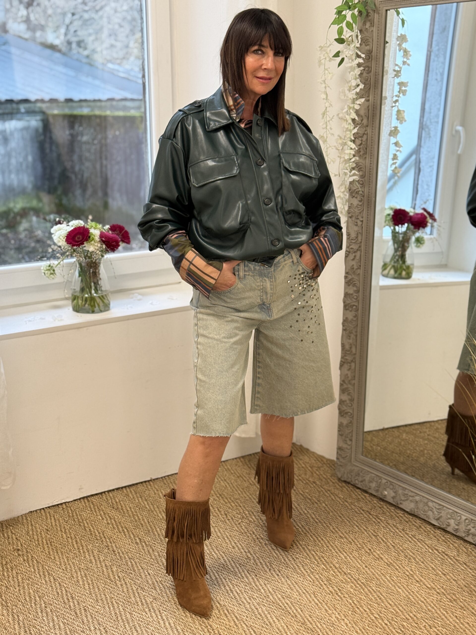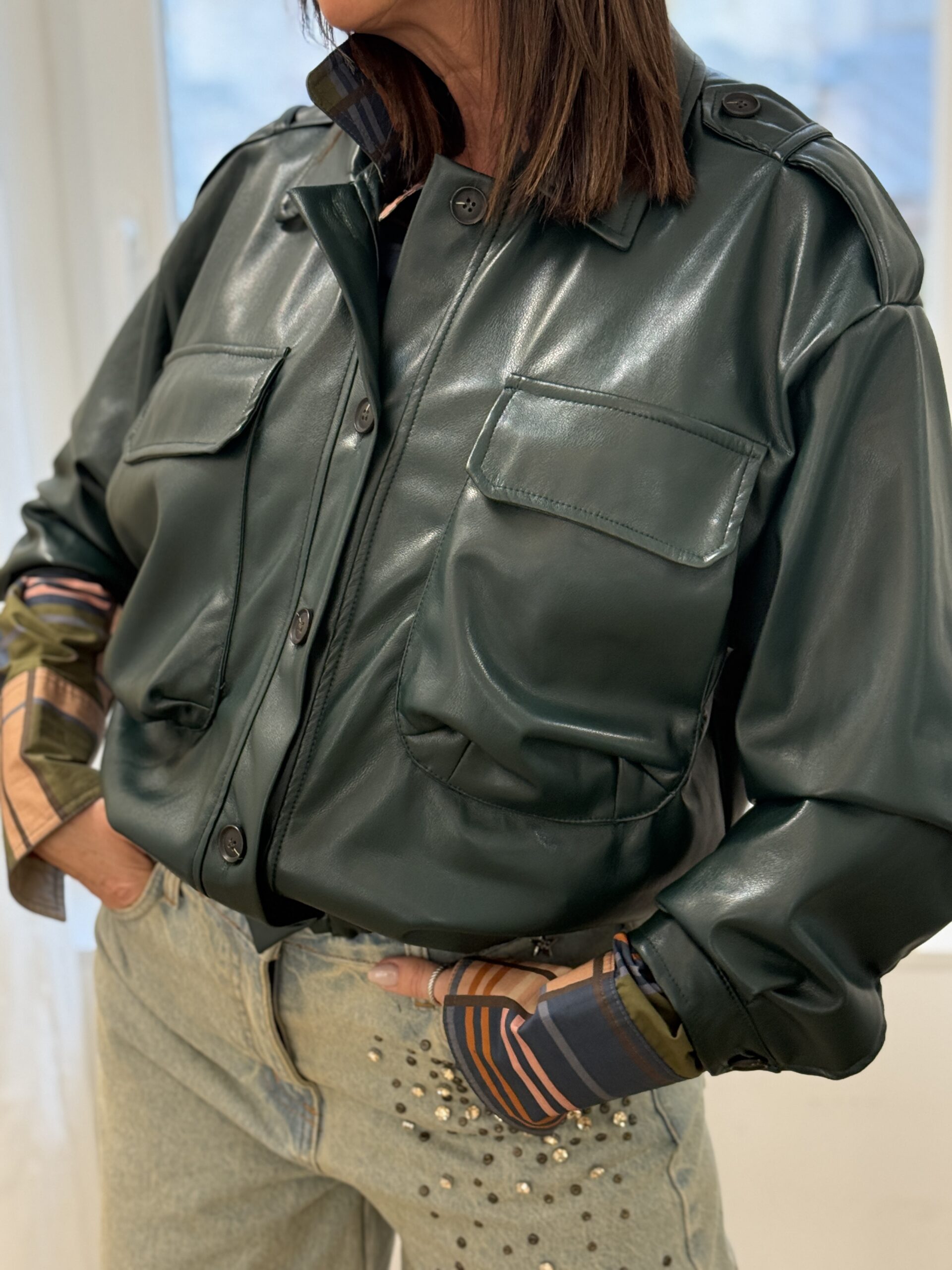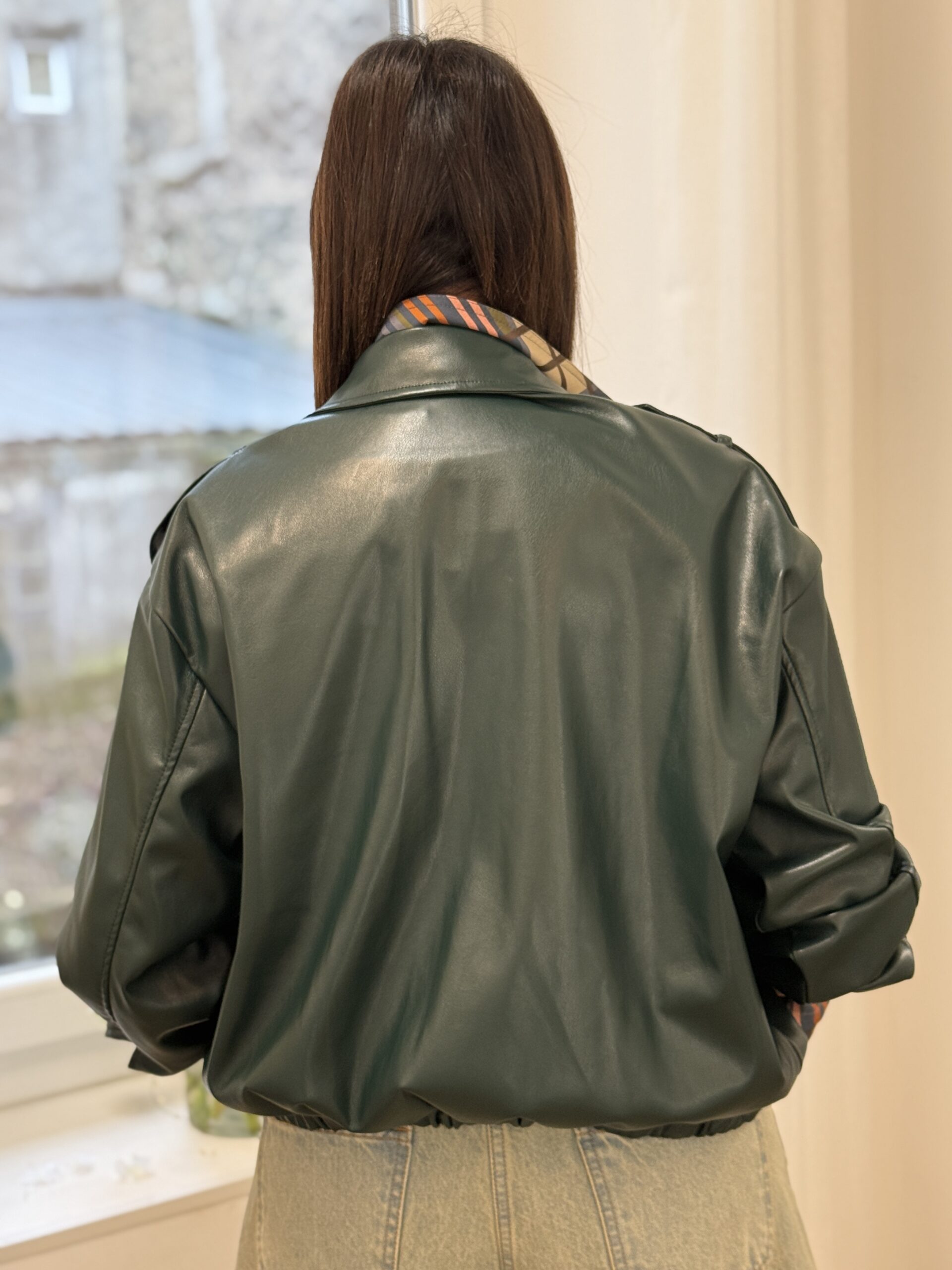 Blouson aviateur court en simili cuir au coloris vert sapin intense, à l’esprit utilitaire chic avec ses poches plaquées et ses épaules structurées.