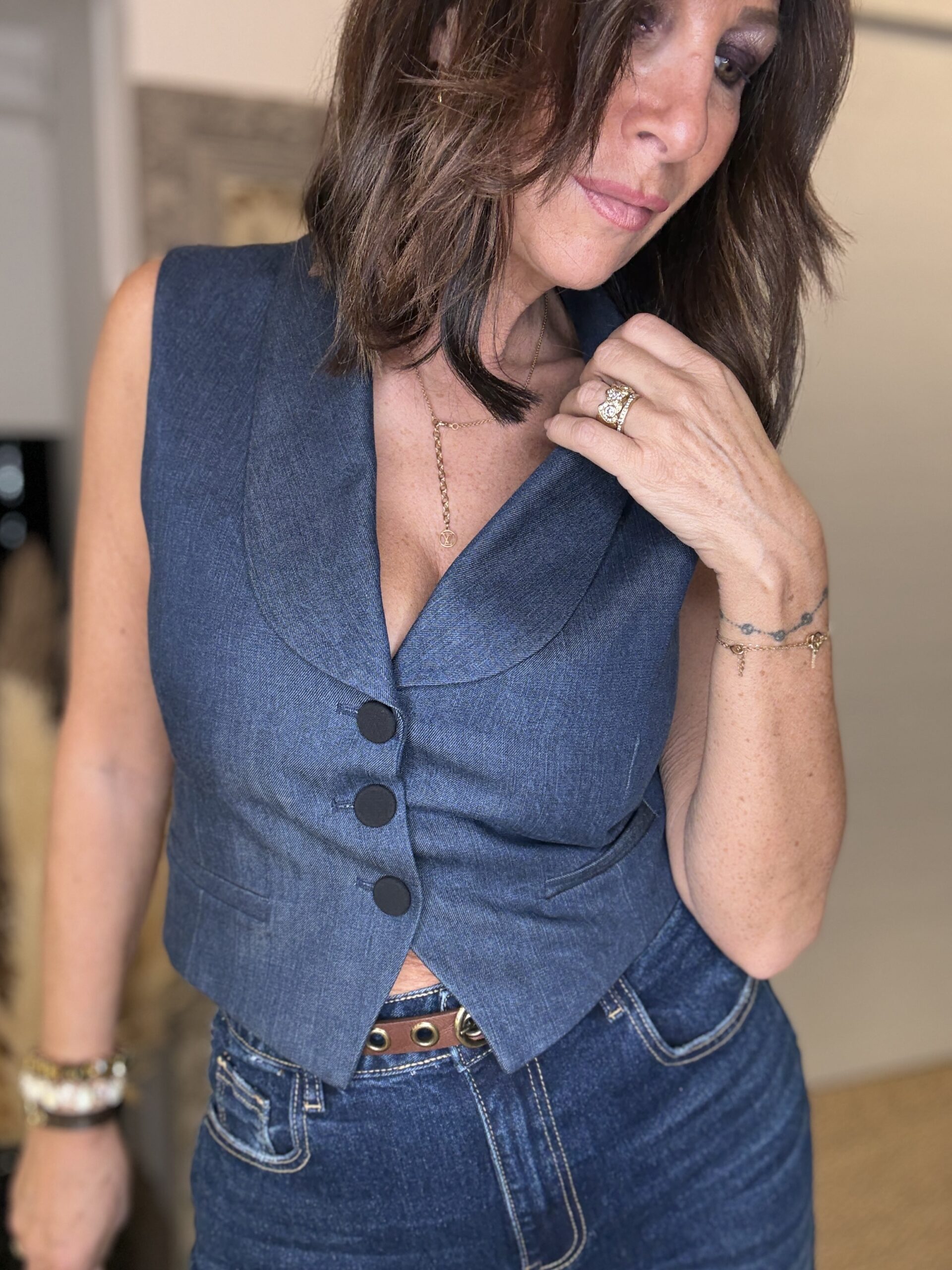 Apportez une touche chic et moderne à vos tenues avec ce superbe gilet de barman en denim bleu. Sa coupe ajustée est structurée met en valeur la silhouette tout en conservant un style élégant et décontracté.