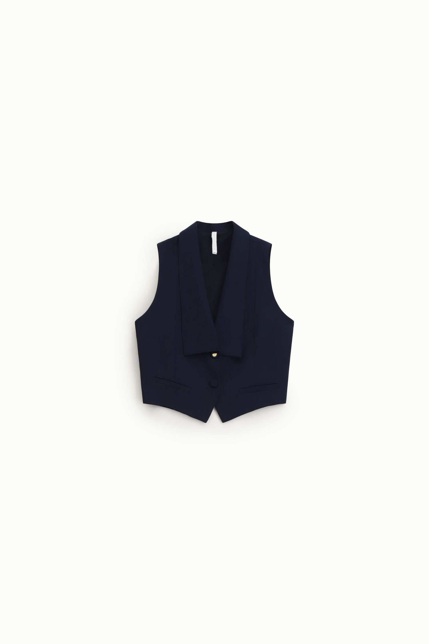 Gilet de costume sans manches bleu marine à la coupe structurée et élégante.