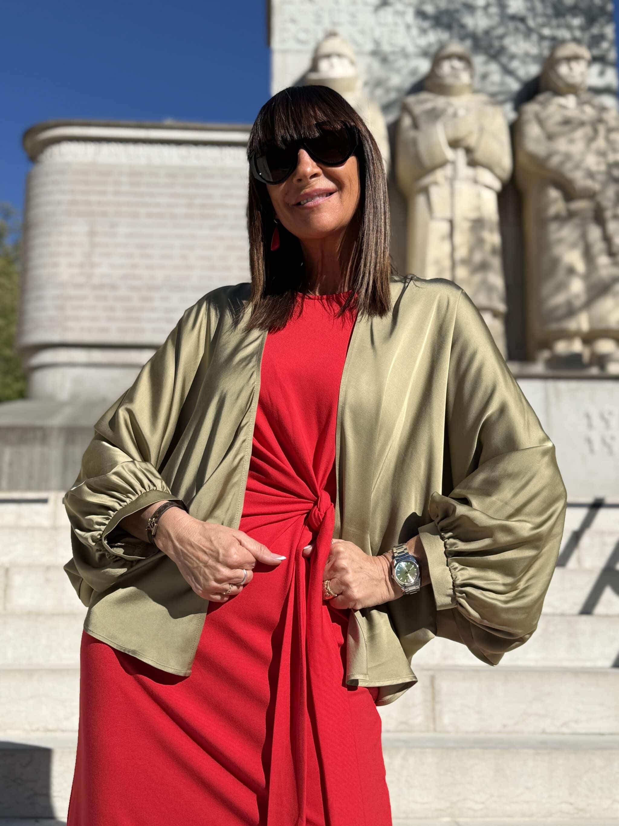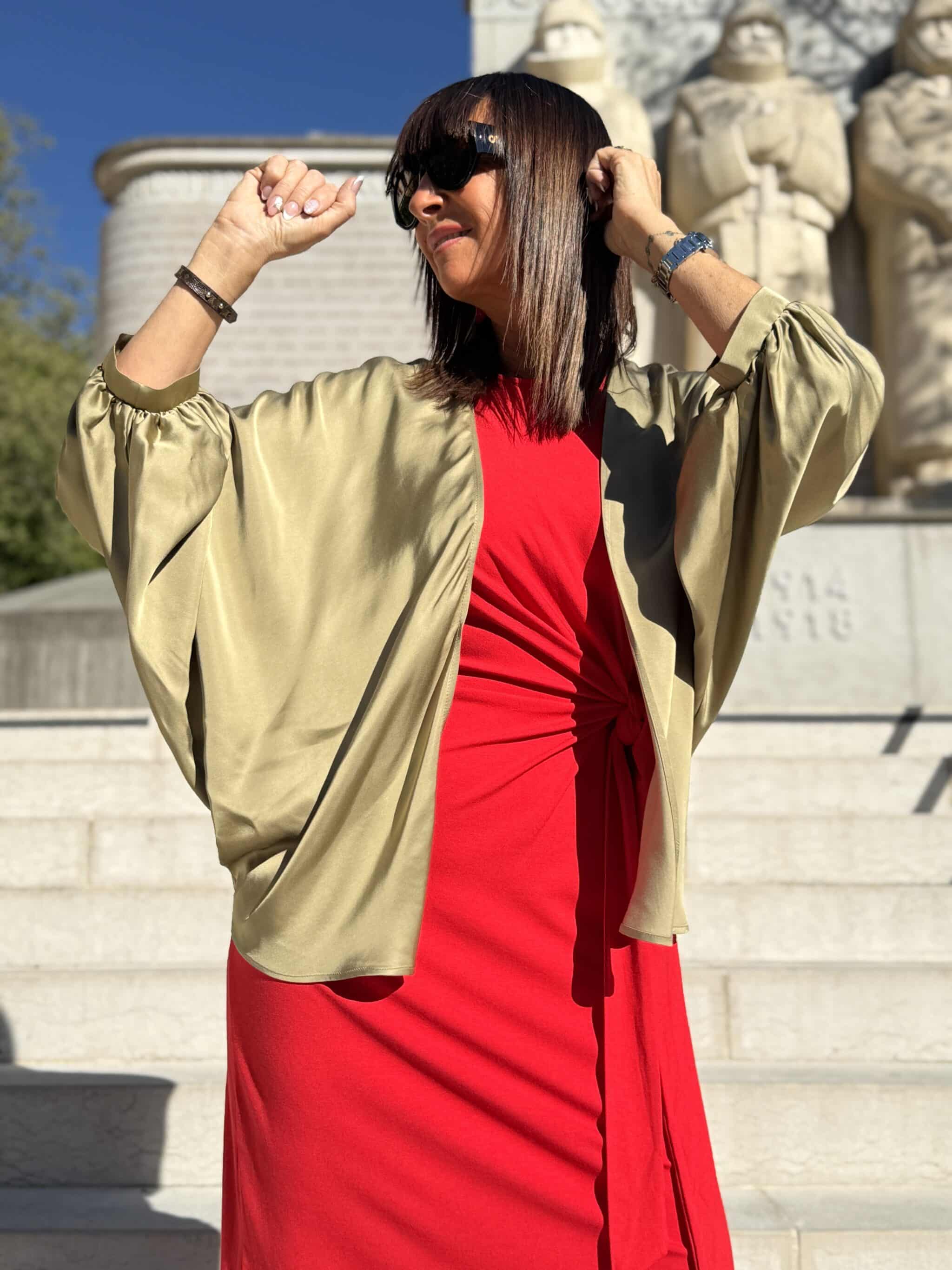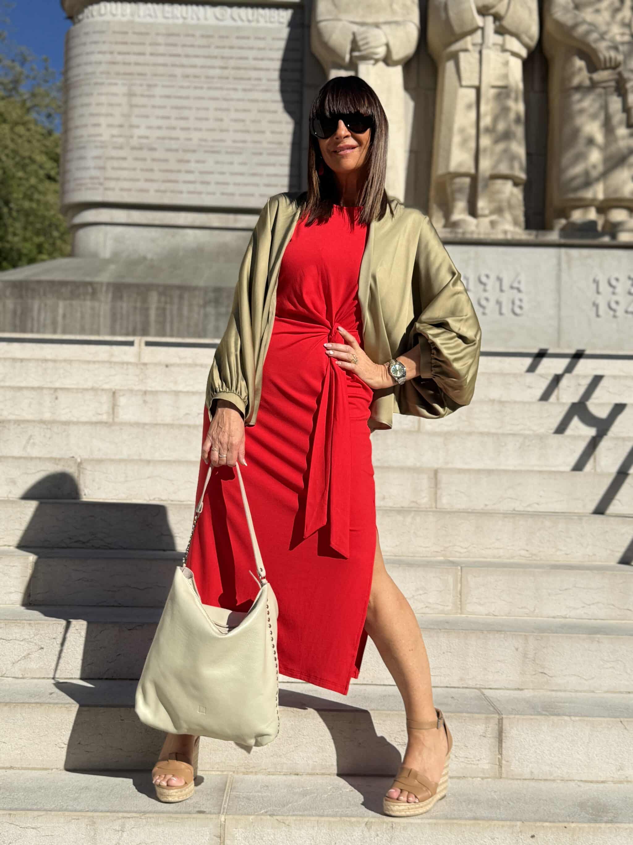 Conseil mode de Nathalie : Sublime avec un pantalon beige ou écru, un top blanc fluide et des sandales dorées pour un look doux, naturel et chic.