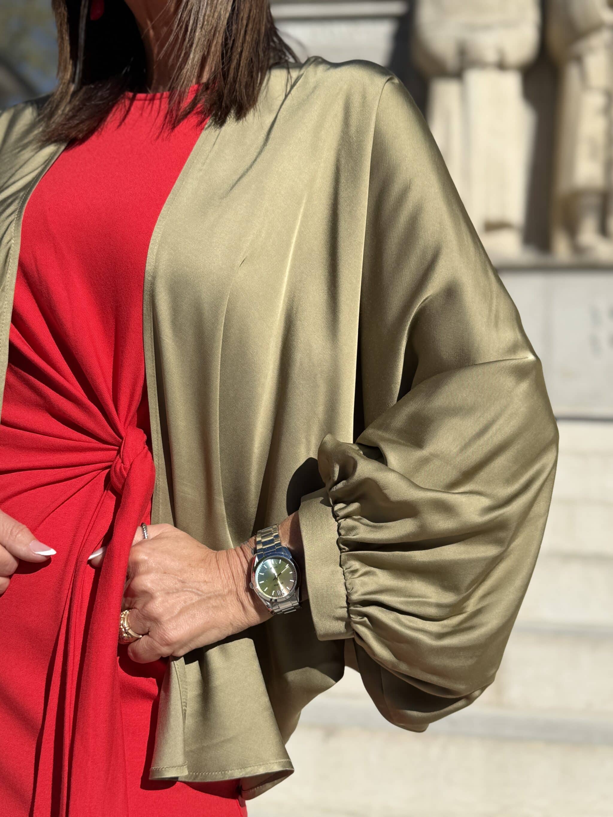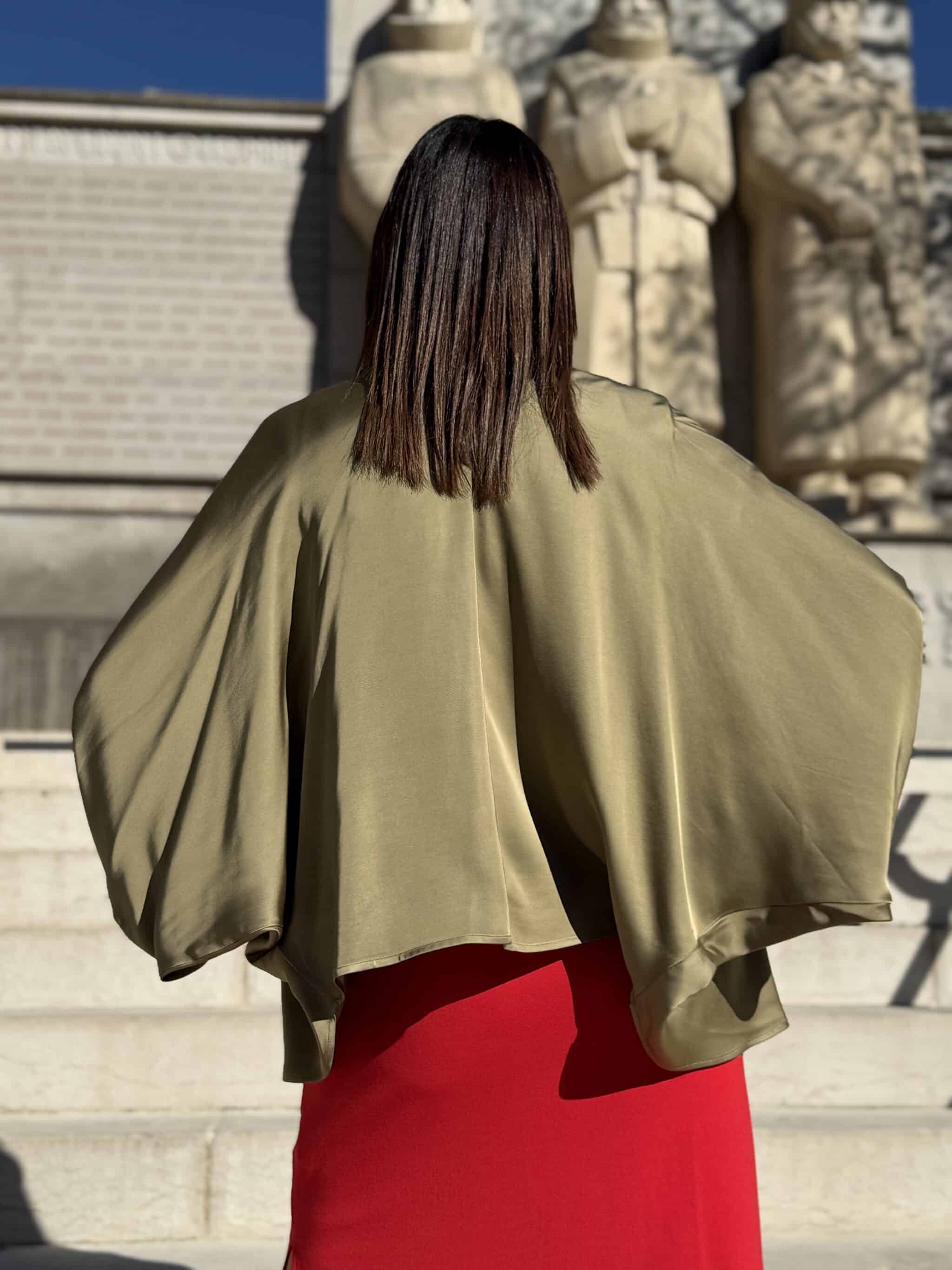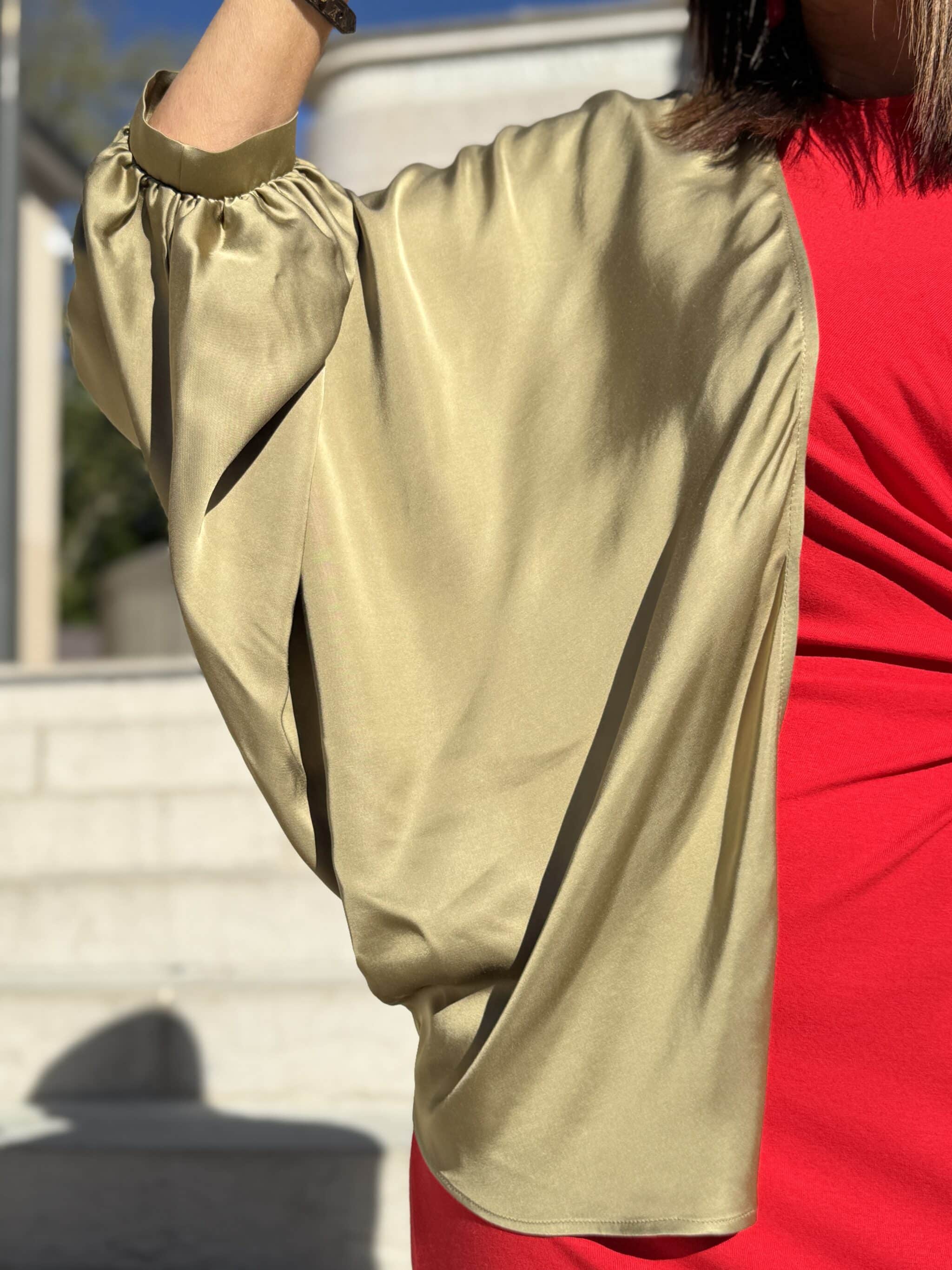 Gilet fluide vert sauge à la matière satinée et légèrement brillante, au tombé élégant.