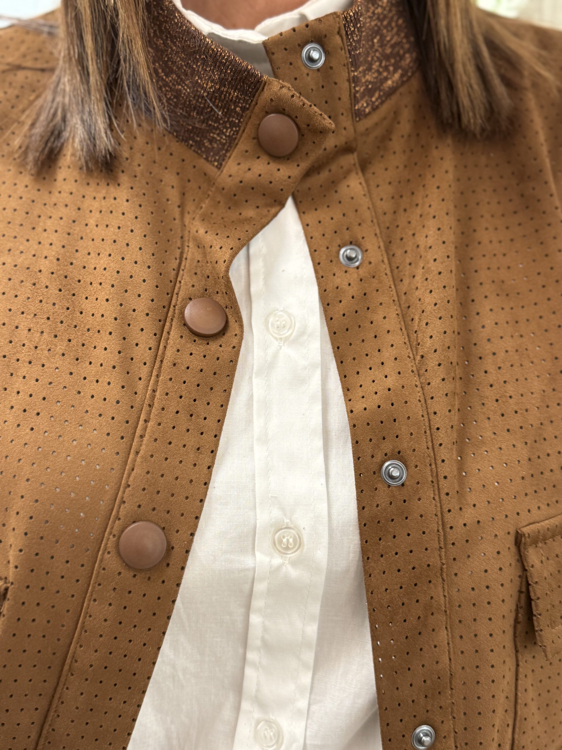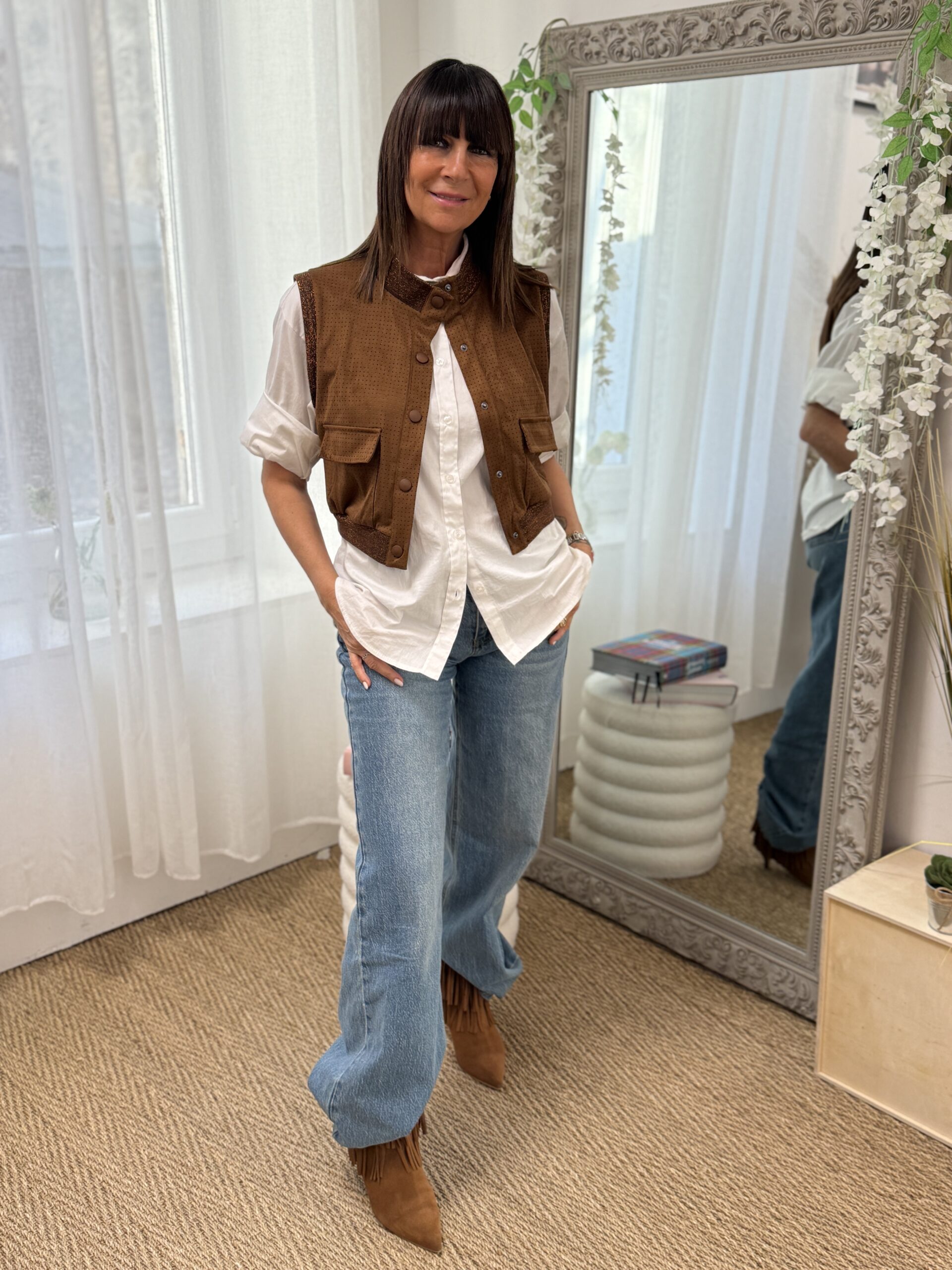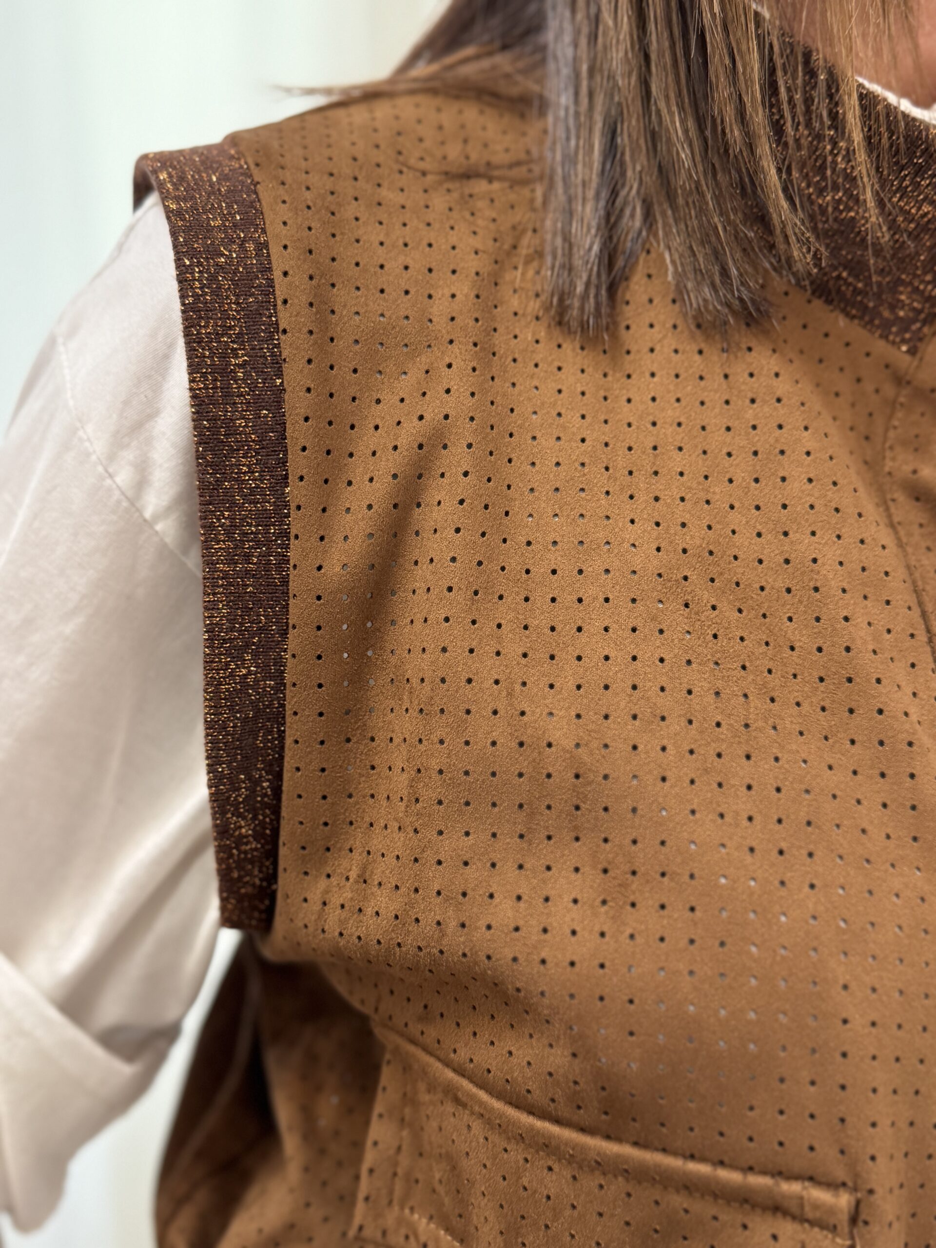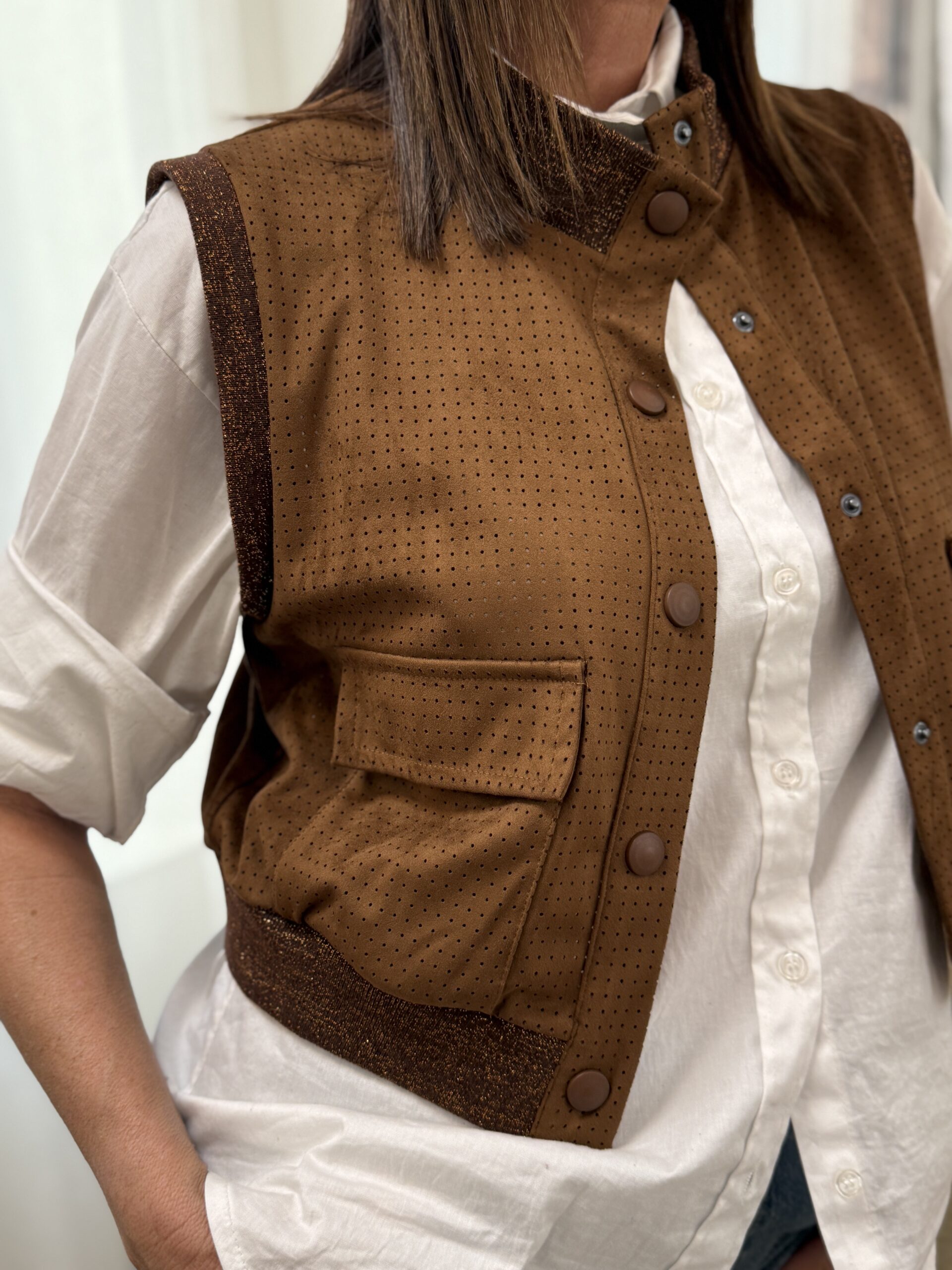 Gilet sans manches au design moderne et structuré, confectionné dans une matière perforé au look sophistiqué. Sa teinte camel chaleureuse est sublimée par des finitions irisées au niveau du col, des emmanchures, et de la base, apportant une touche lumineuse et originale.