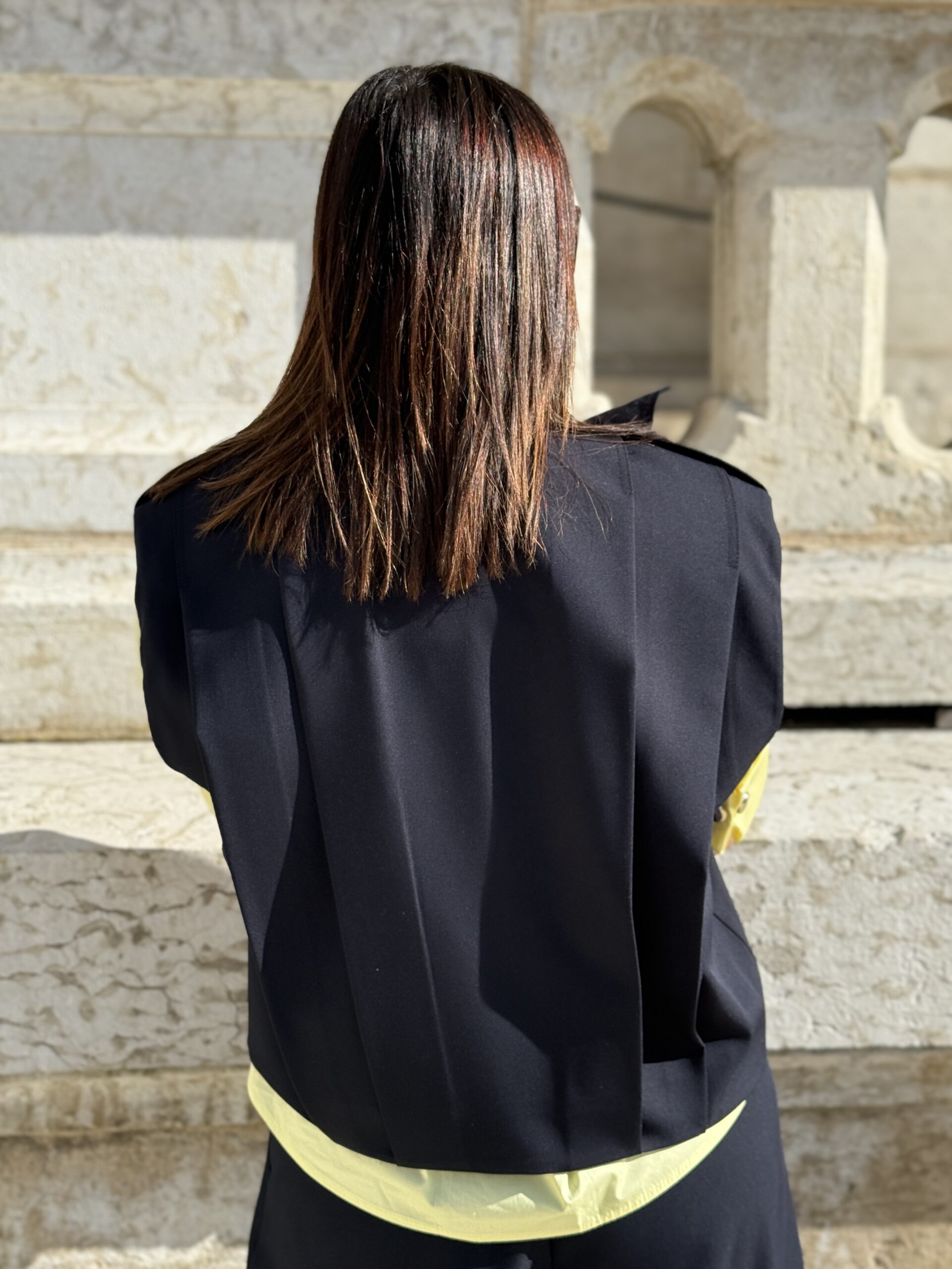 Gilet sans manches à l’esthétique tailoring et utilitaire, cette pièce se distingue par sa construction architecturée et son col montant affirmé. Les plis verticaux sculptent la silhouette tandis que les pattes d’épaules inspirées du vestiaire militaire renforcent son caractère mode et contemporain.