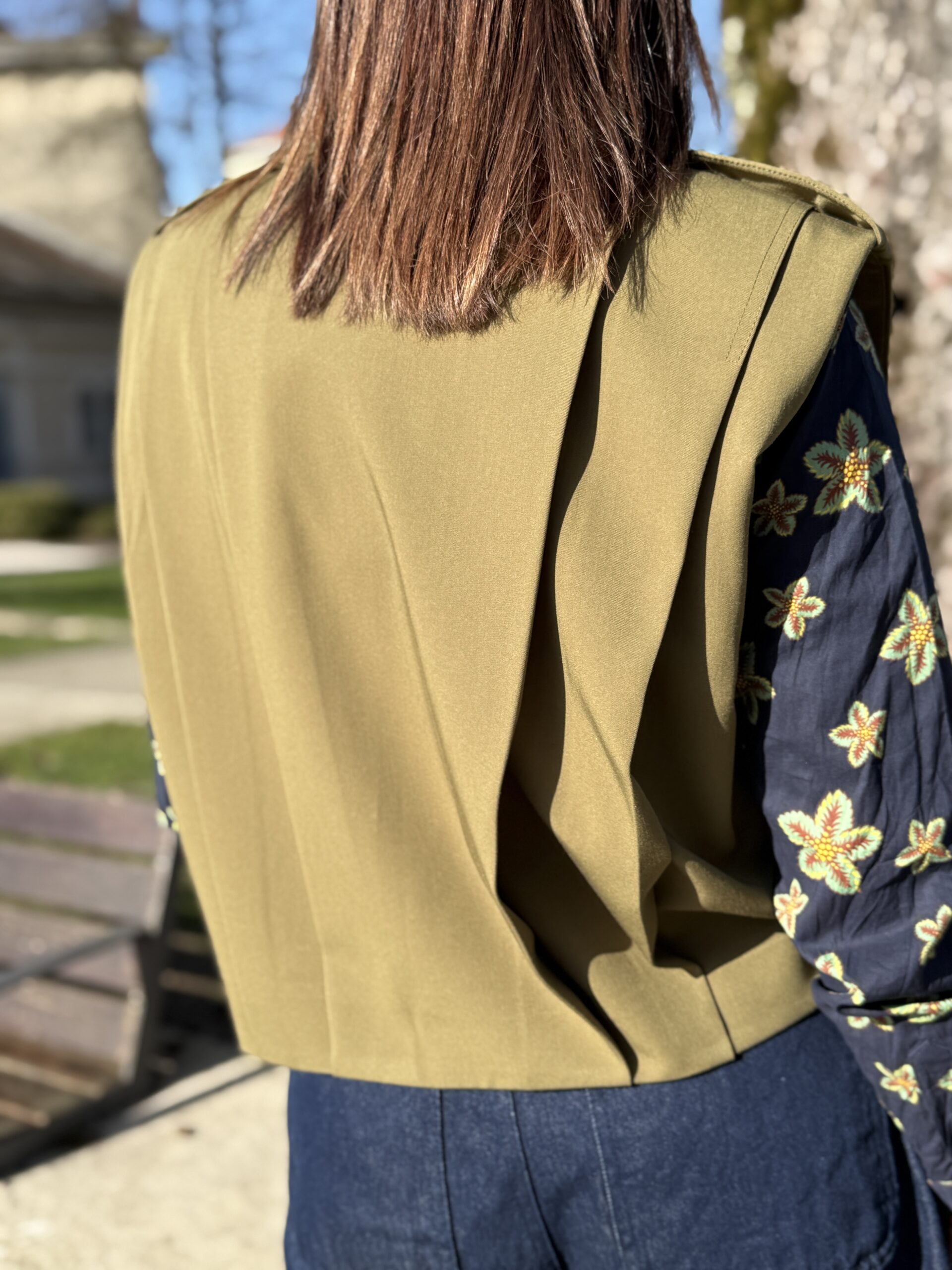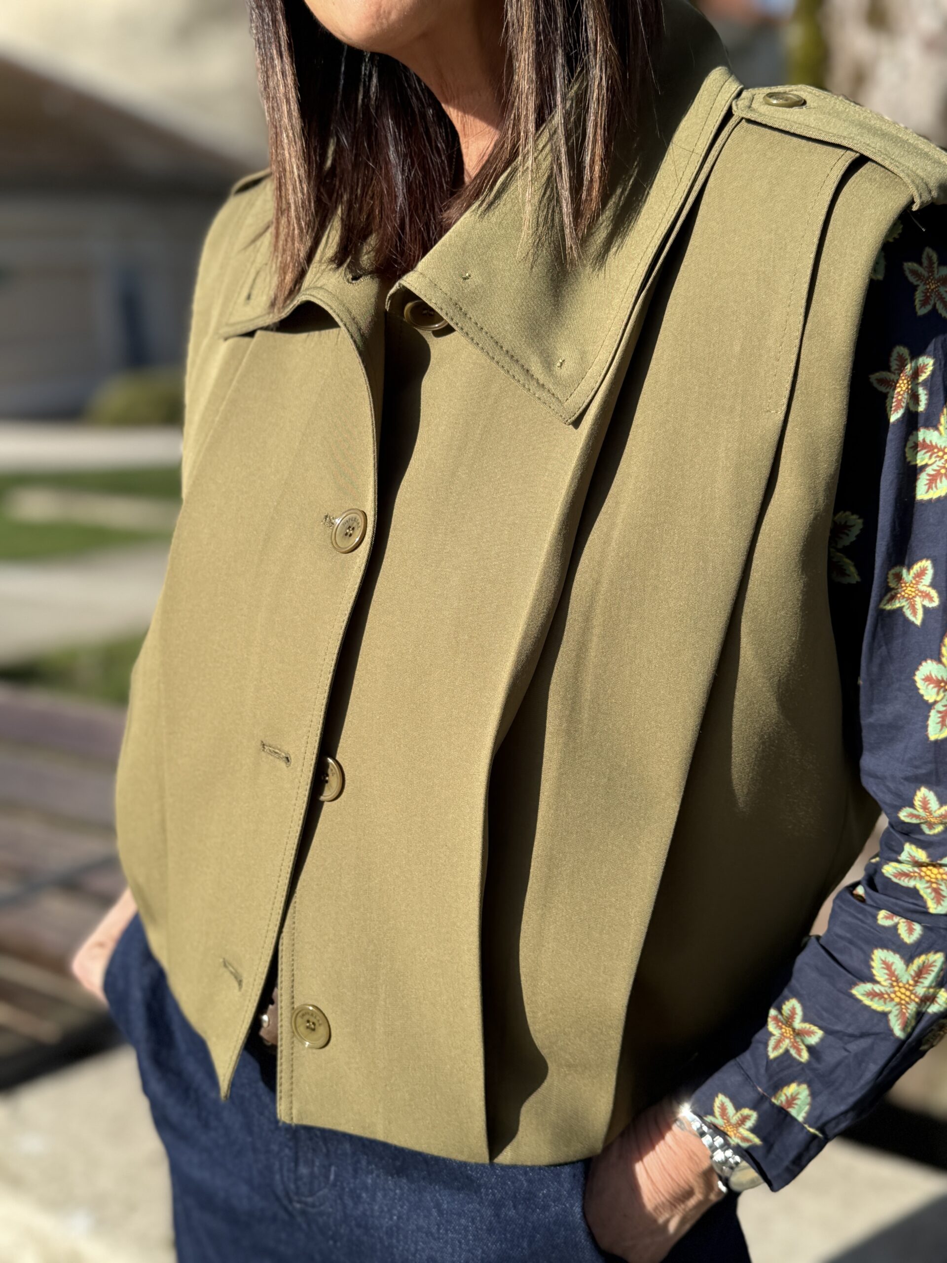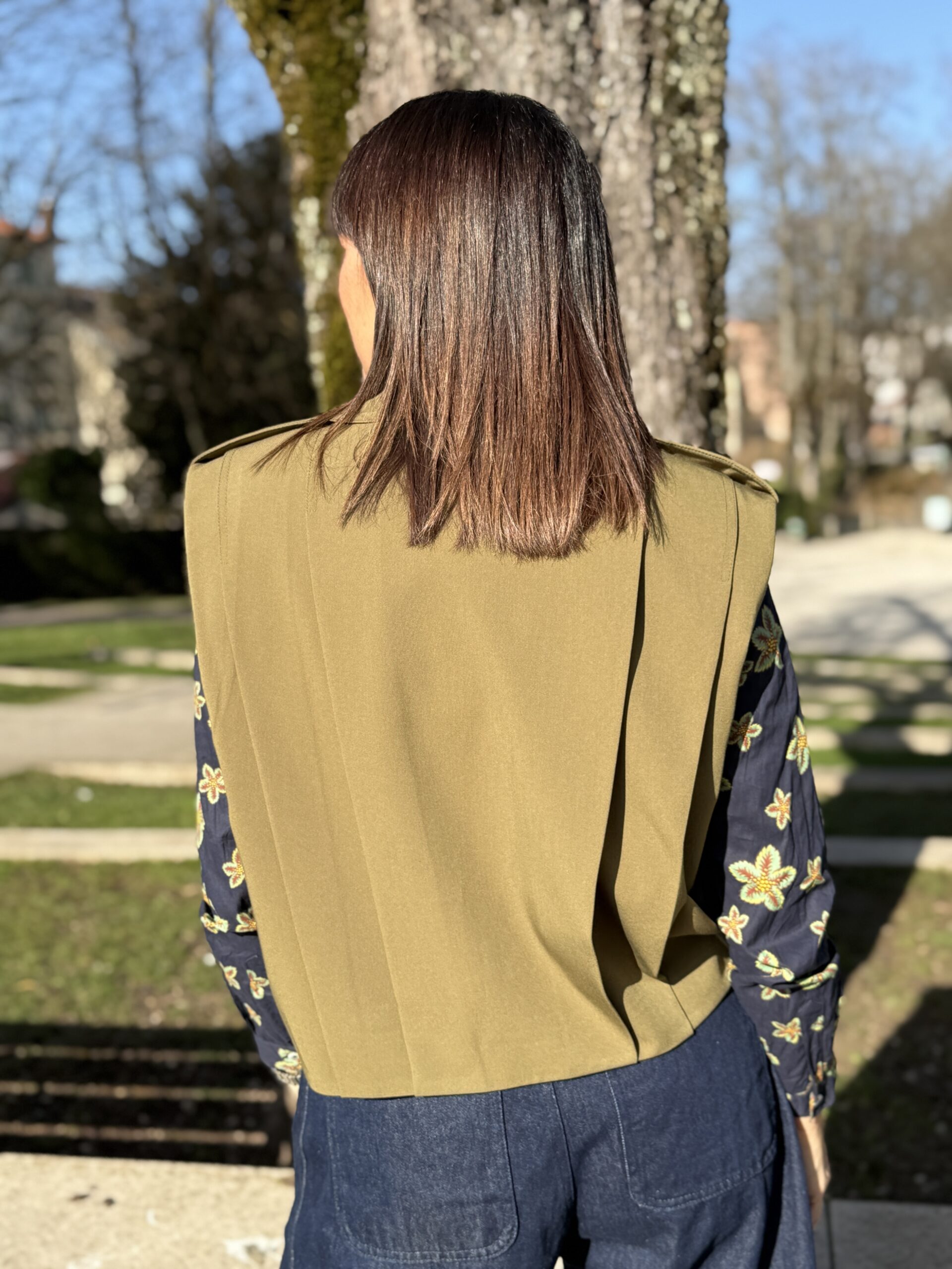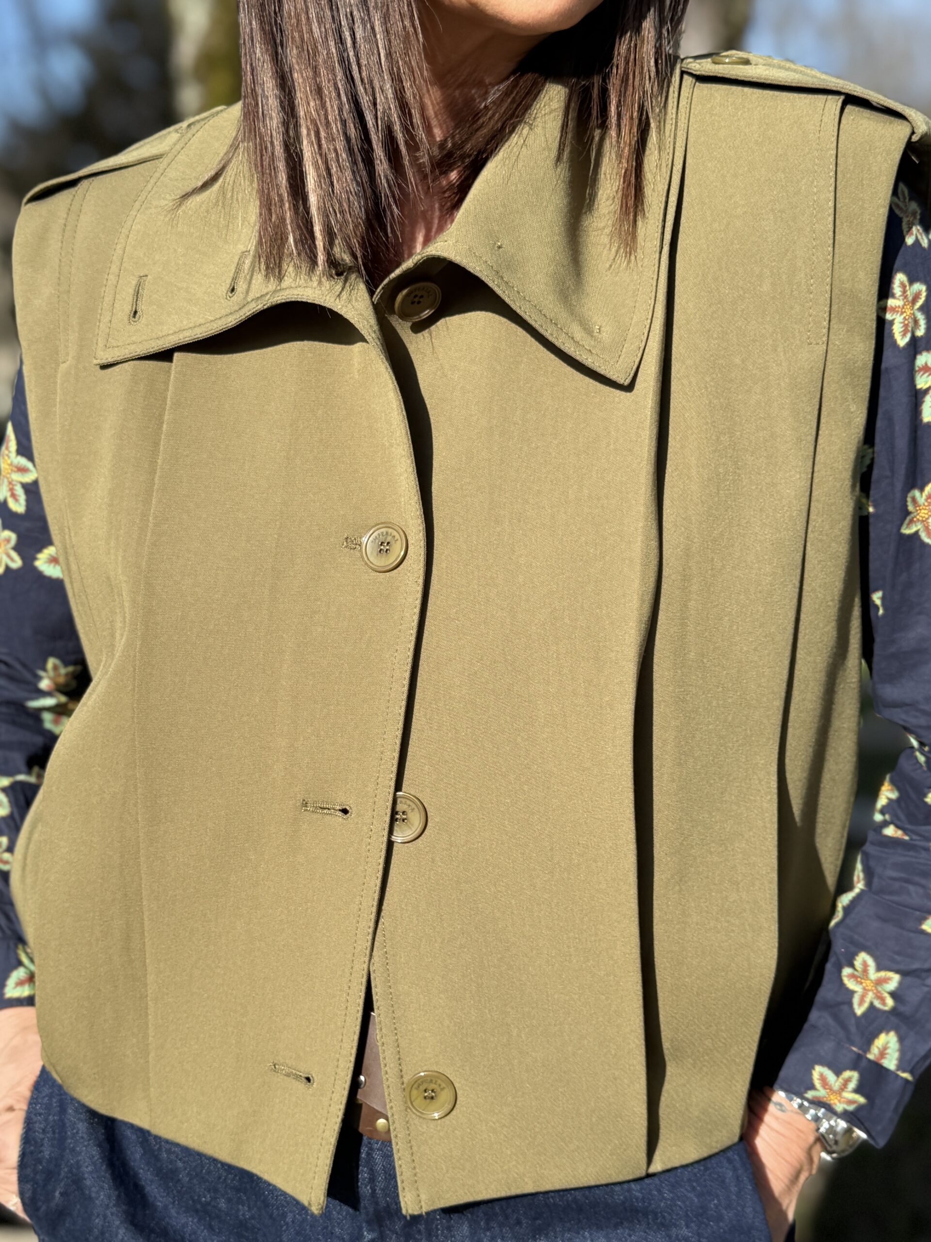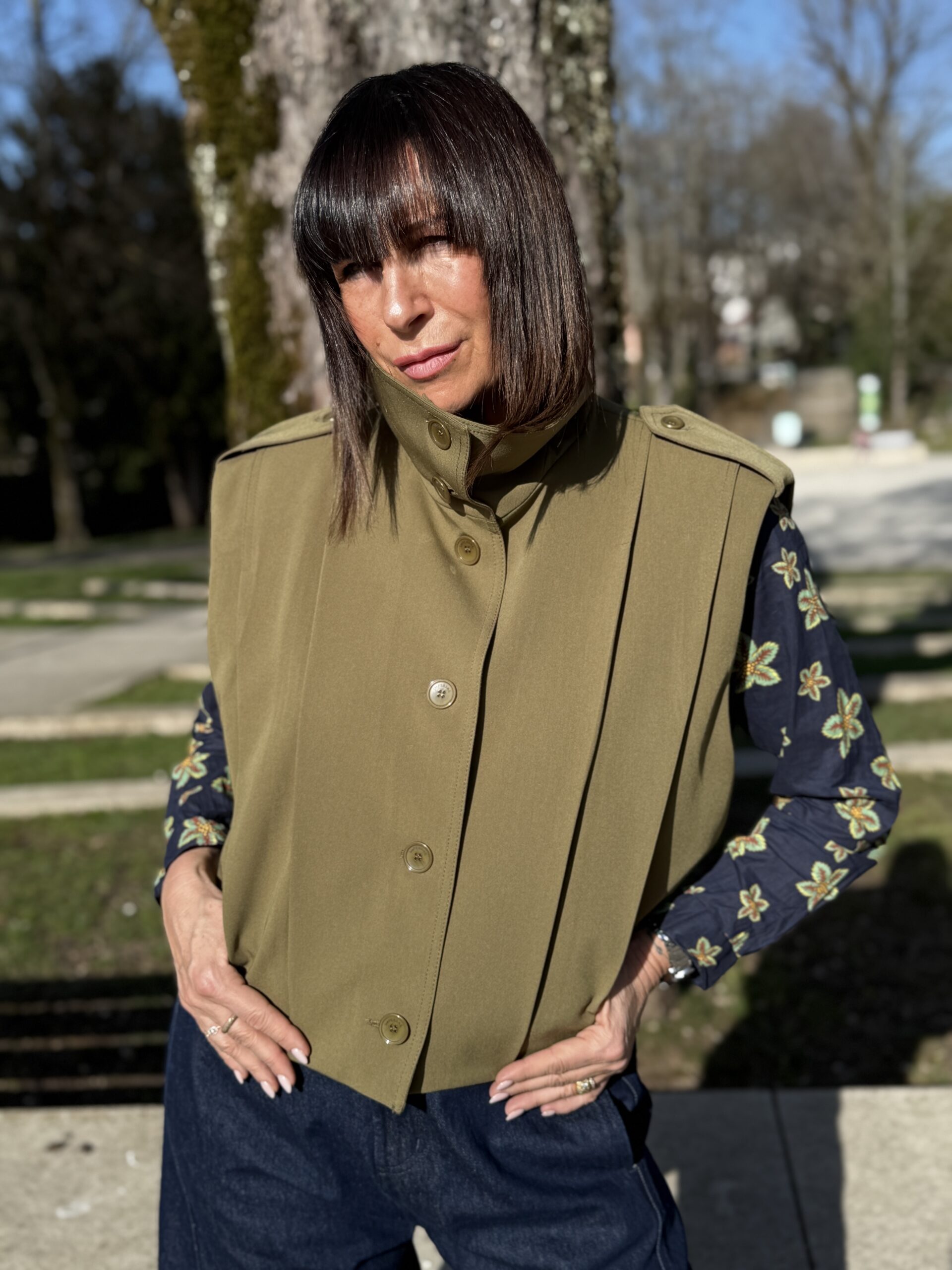 Gilet sans manches à l’esthétique tailoring et utilitaire, cette pièce se distingue par sa construction architecturée et son col montant affirmé. Les plis verticaux sculptent la silhouette tandis que les pattes d’épaules inspirées du vestiaire militaire renforcent son caractère mode et contemporain.