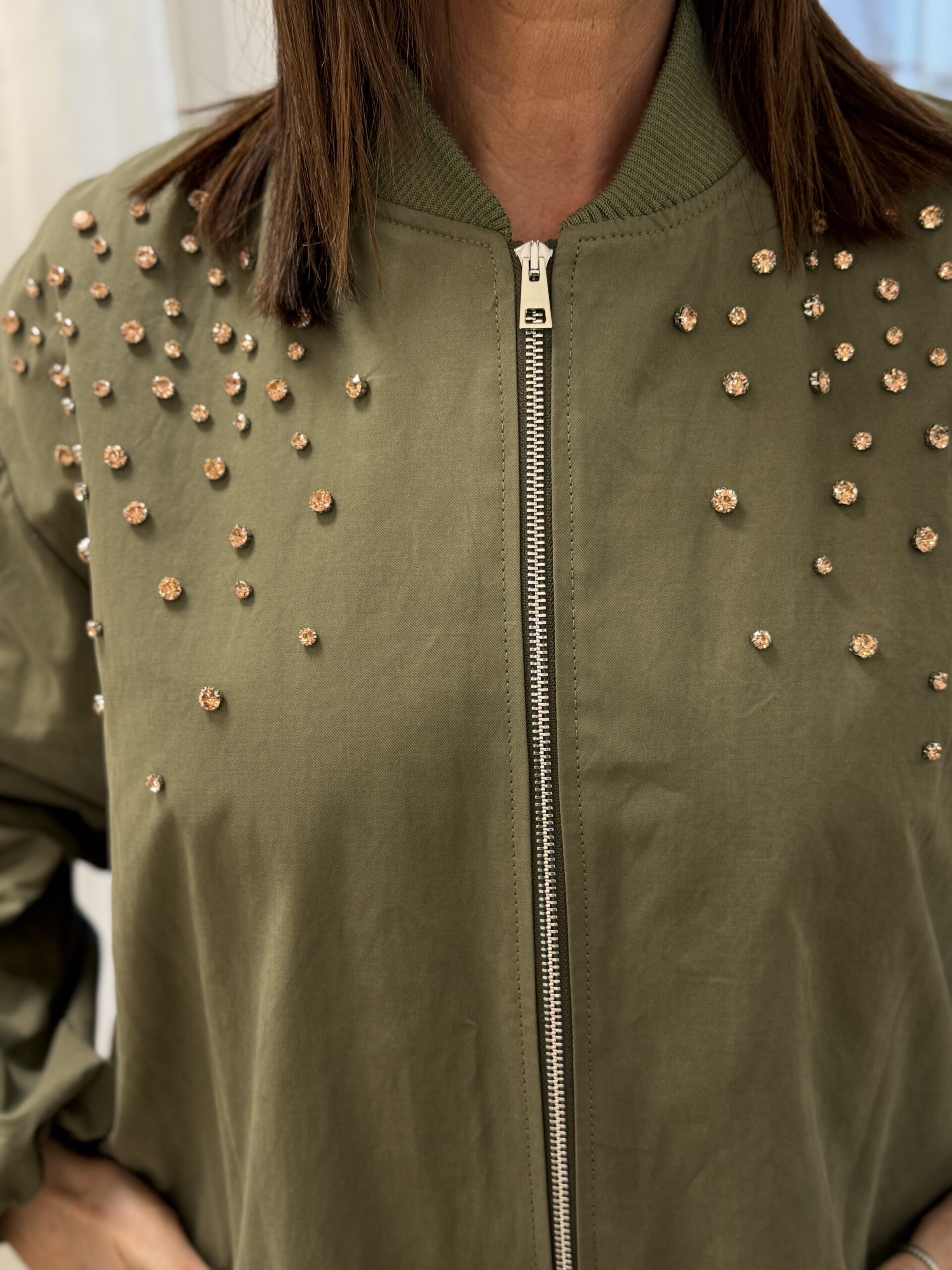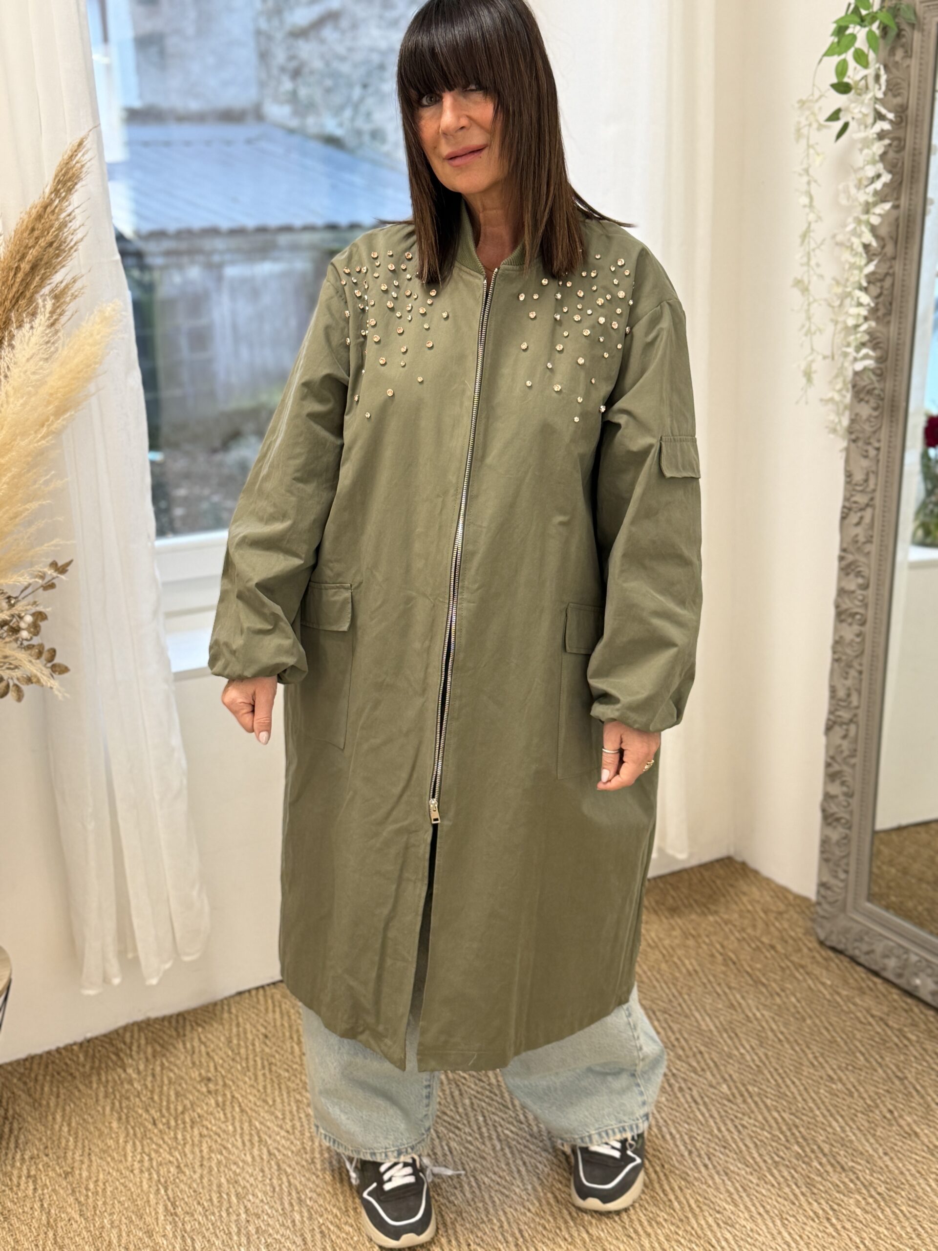 Manteau long esprit bomber kaki à strass KIKISIX