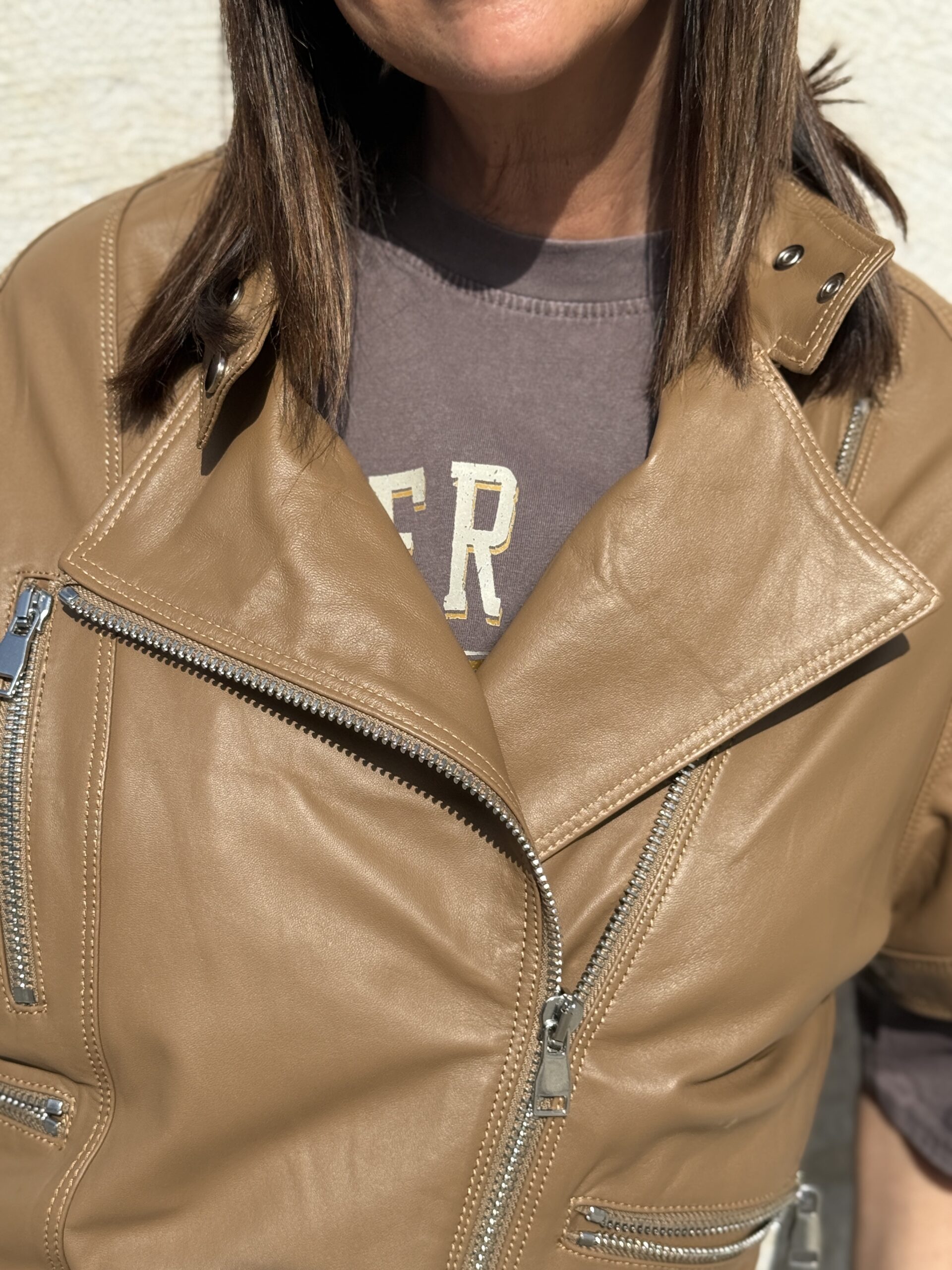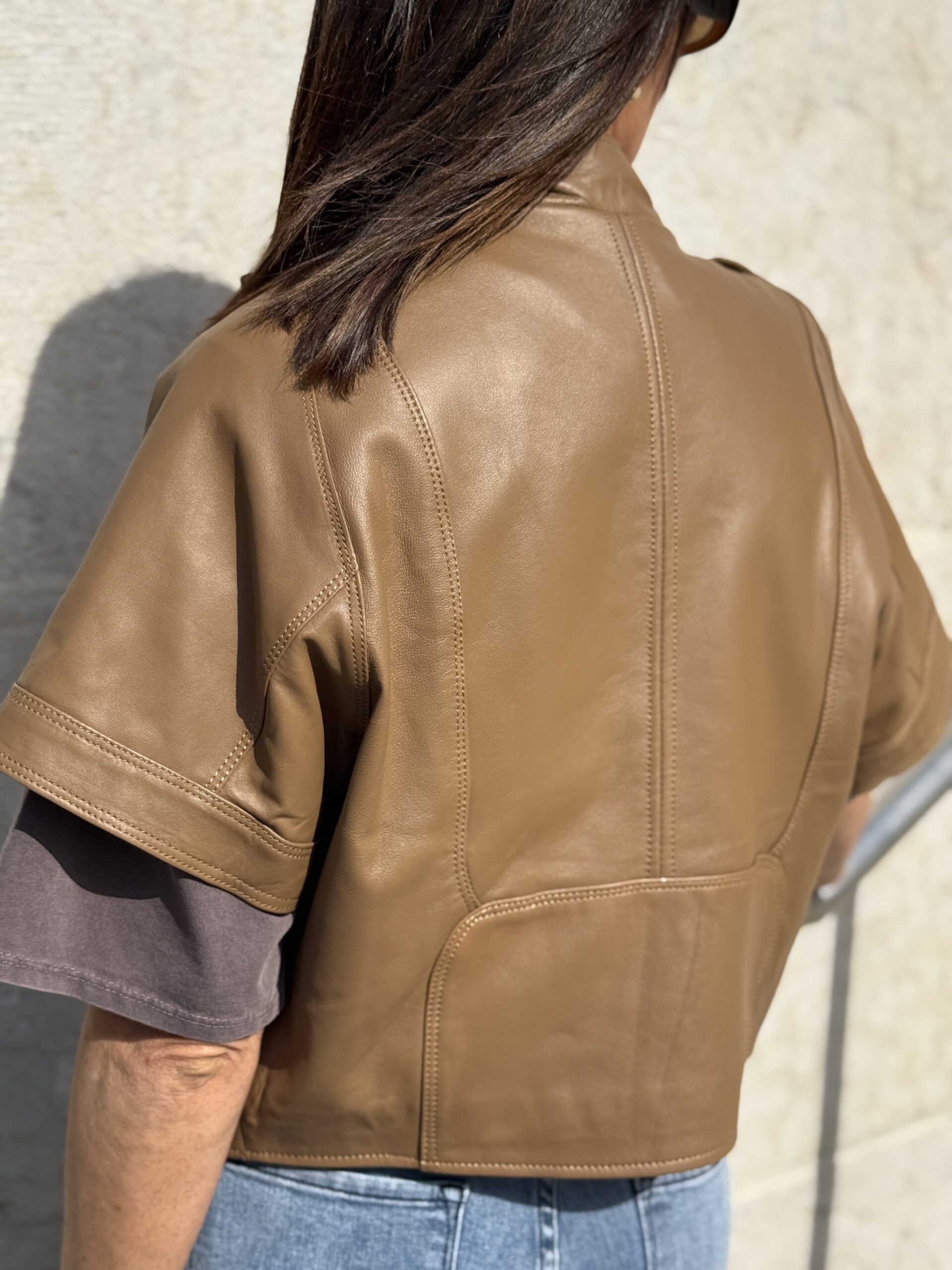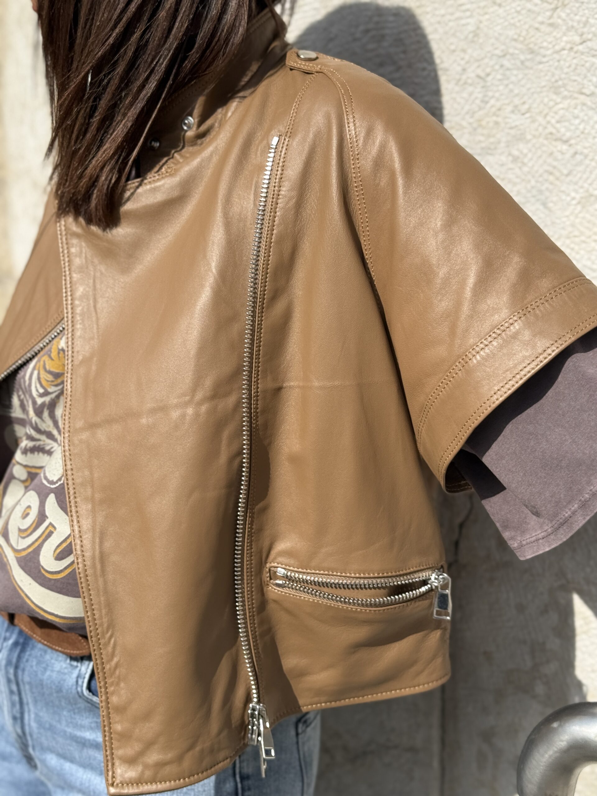 Le Perfecto manches courtes en cuir camel est une pièce forte qui apporte immédiatement du caractère à une tenue!