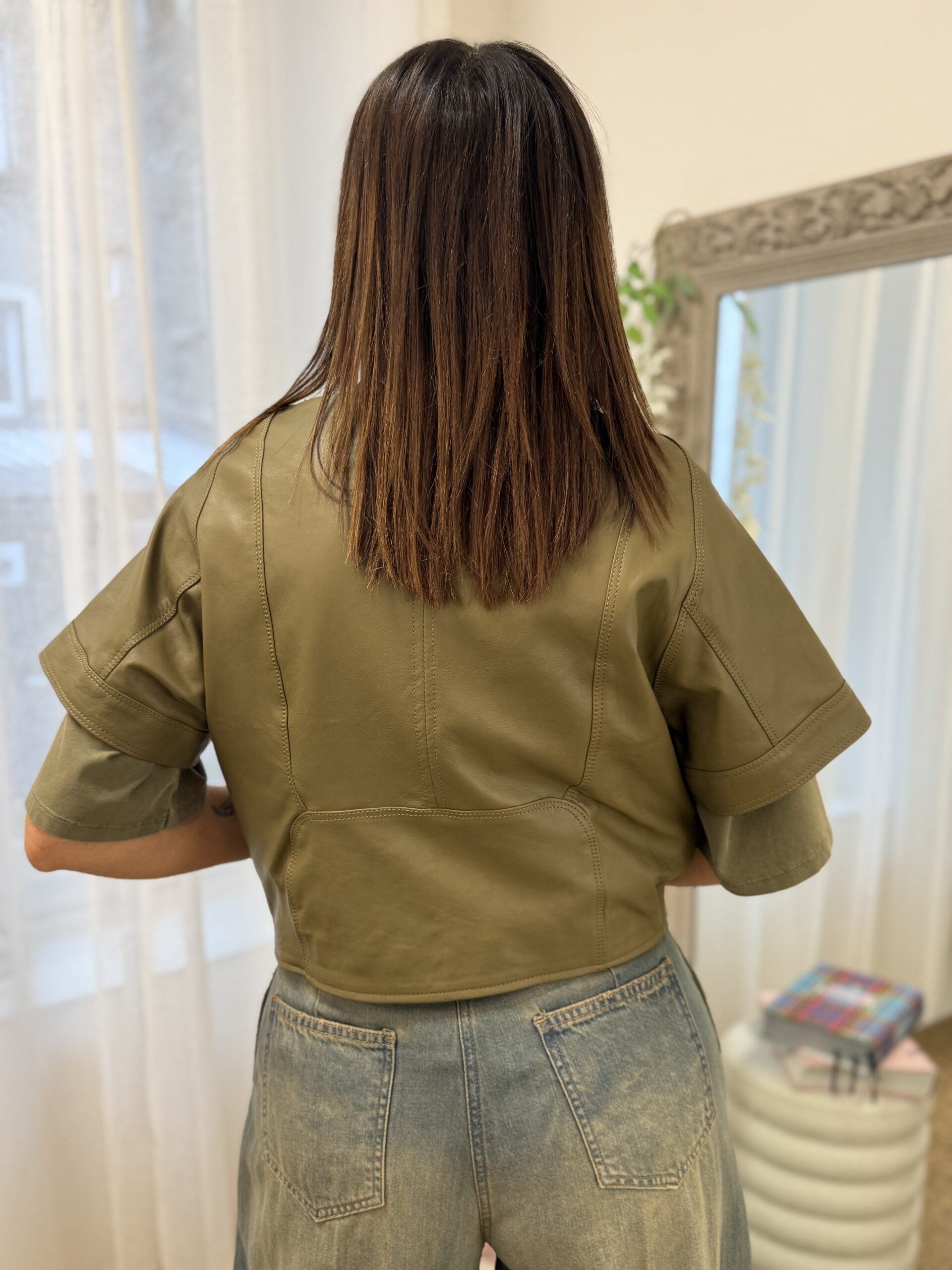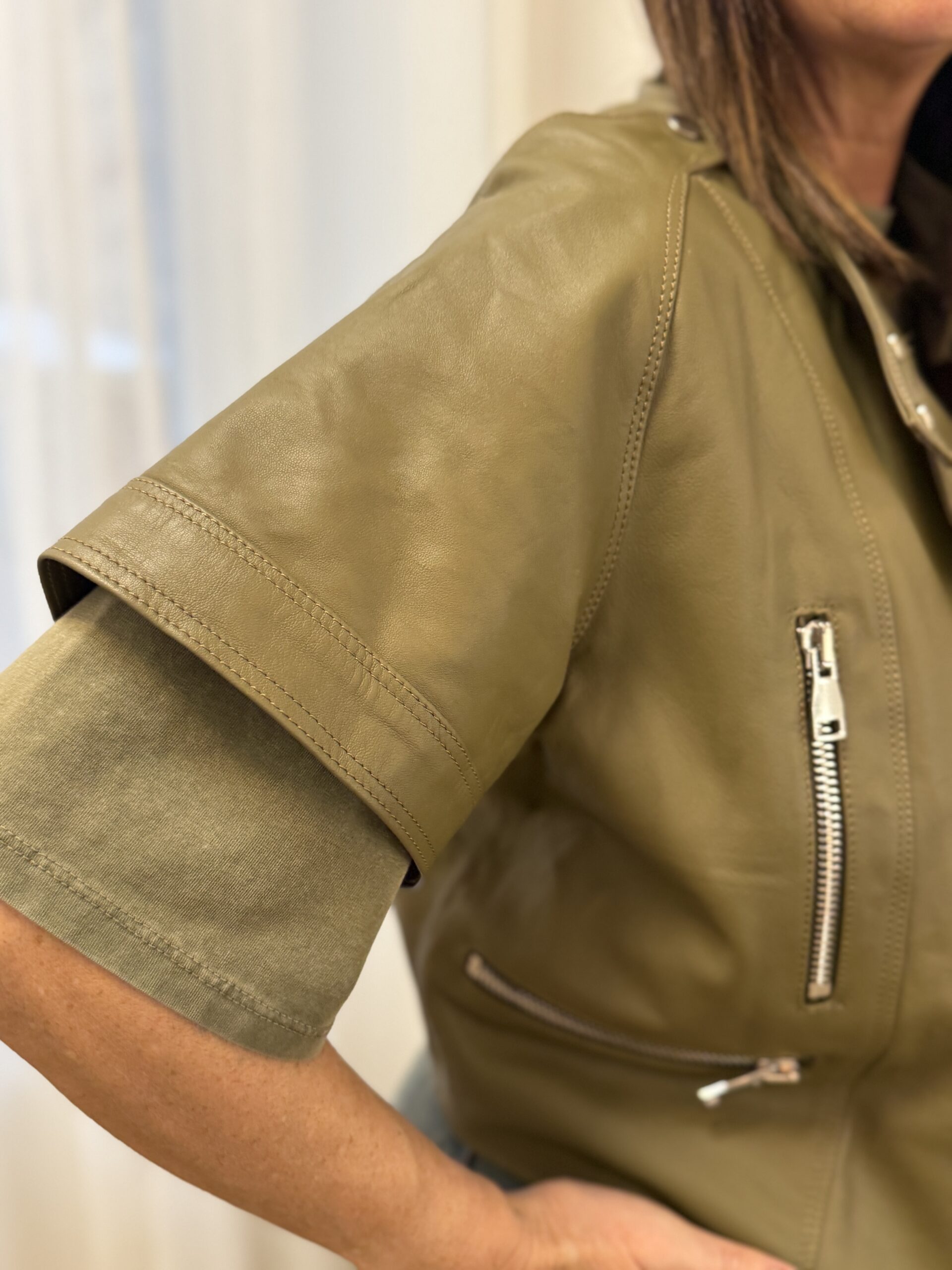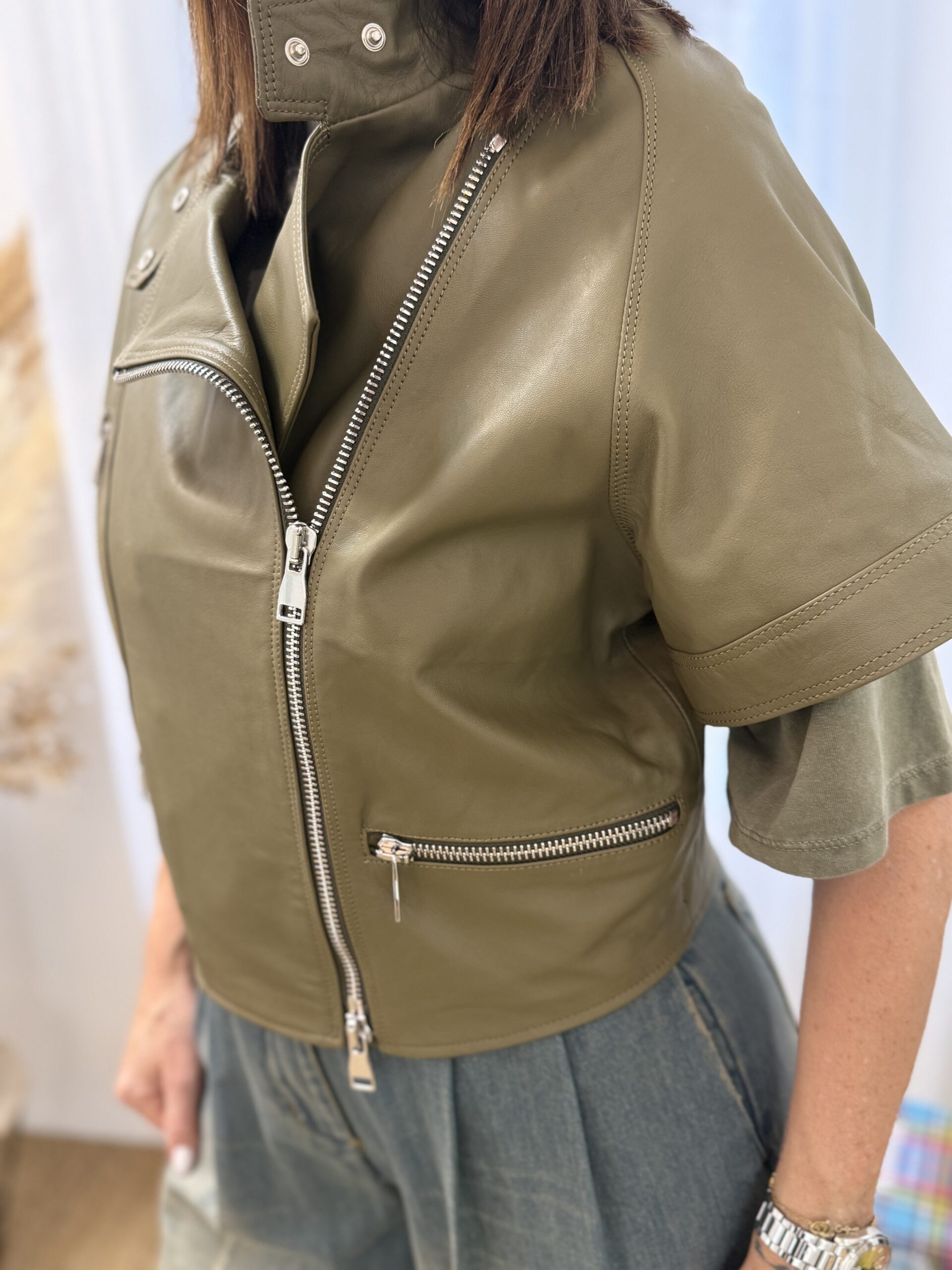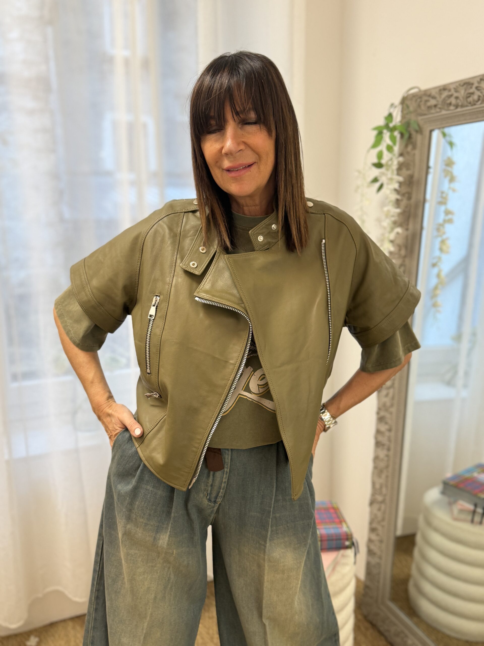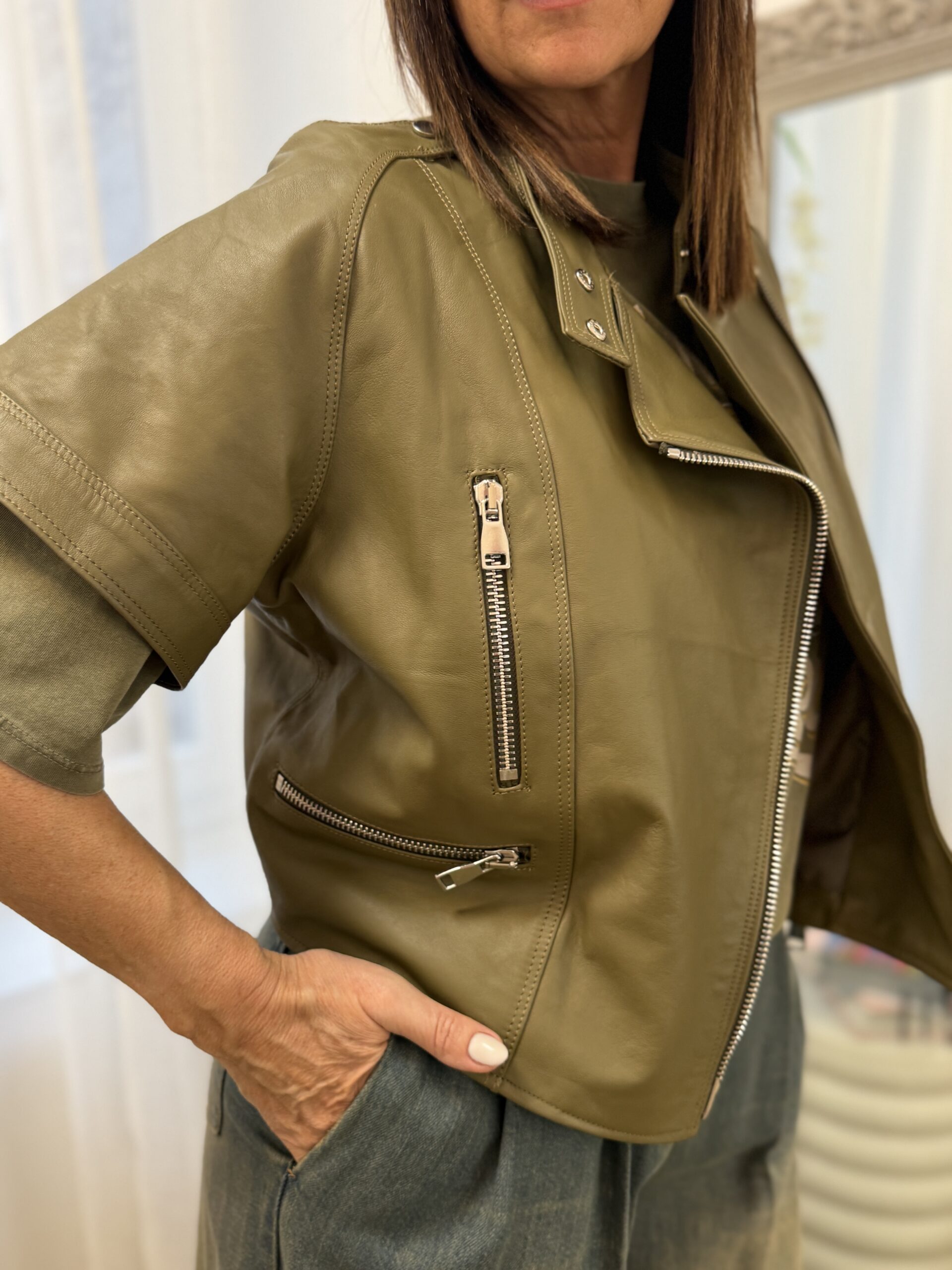 Le Perfecto manches courtes en cuir kaki est une pièce forte qui apporte immédiatement du caractère à une tenue!
