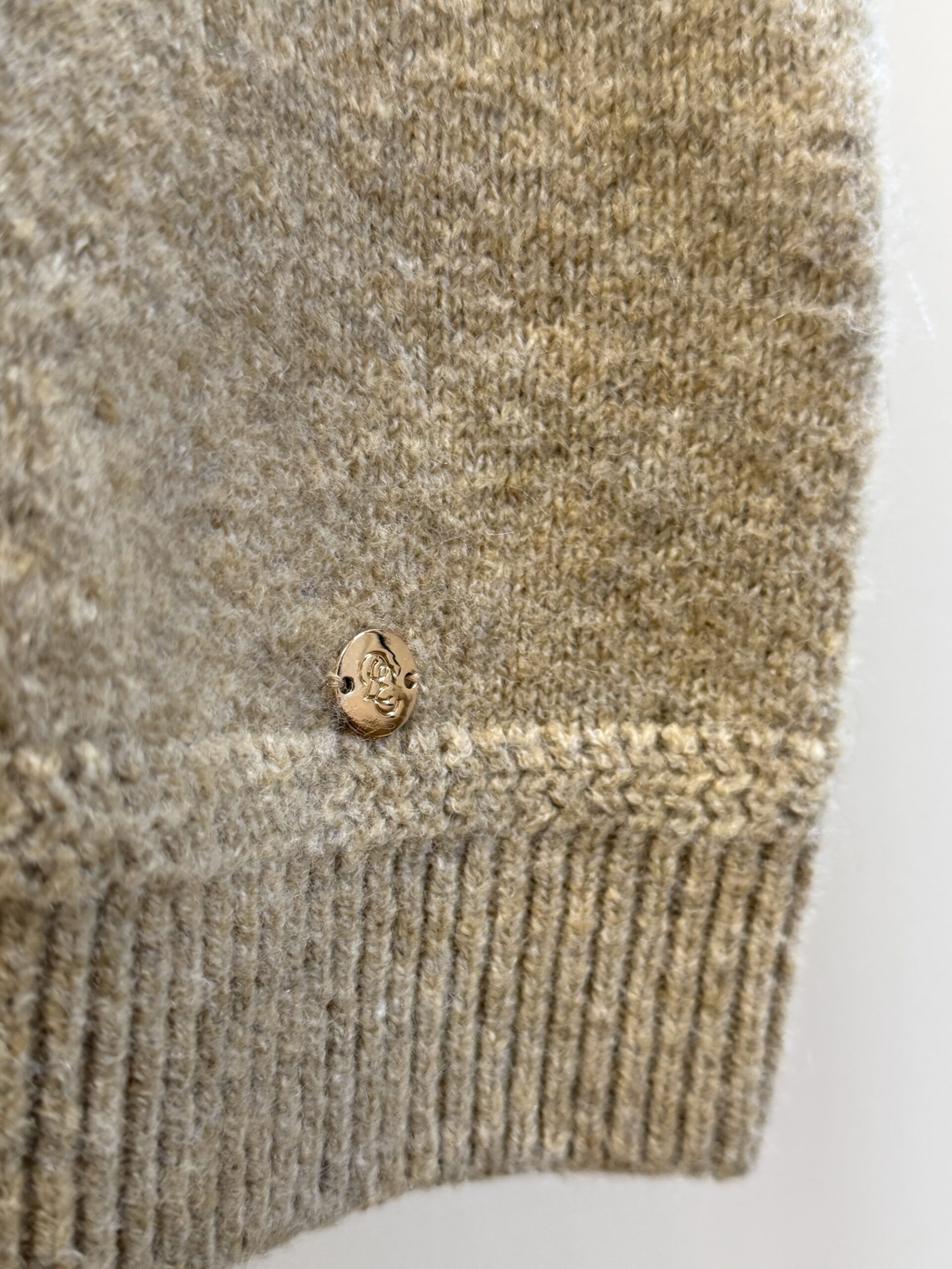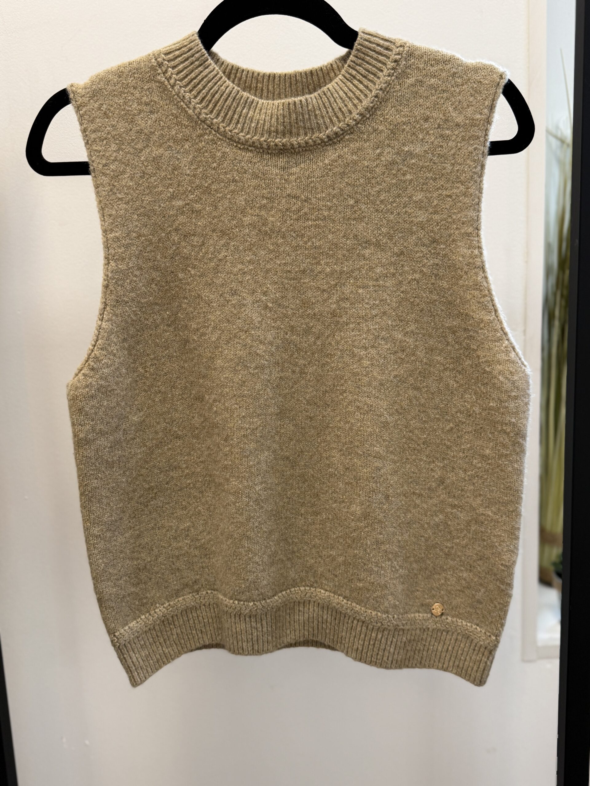 Ce pull sans manches en maille camel , est à la fois tendance et confortable.