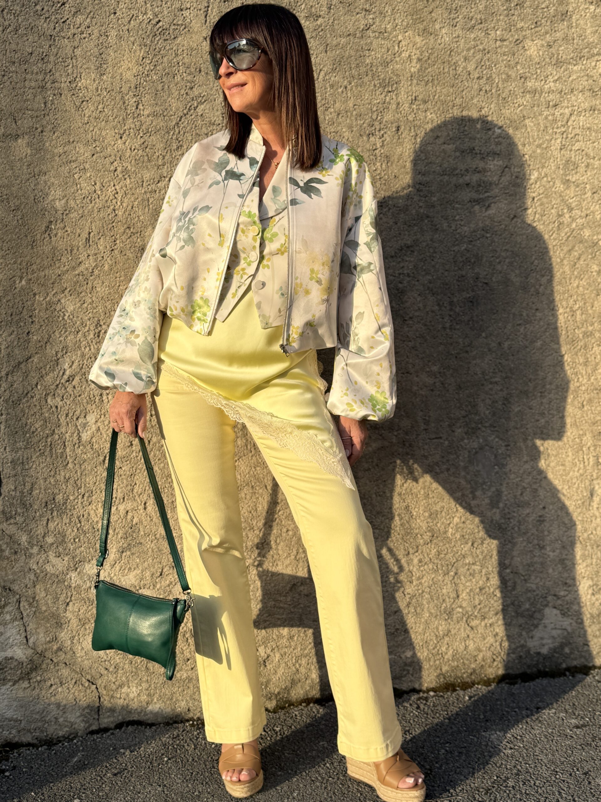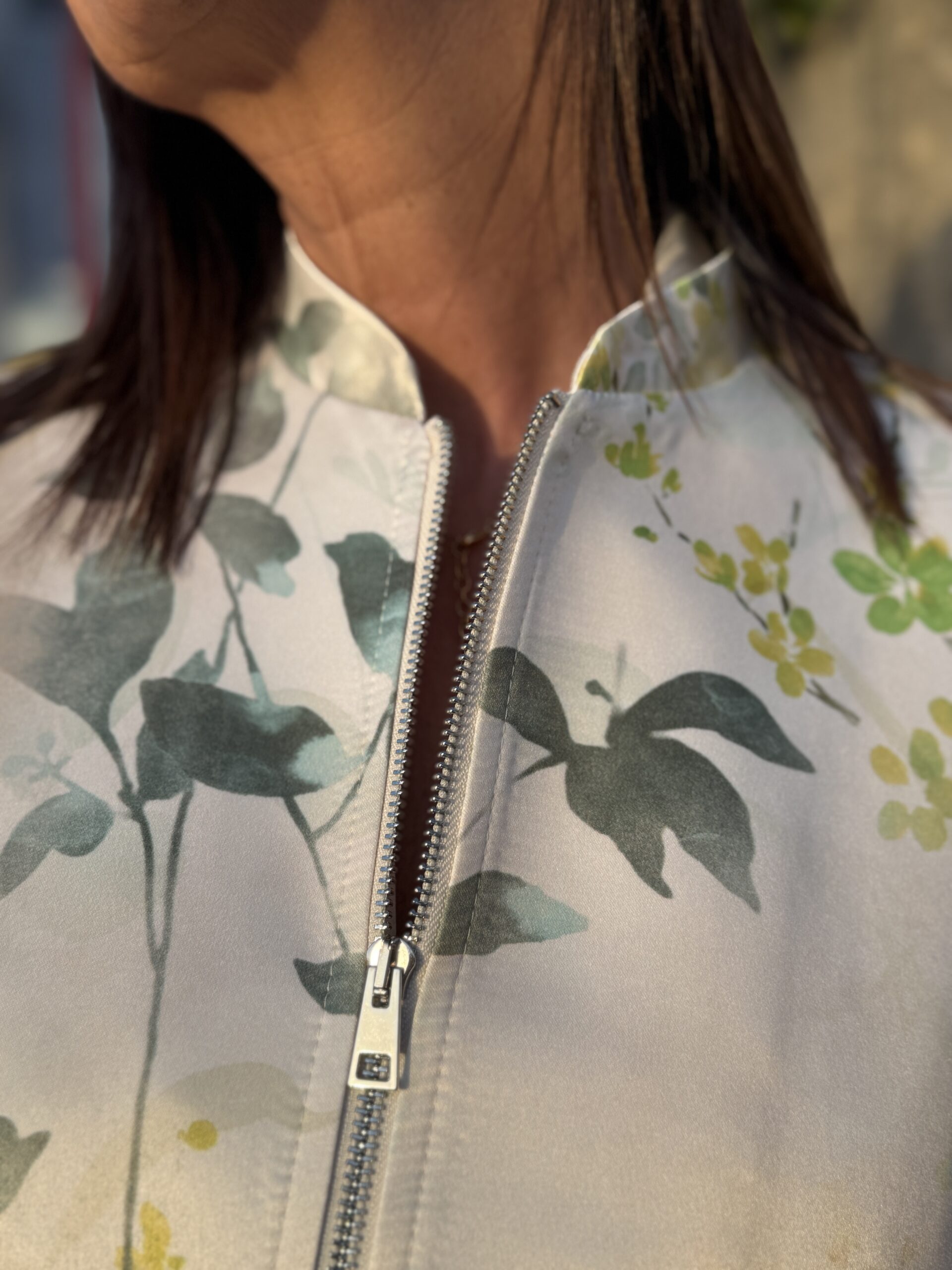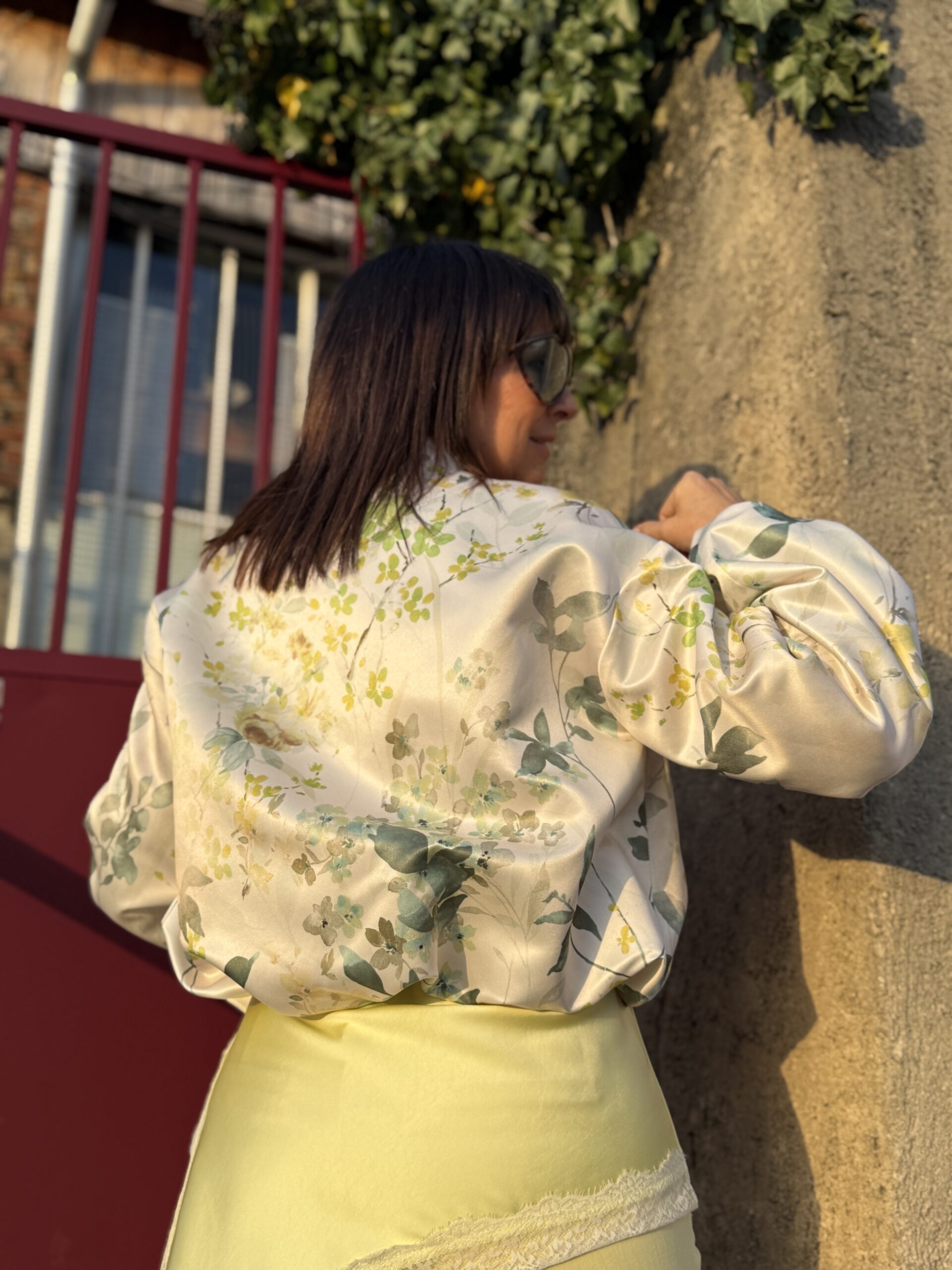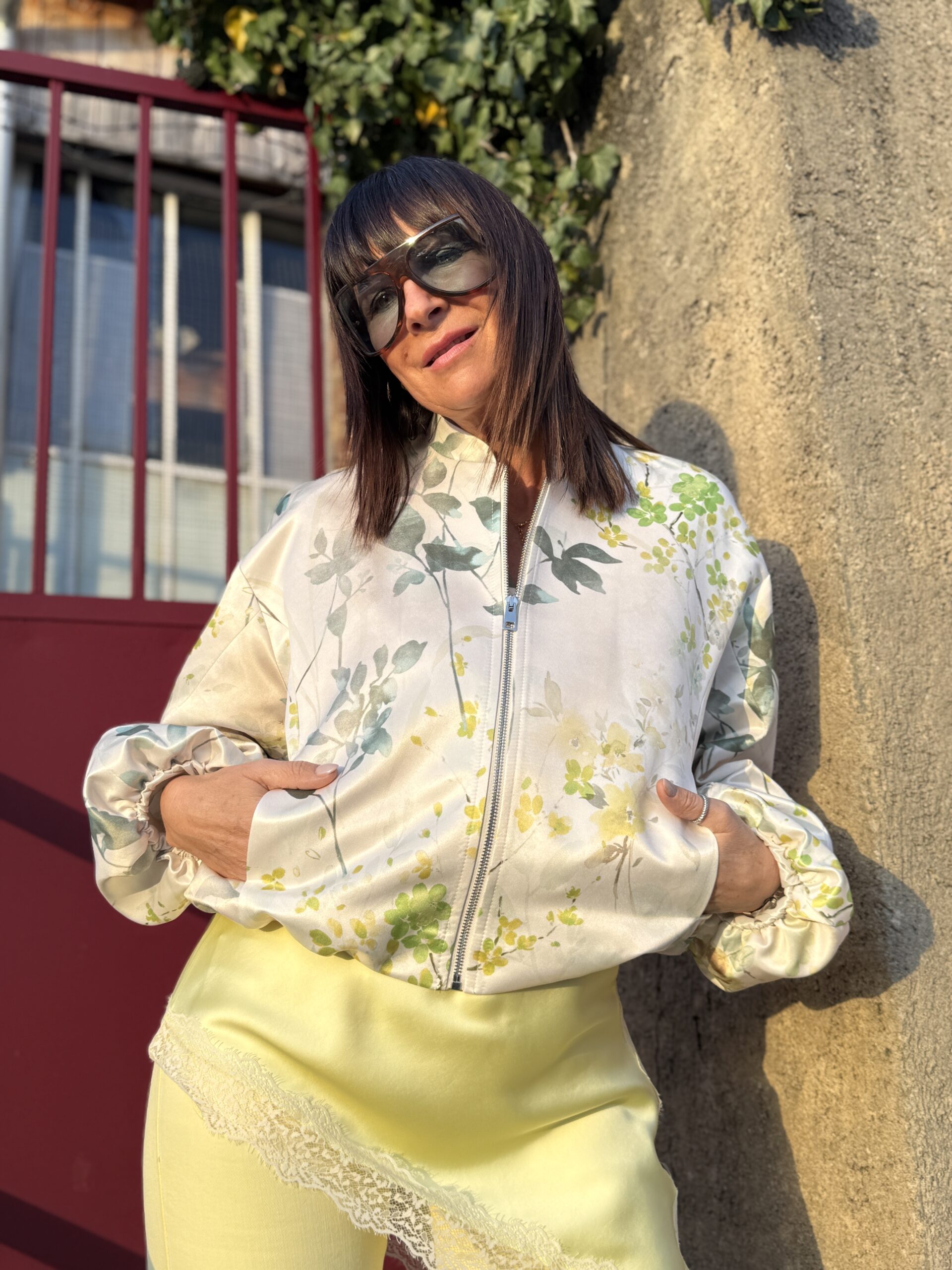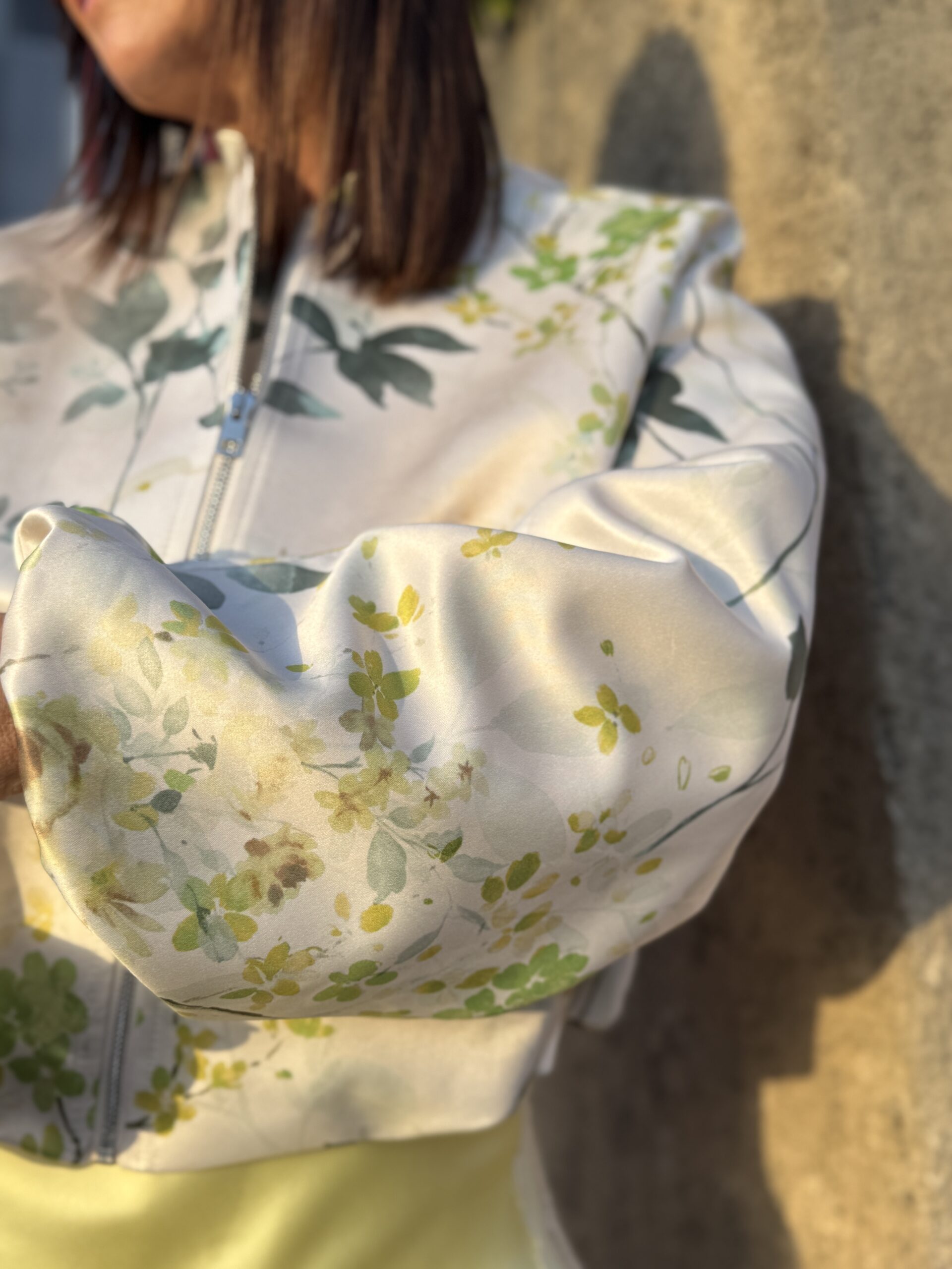 Veste courte esprit bomber au motif loral délicat dans des tons verts et jaunes sur fond écru, idéale pour apporter fraîcheur et féminité à vos looks de saison.
