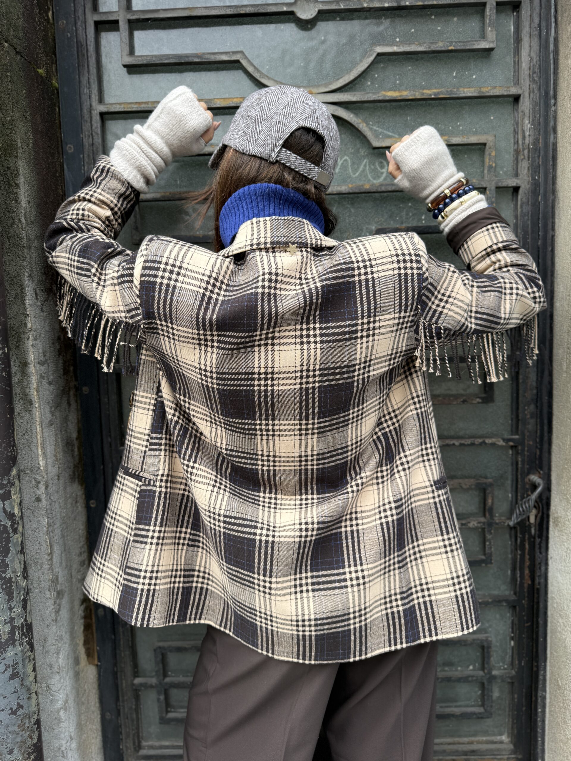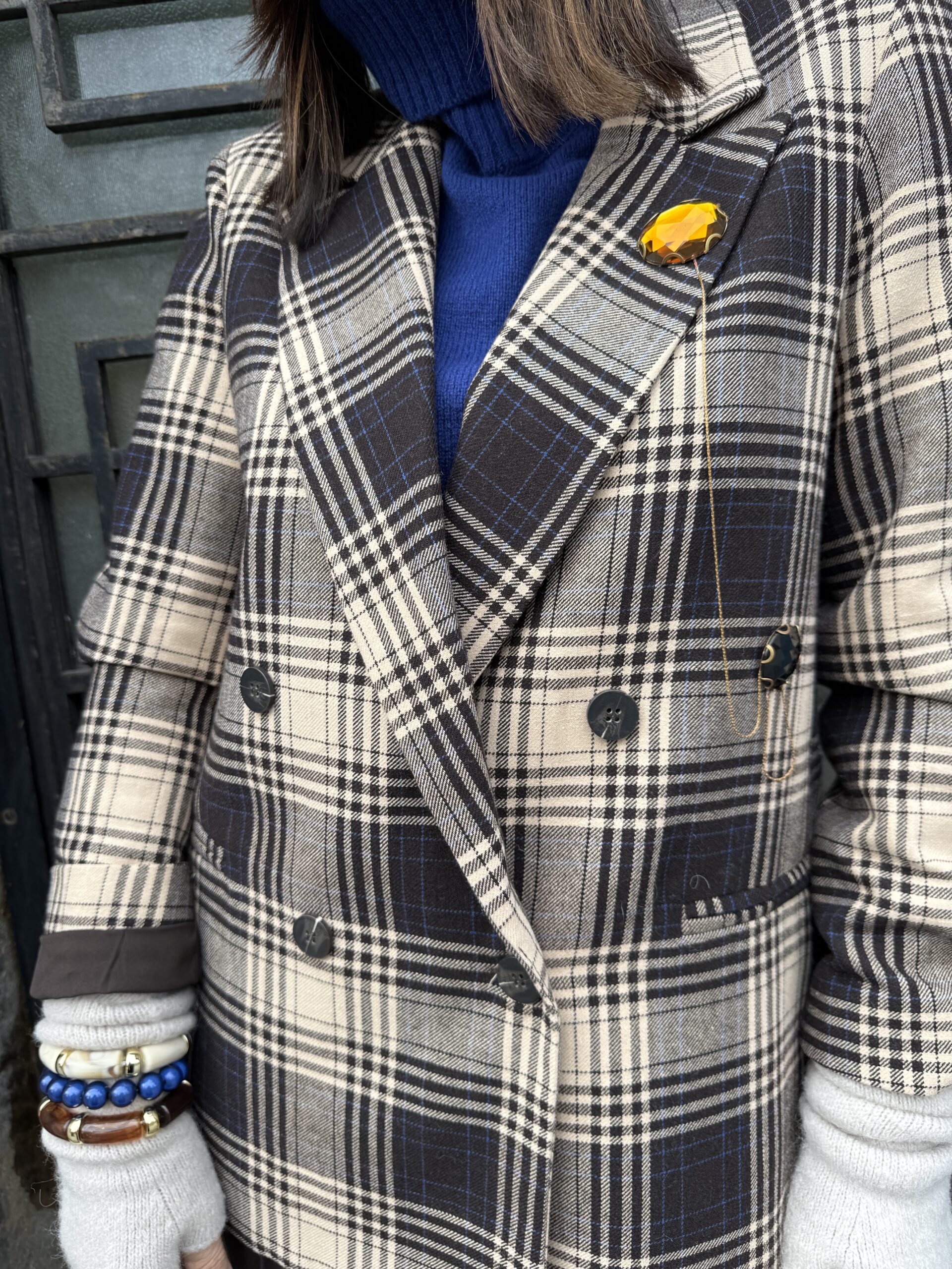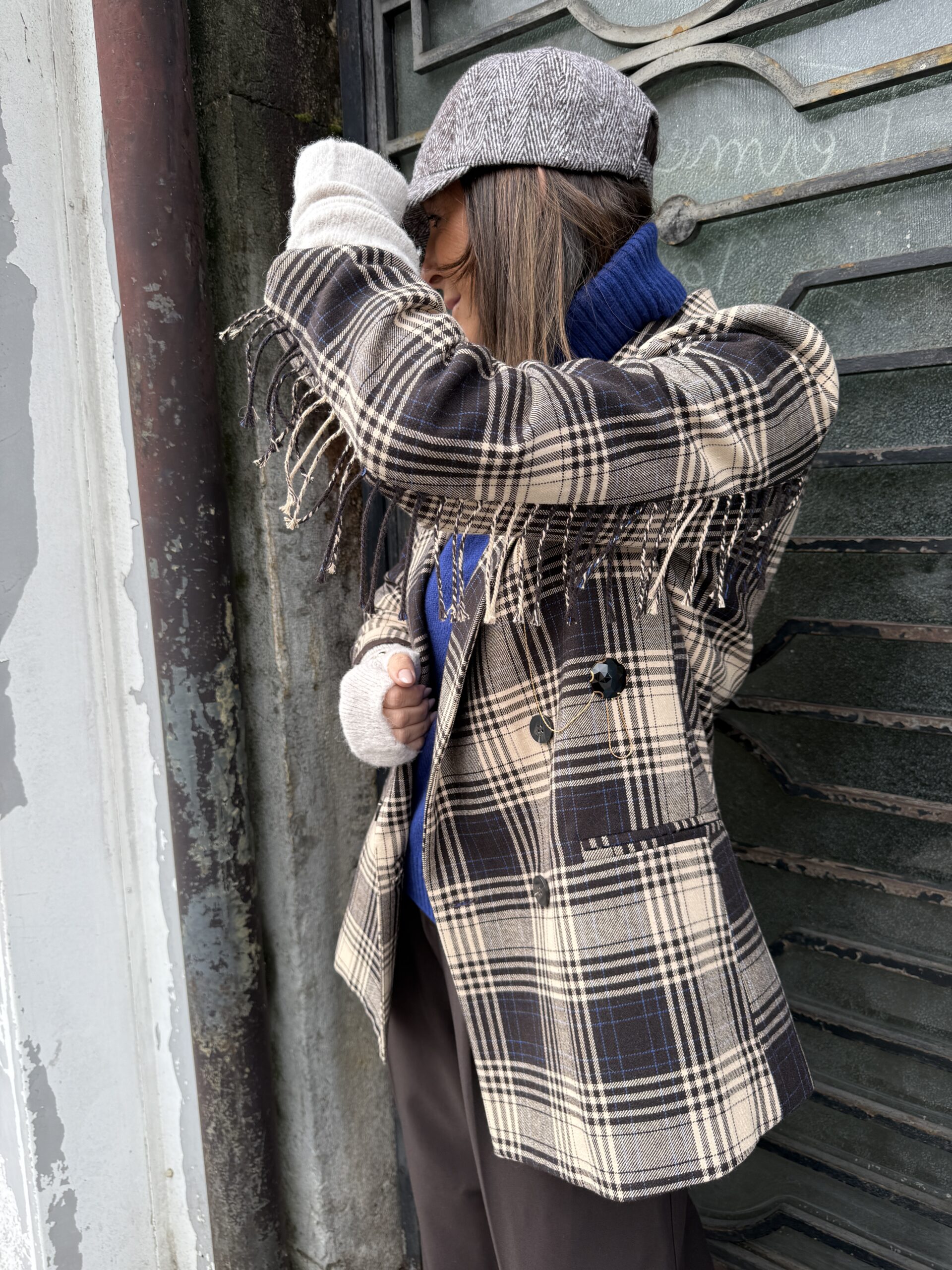 Cette veste à carreaux beige, marron et noir allie raffinement et originalité. Elle est parfaite pour une femme moderne qui aime mixer les matières et imprimés