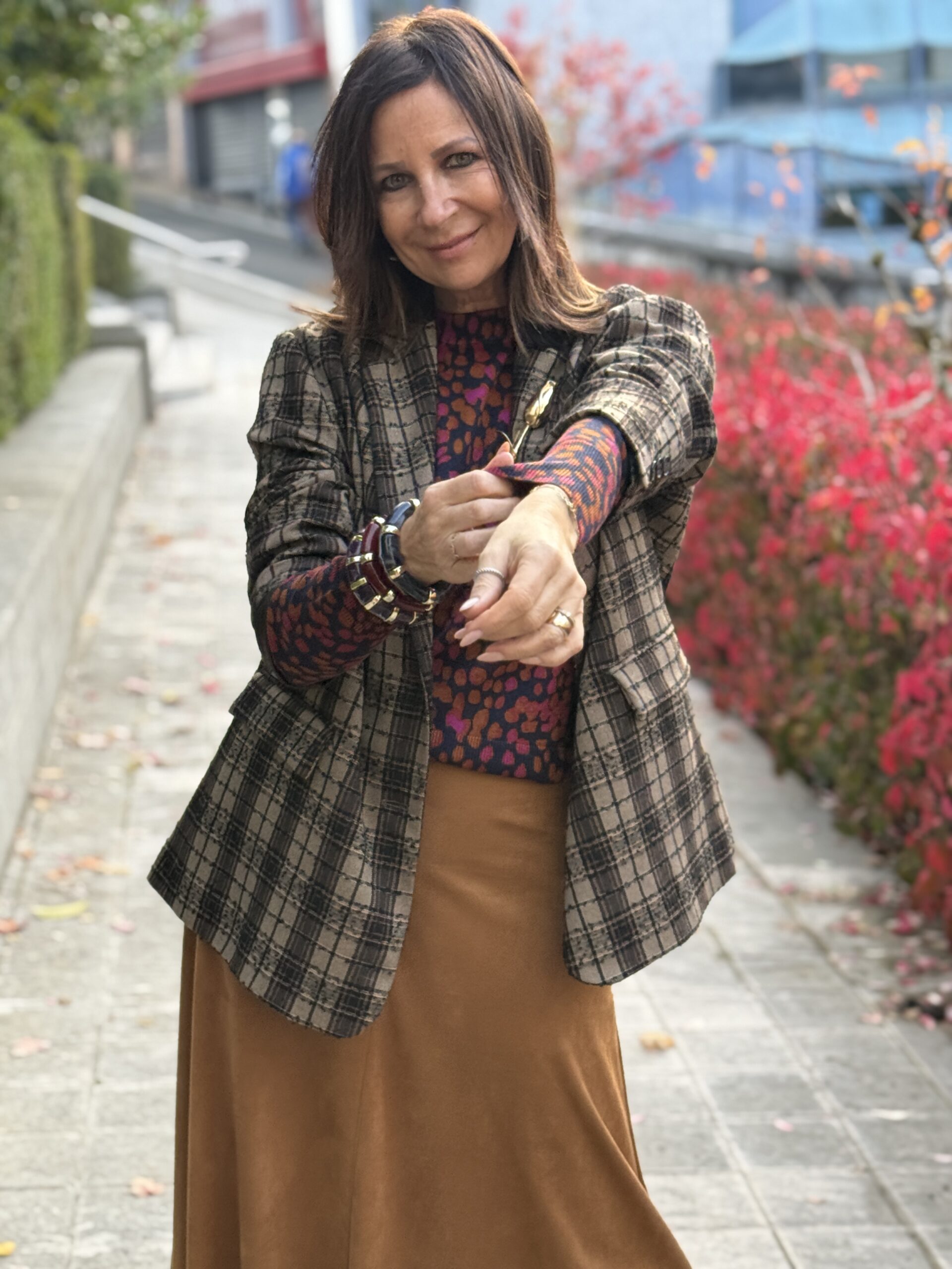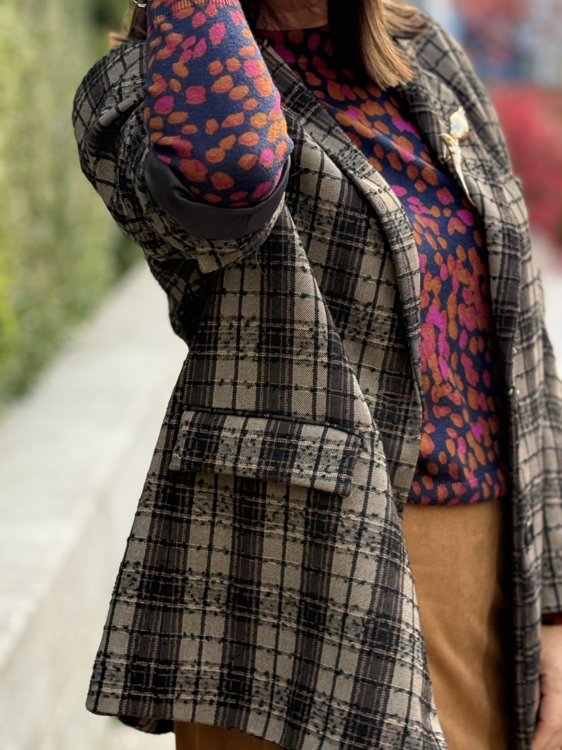 Adoptez un style chic et facile à porter avec cette veste à carreaux aux tons chauds.