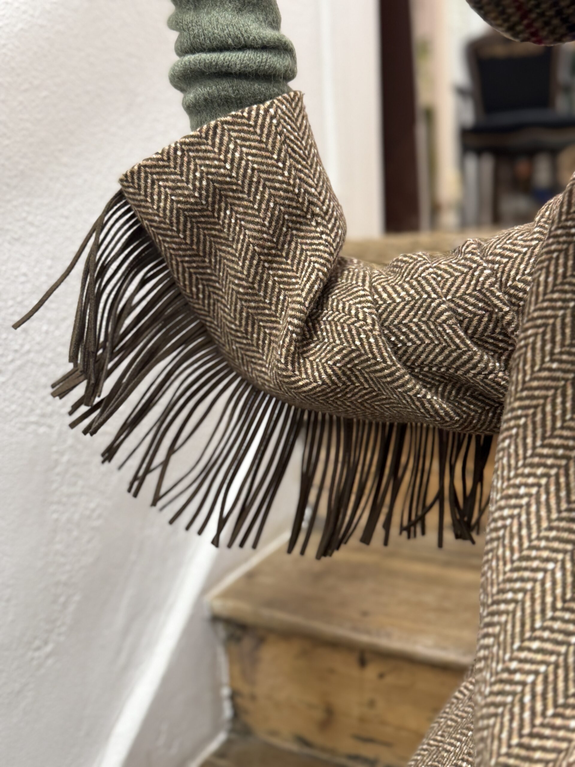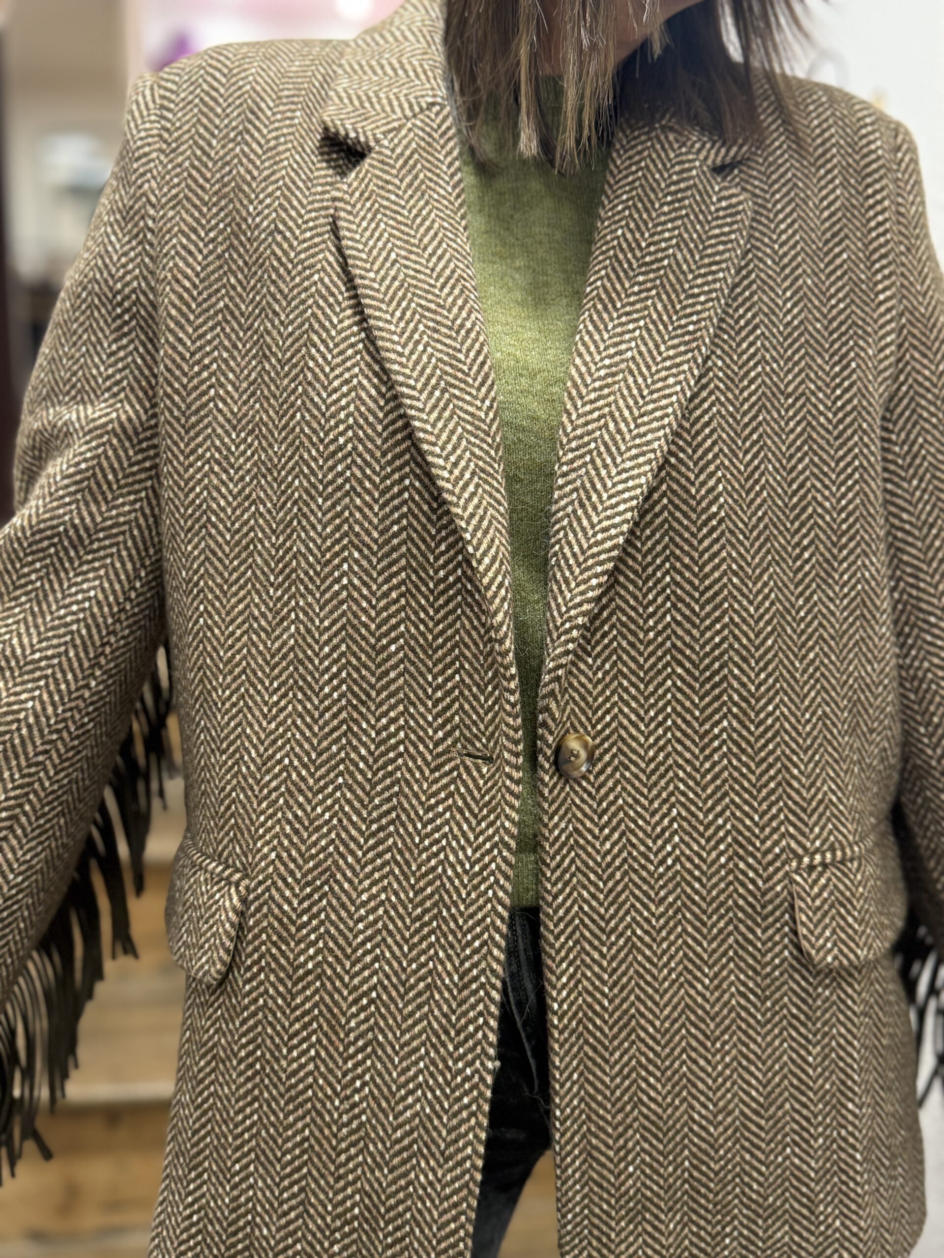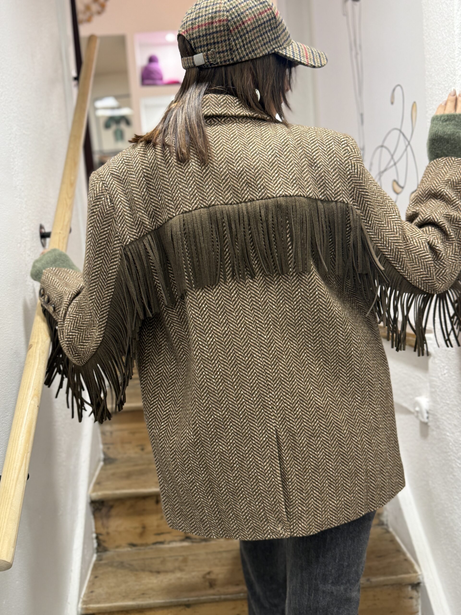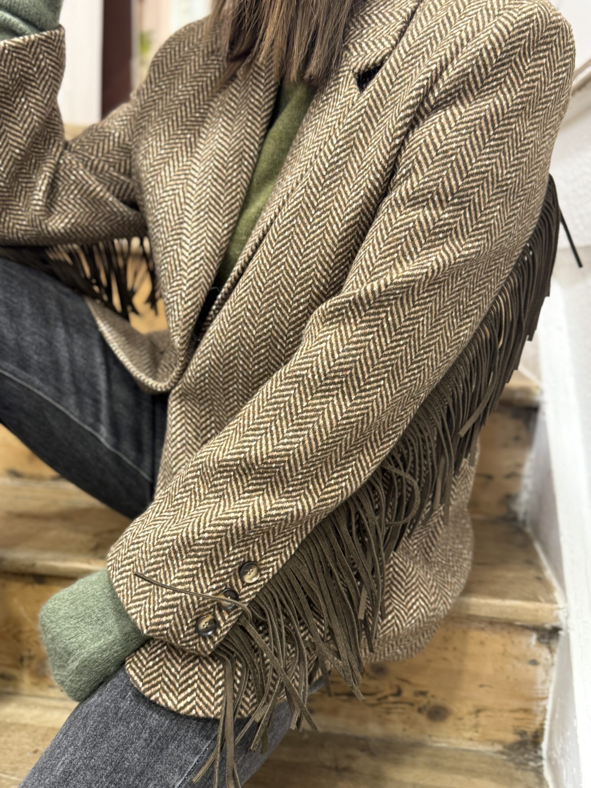 Cette veste blazer à motif chevrons beige et marron est réhaussée par des franges élégantes pour un look à la fois chic, rétro et résolument mode !