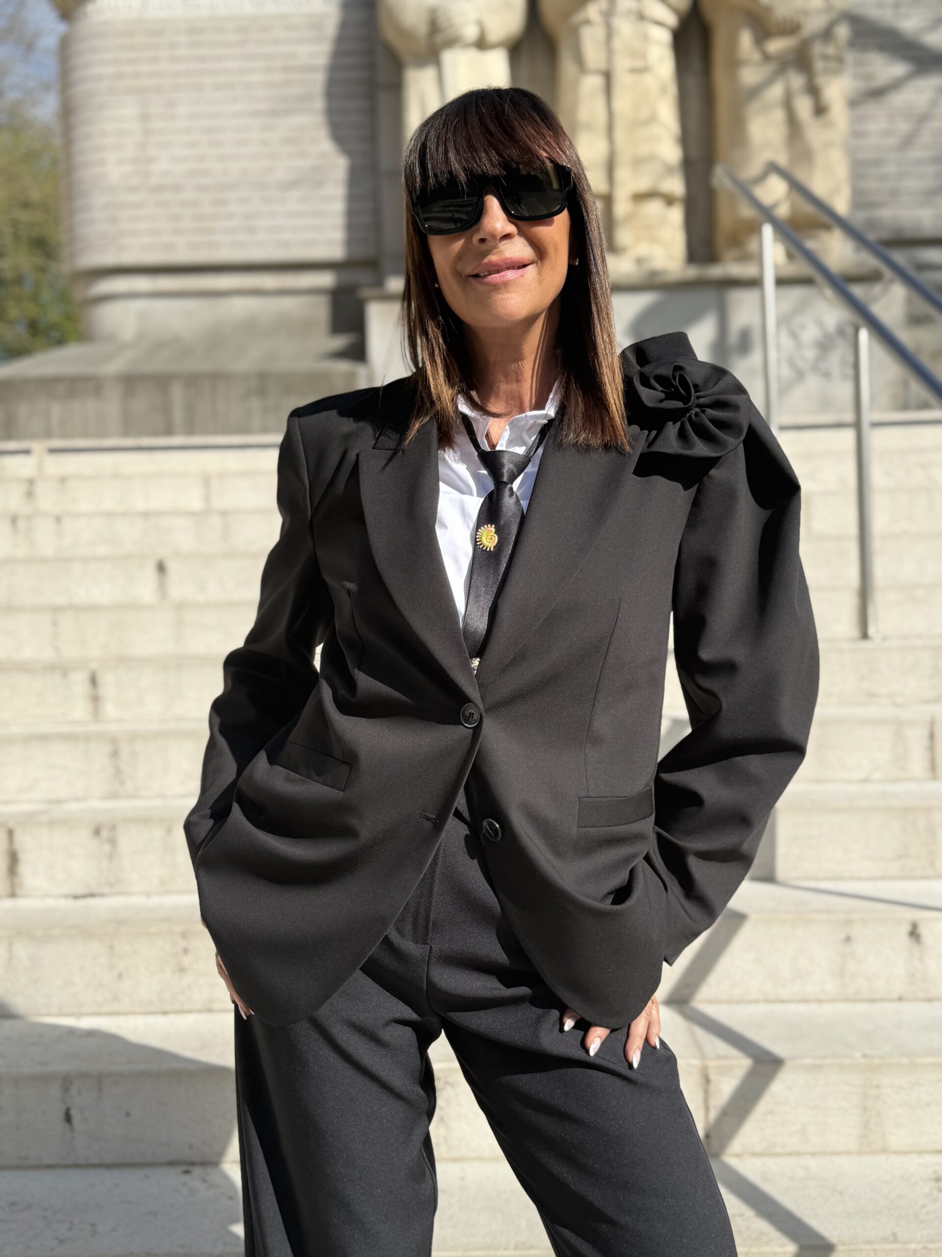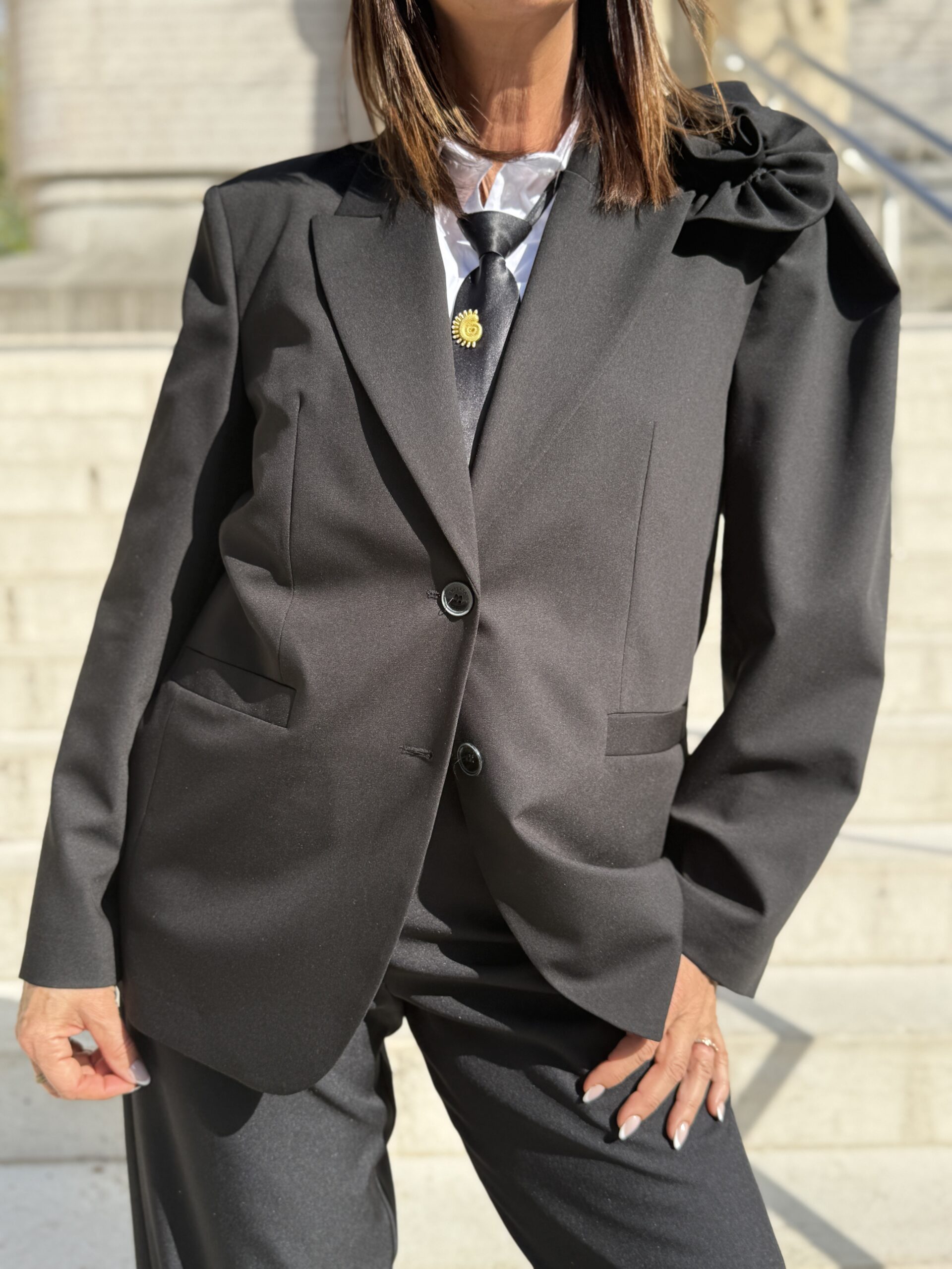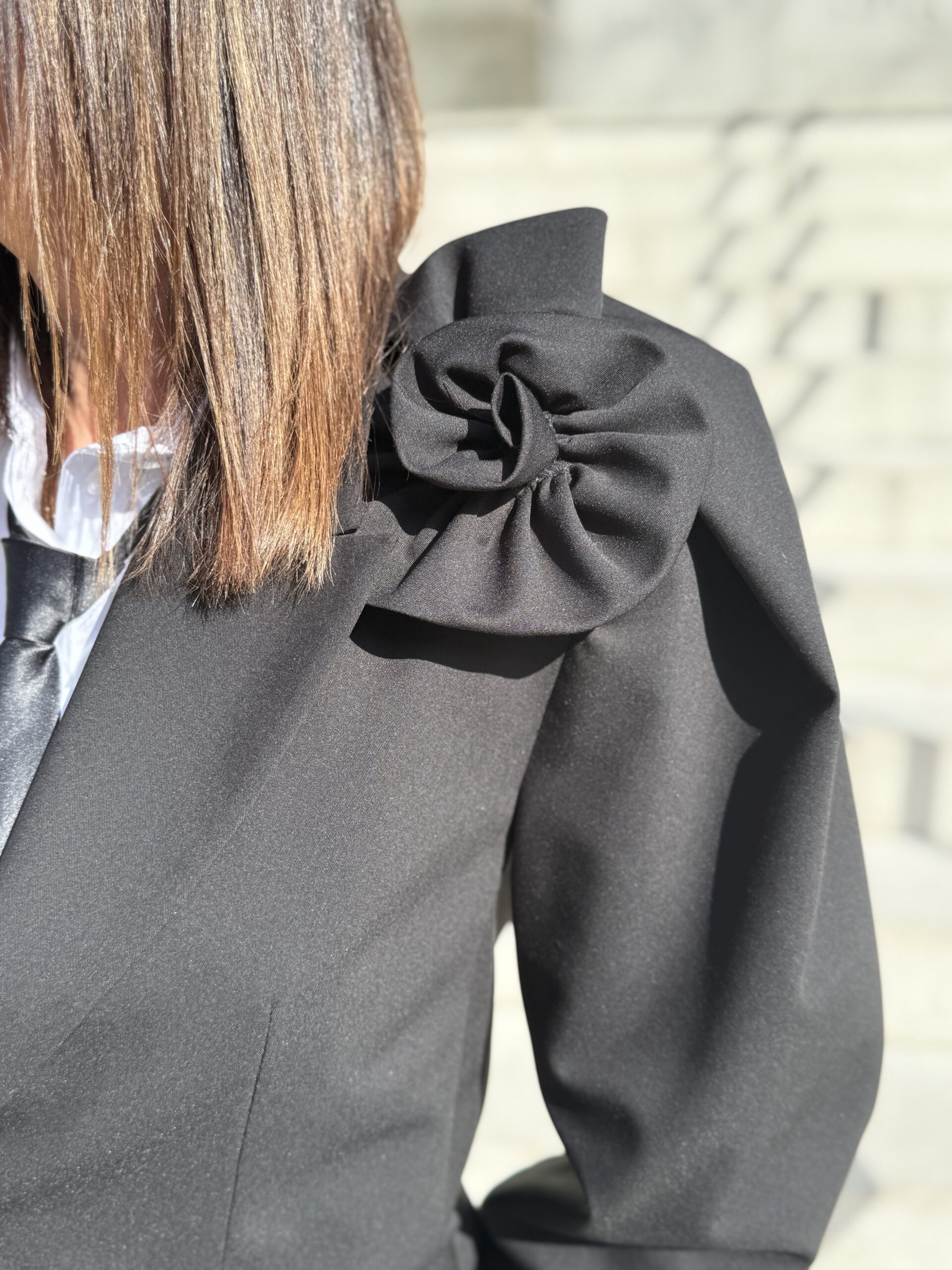 Blazer noir à l’allure tailoring affirmée, cette pièce se distingue par sa coupe structurée et son détail floral oversize appliqué à l’épaule. Elégant et mode, il combine minimaliste et statement design pour une silhouette forte et contemporaine.