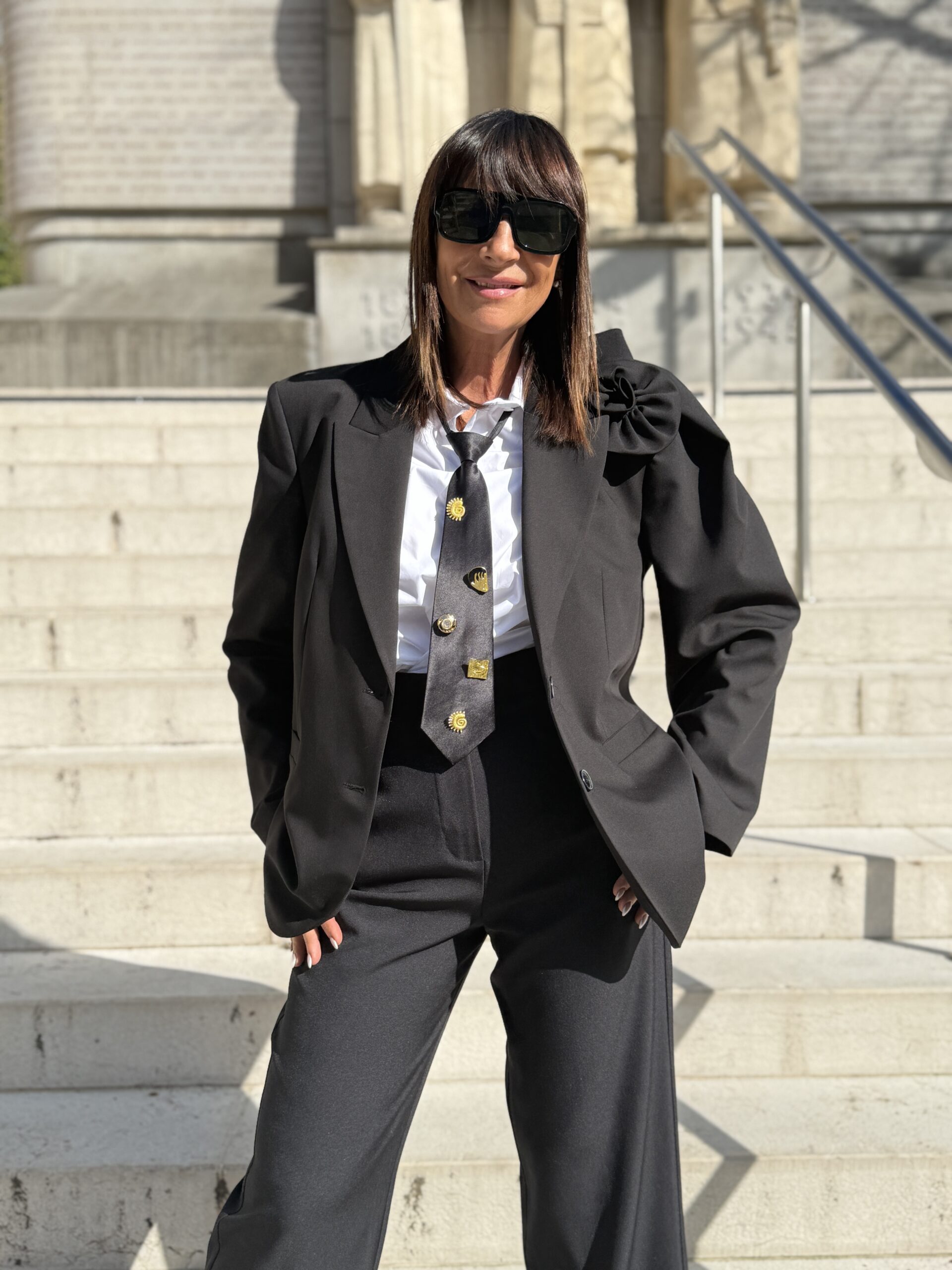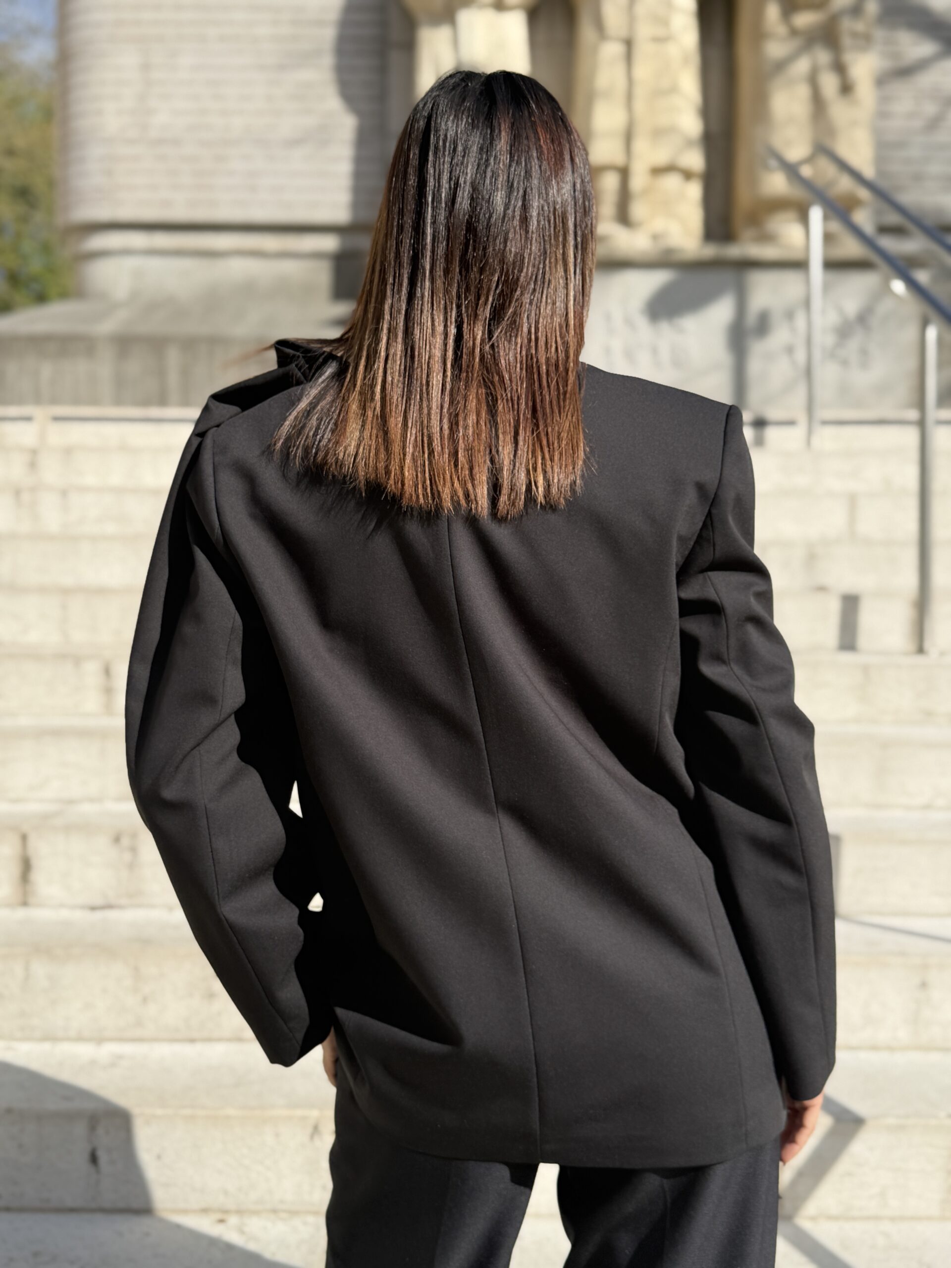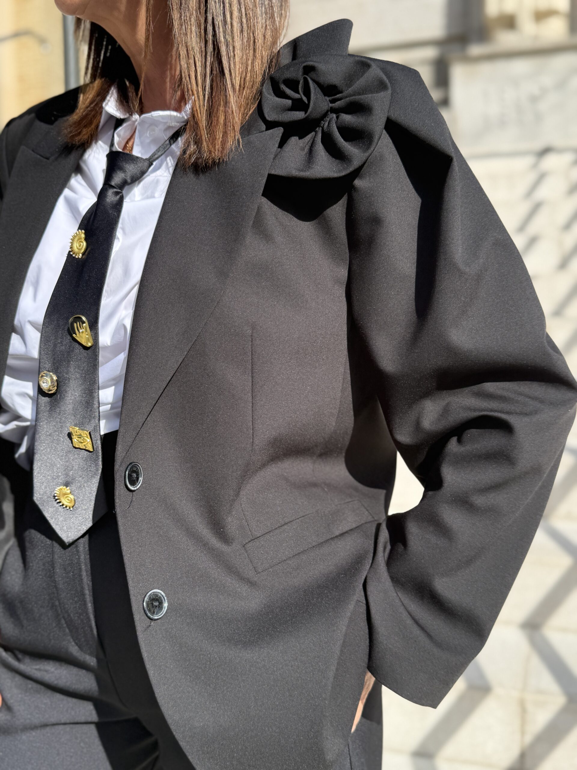 Blazer noir à l’allure tailoring affirmée, cette pièce se distingue par sa coupe structurée et son détail floral oversize appliqué à l’épaule. Elégant et mode, il combine minimaliste et statement design pour une silhouette forte et contemporaine.