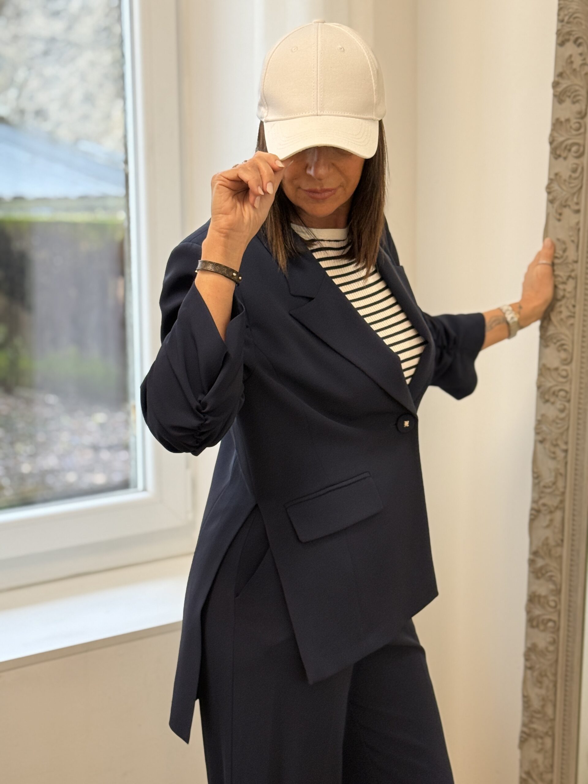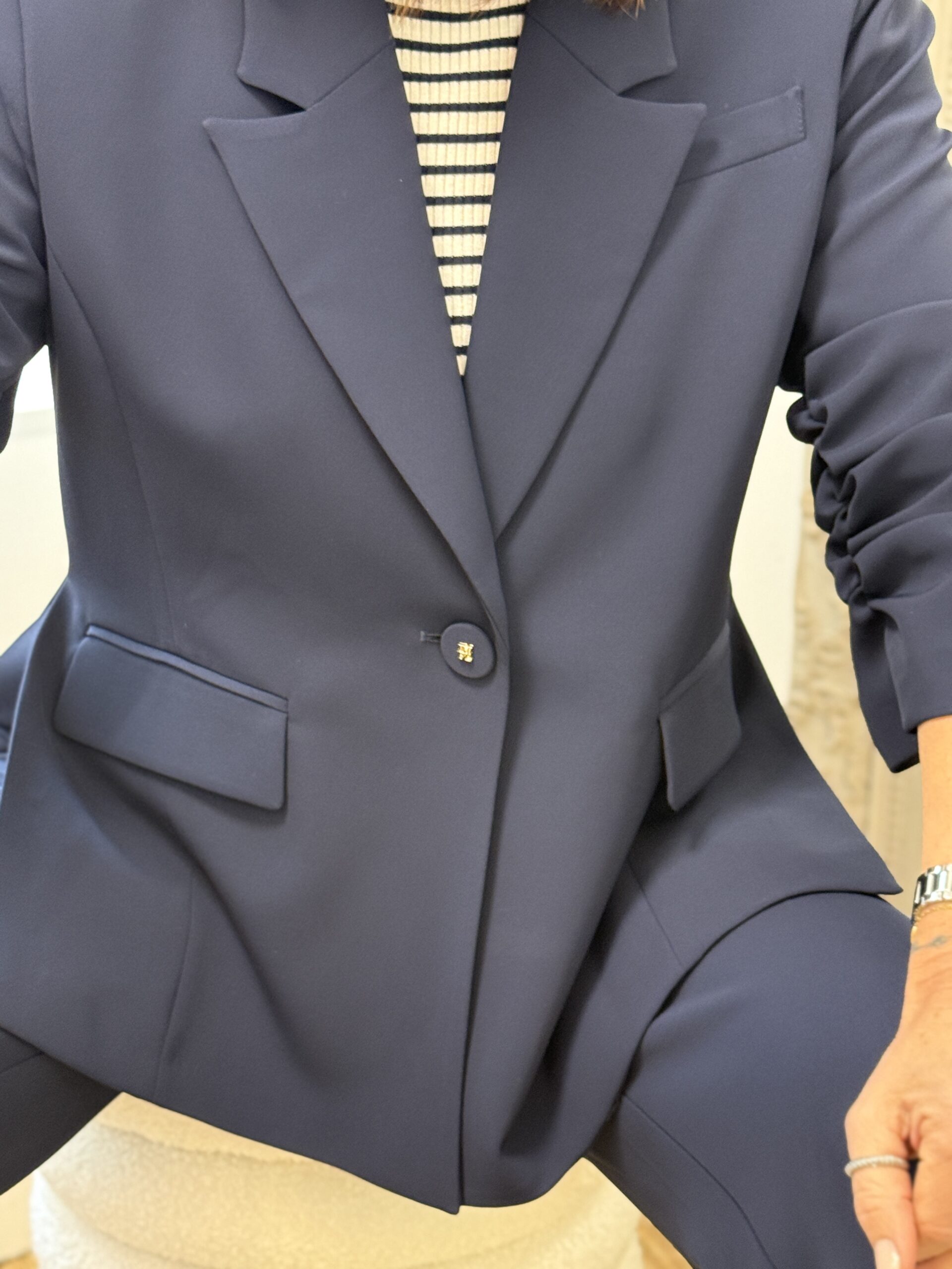 Cette veste blazer marine est une pièce élégante et facile à porter, parfaite pour structurer une tenue tout en restant confortable