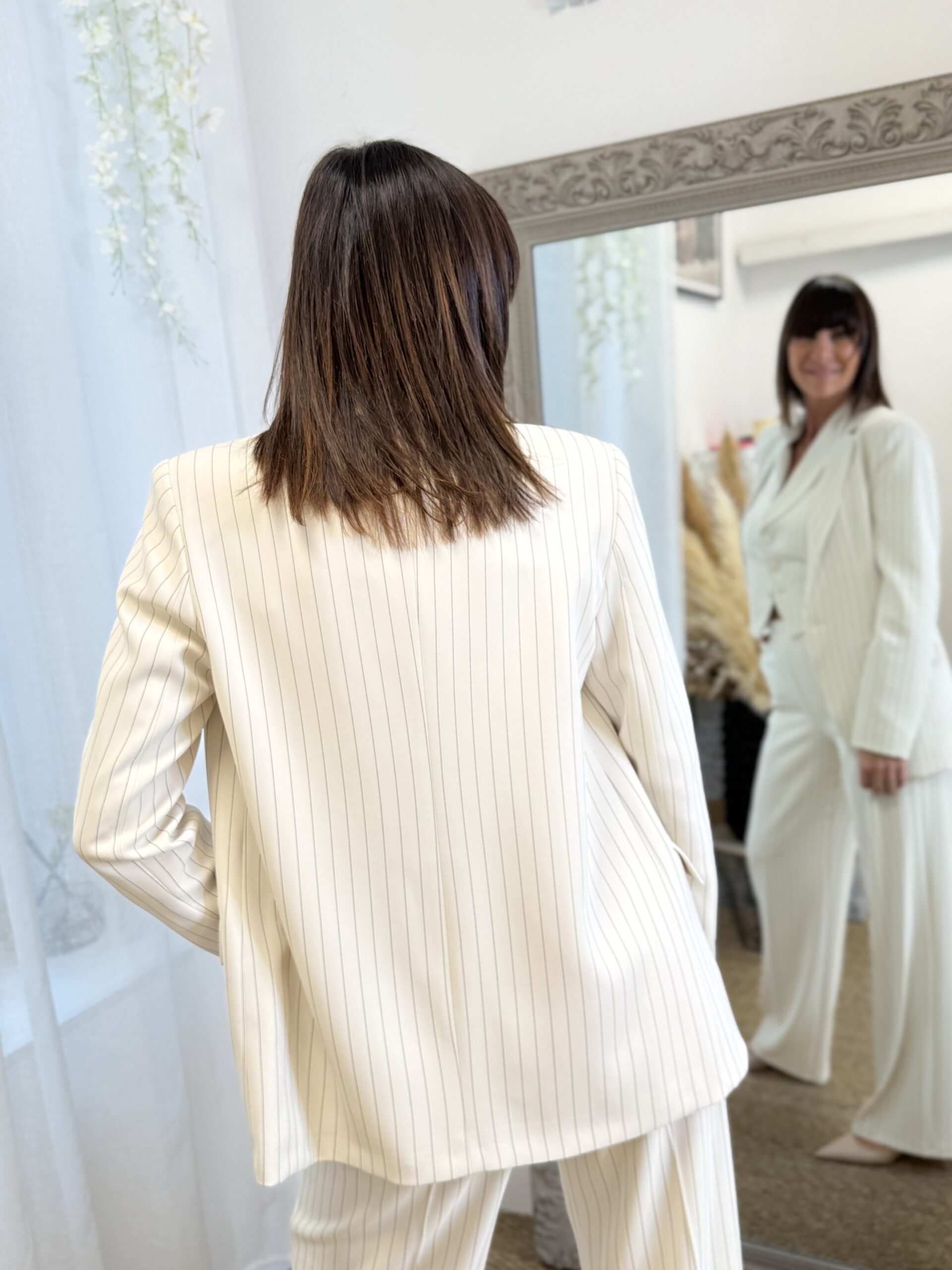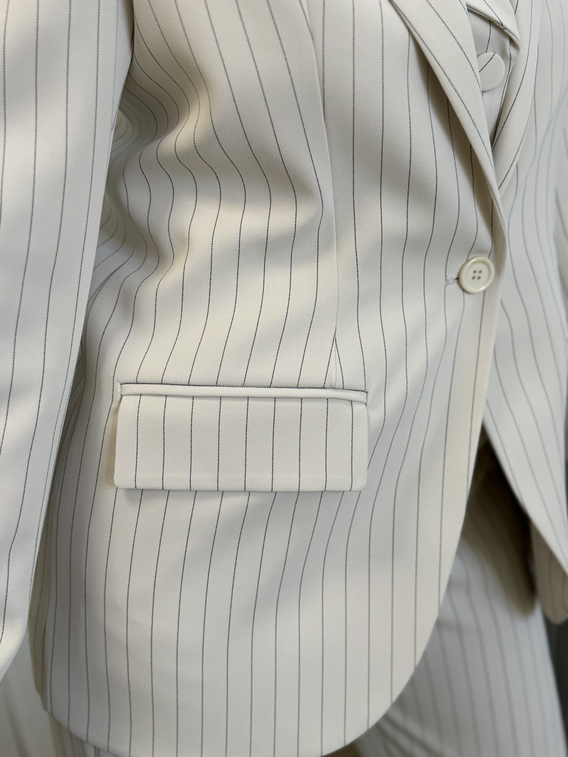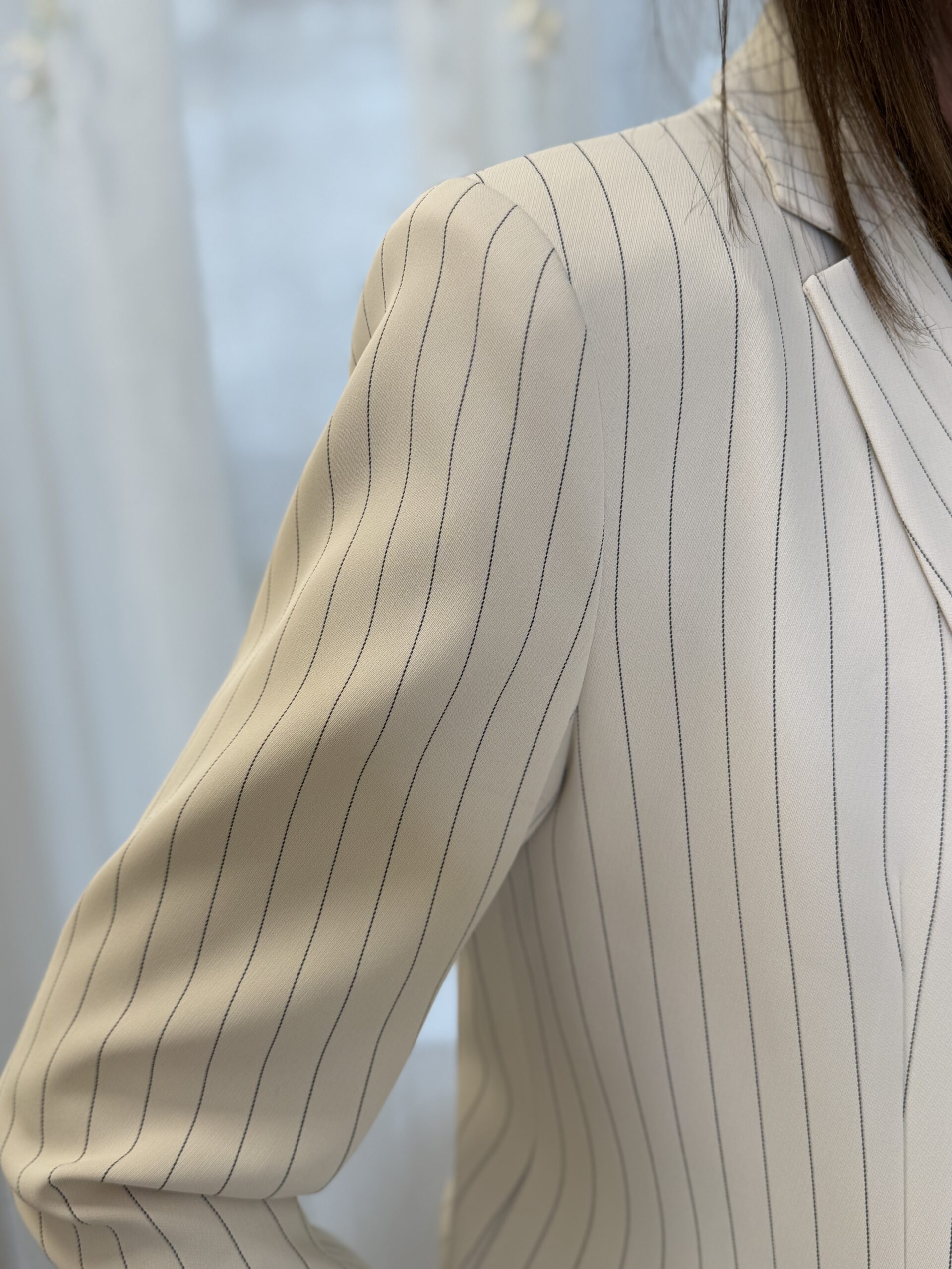 Cette veste blazer élégant à fines rayures, revisitant le tailoring classique avec une touche moderne et féminine.