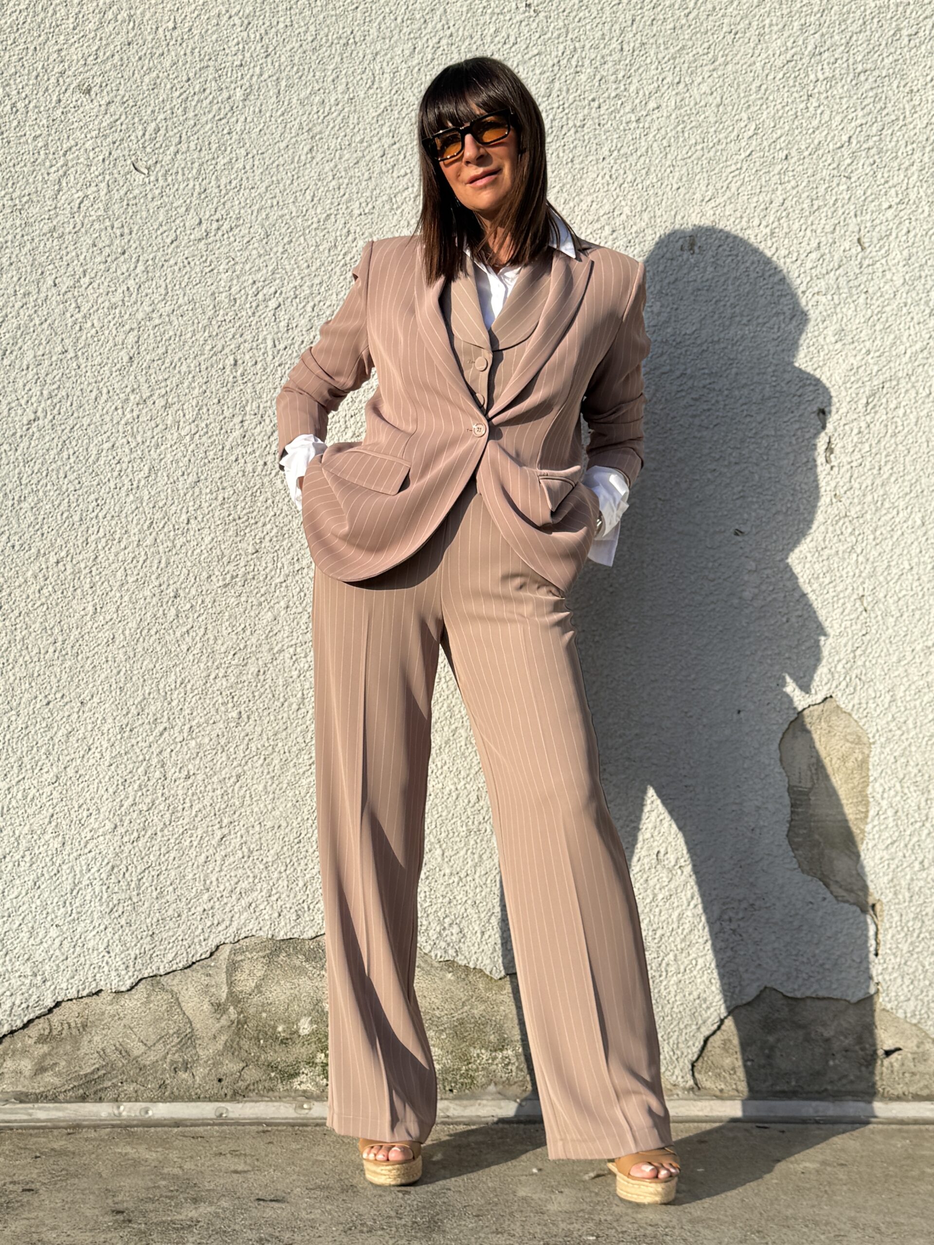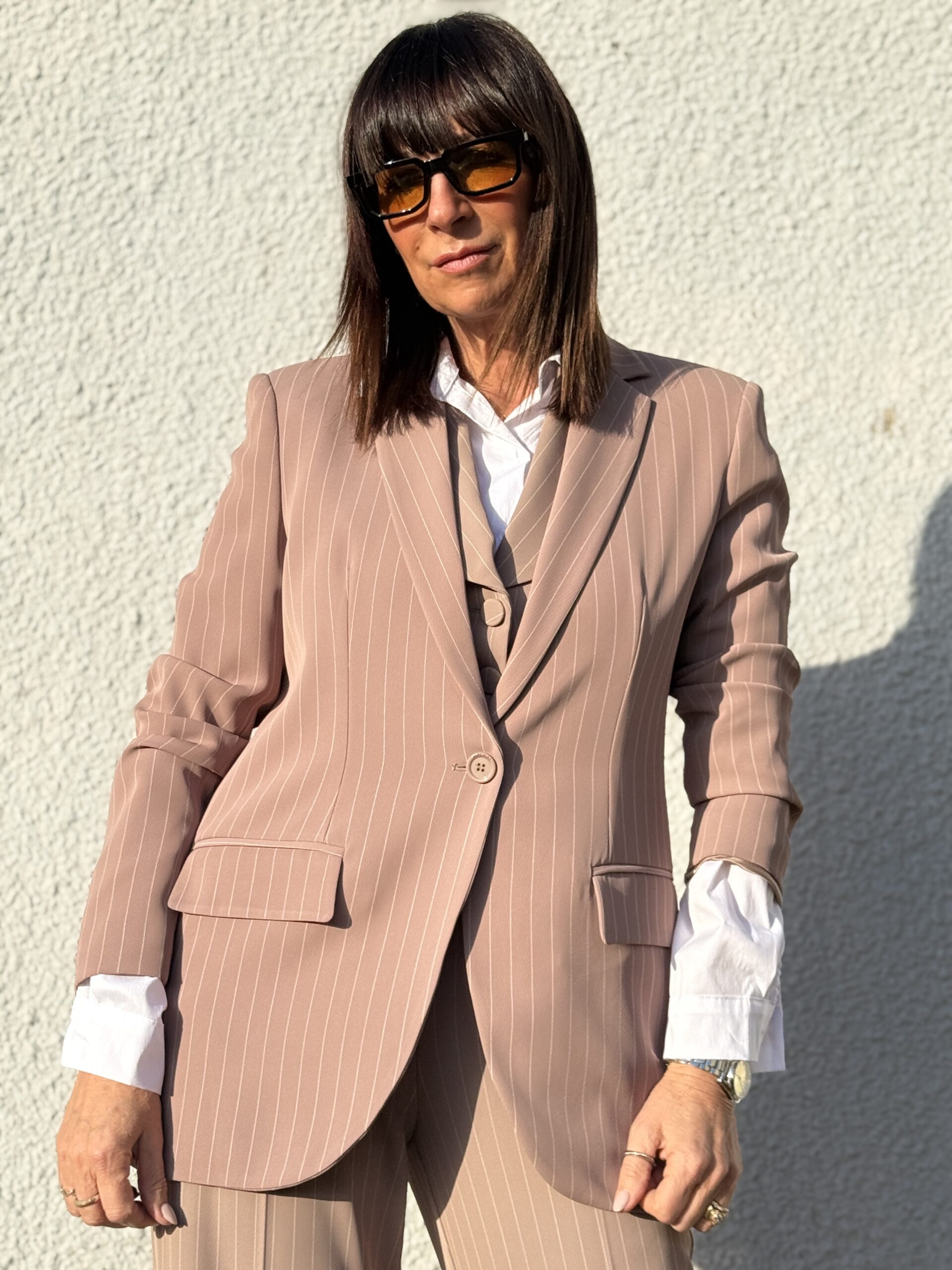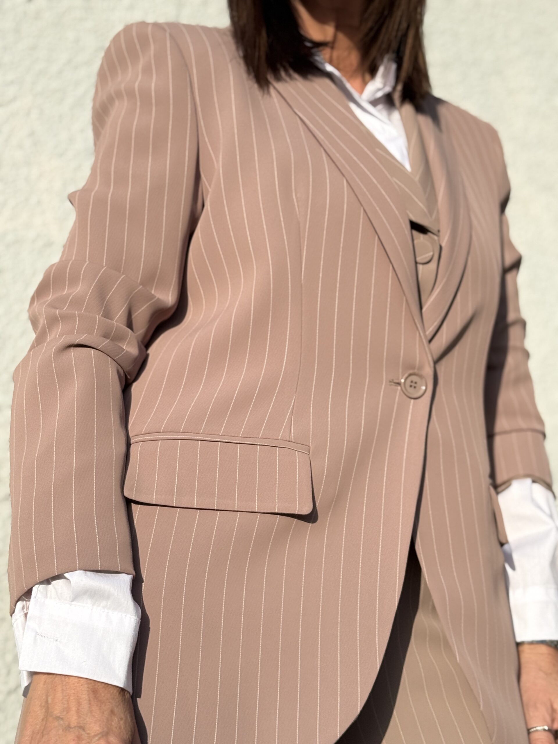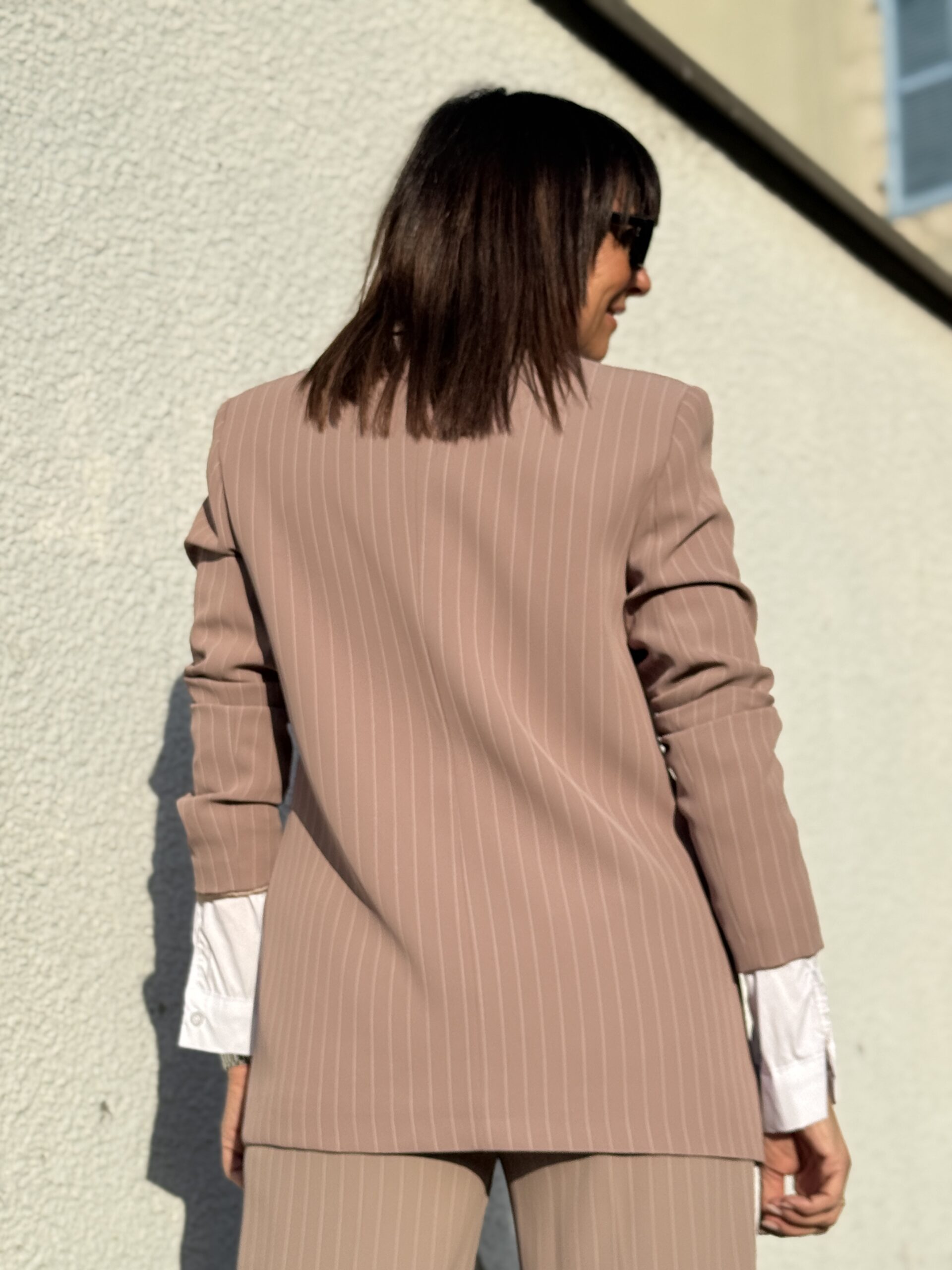 Cette veste blazer élégant à fines rayures, revisitant le tailoring classique avec une touche moderne et féminine.