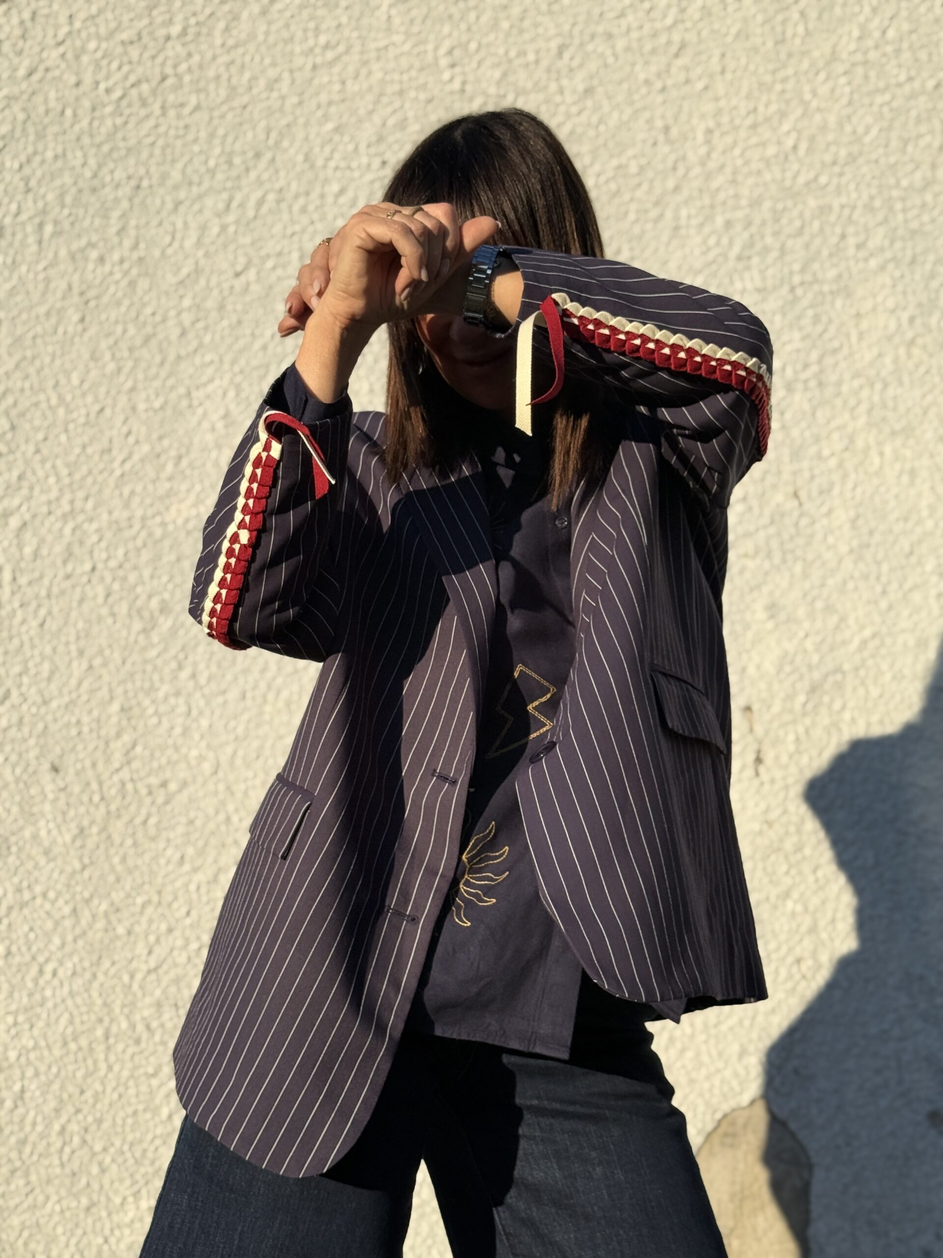 Blazer à l’allure tayloring contemporaine, revisitant le classique motif rayé avec une touche mode affirmée. Sa coupe structurée et son détail contrastant sur la manche en fond une pièce forte élégante et originale.