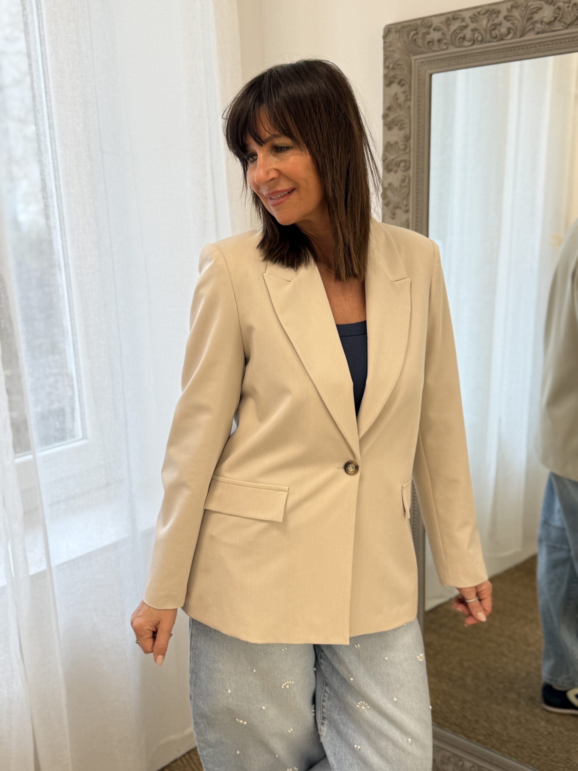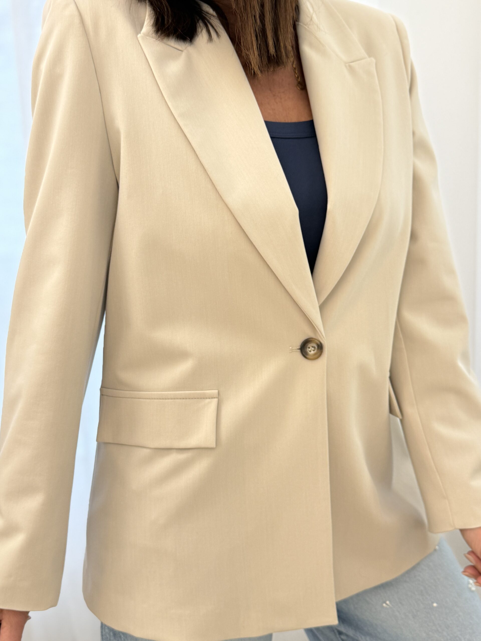 Cette veste blazer à la coupe élégante et intemporelle, décliné dans un beige doux et lumineux