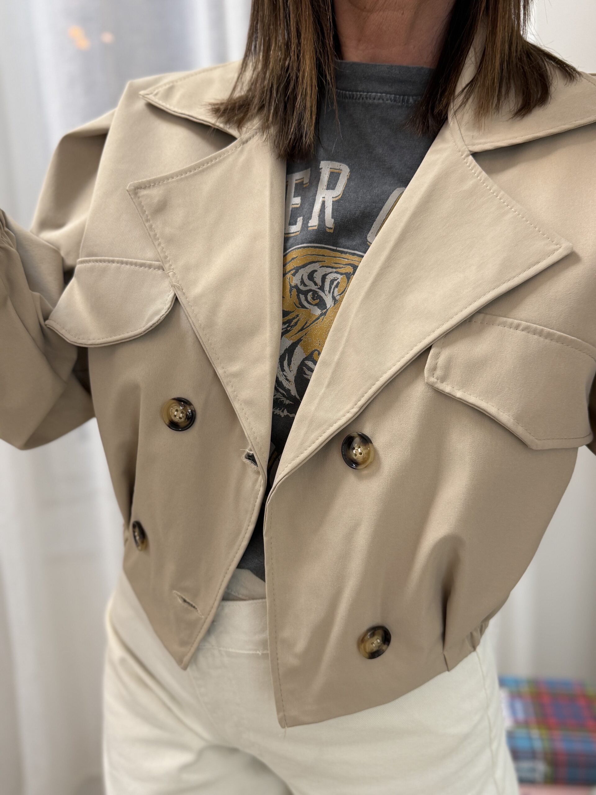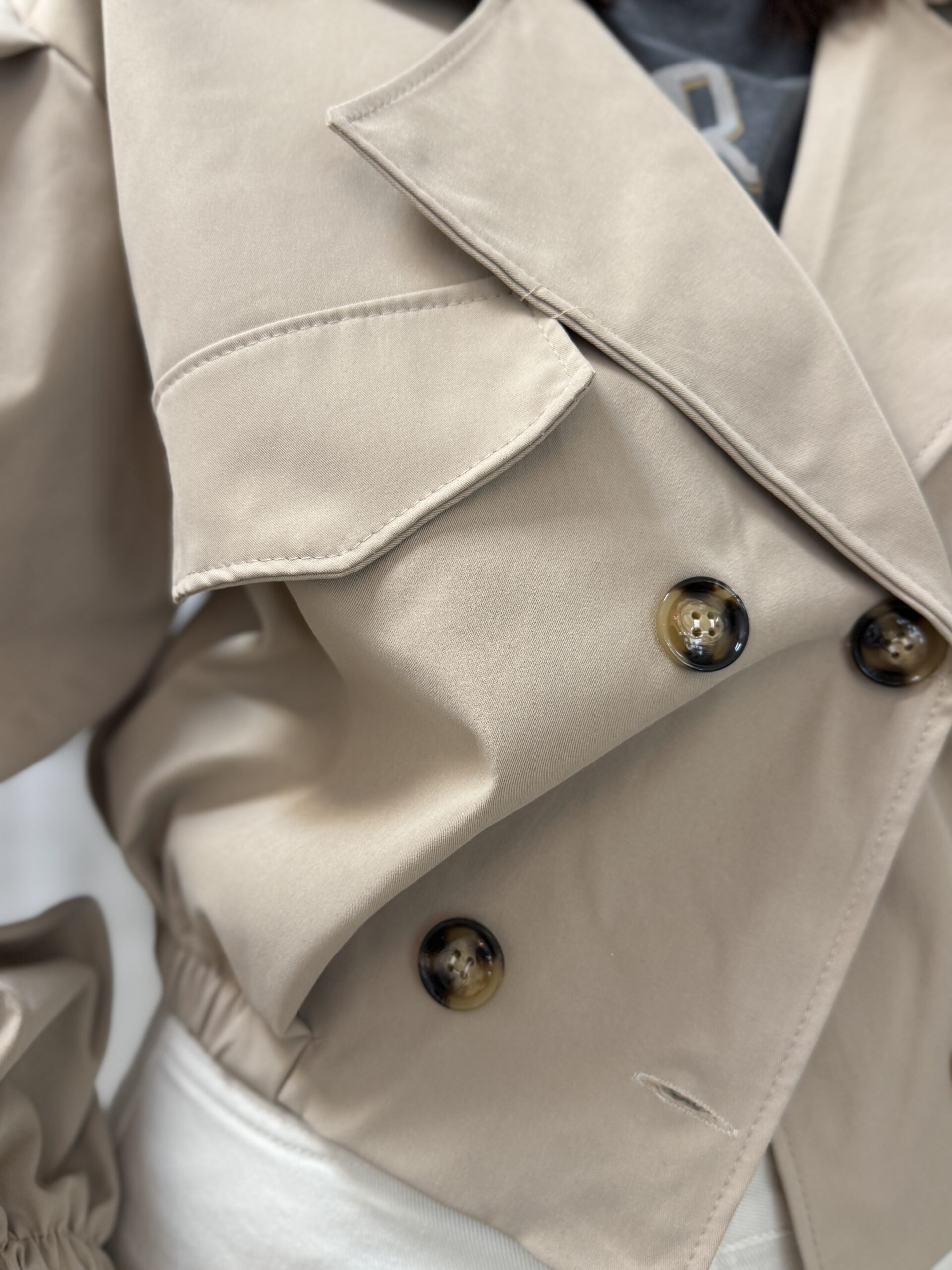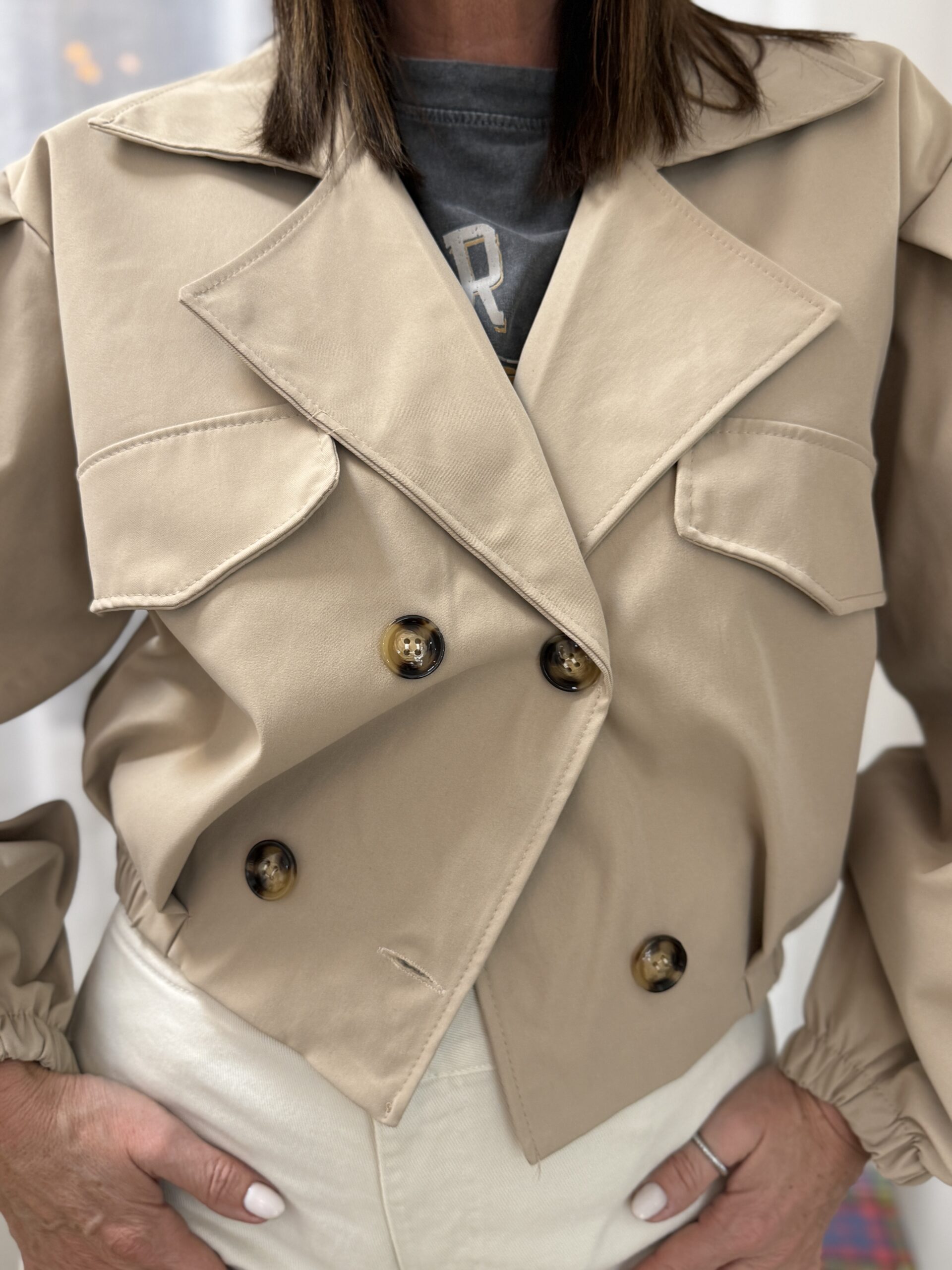 Ce bomber court beige revisite les codes du trench-coat classique dans une version moderne et structurée.