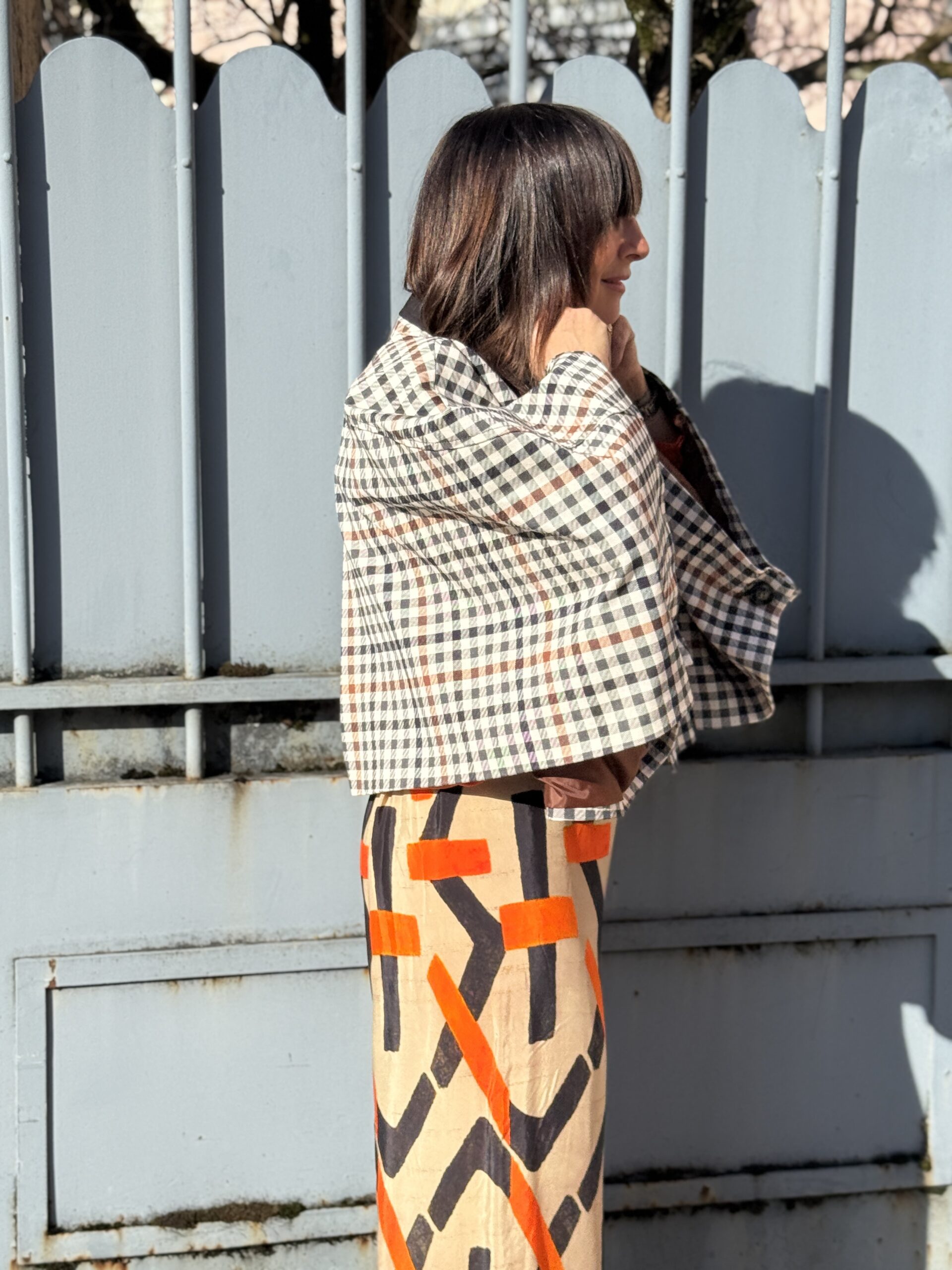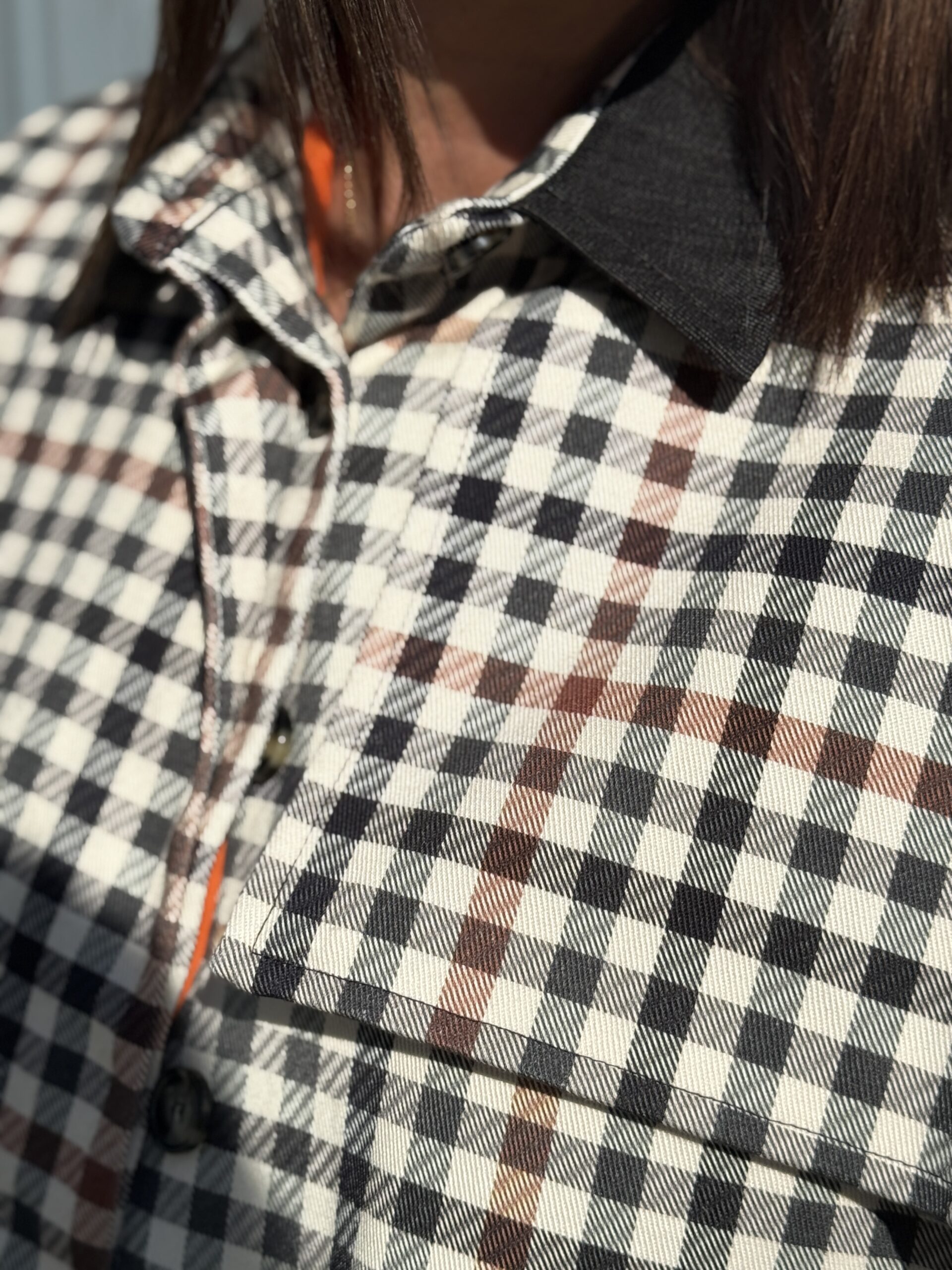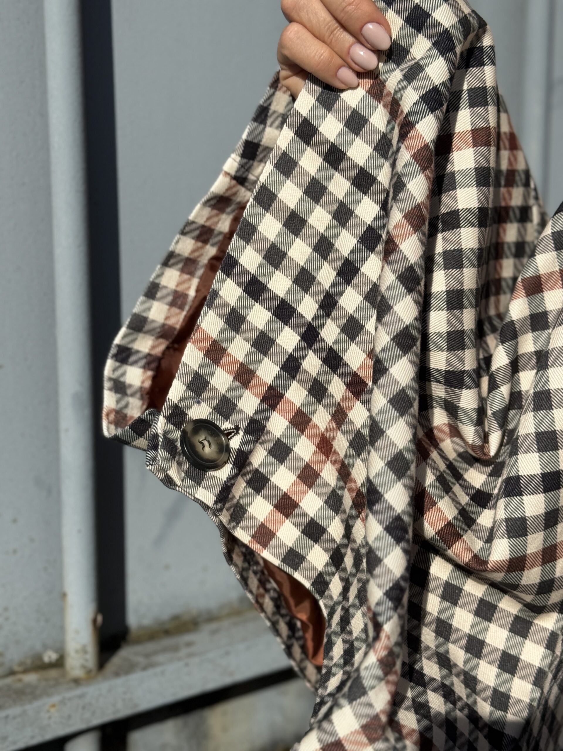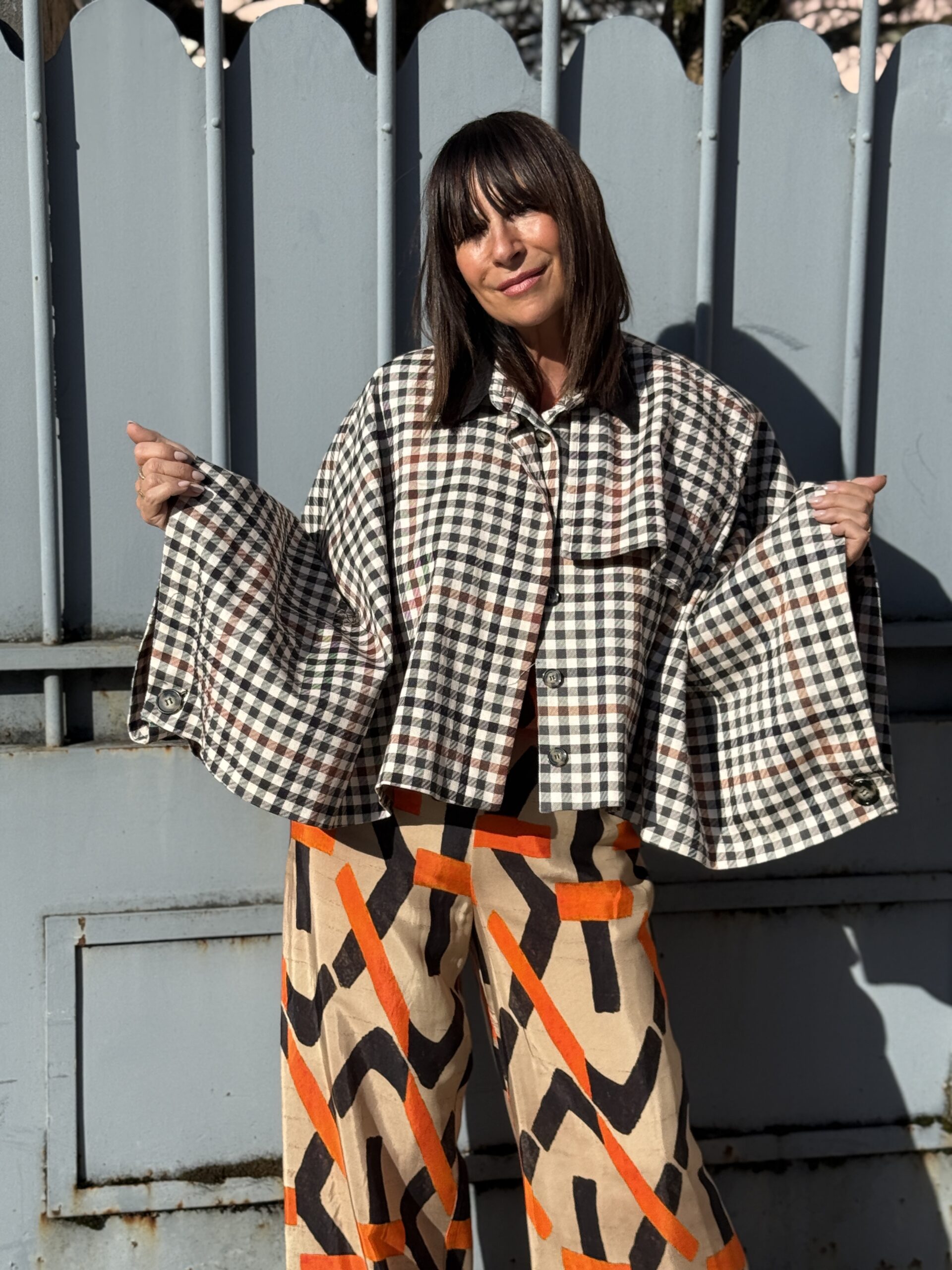 Veste esprit cape aux motifs carreaux, intemporel, sublimé par un col contraste noir qui structurent la silhouette. Sa coupe ample est évasée crée un joli mouvement et apporte une allure sophistiquée, tout en restant facile à porter.