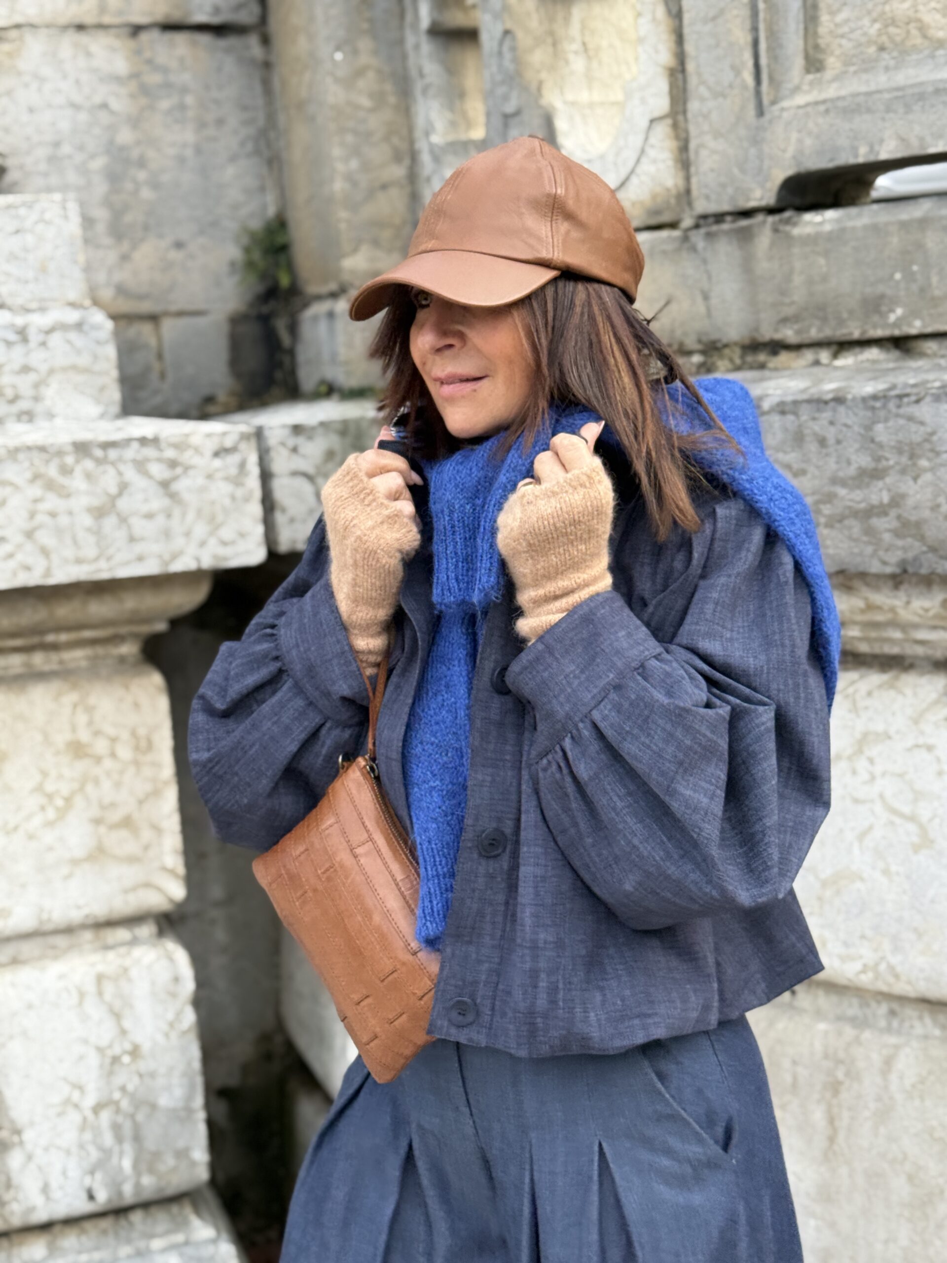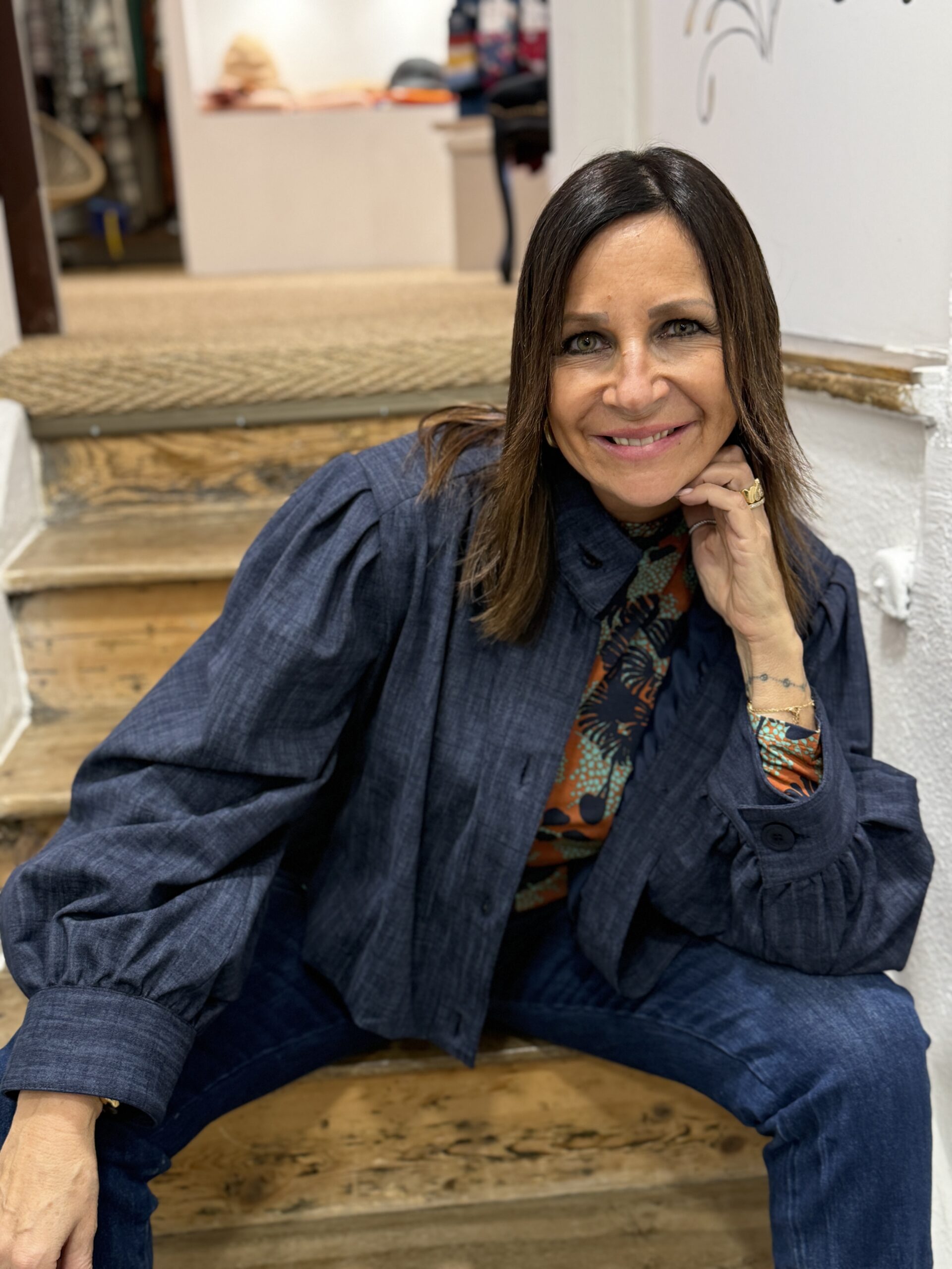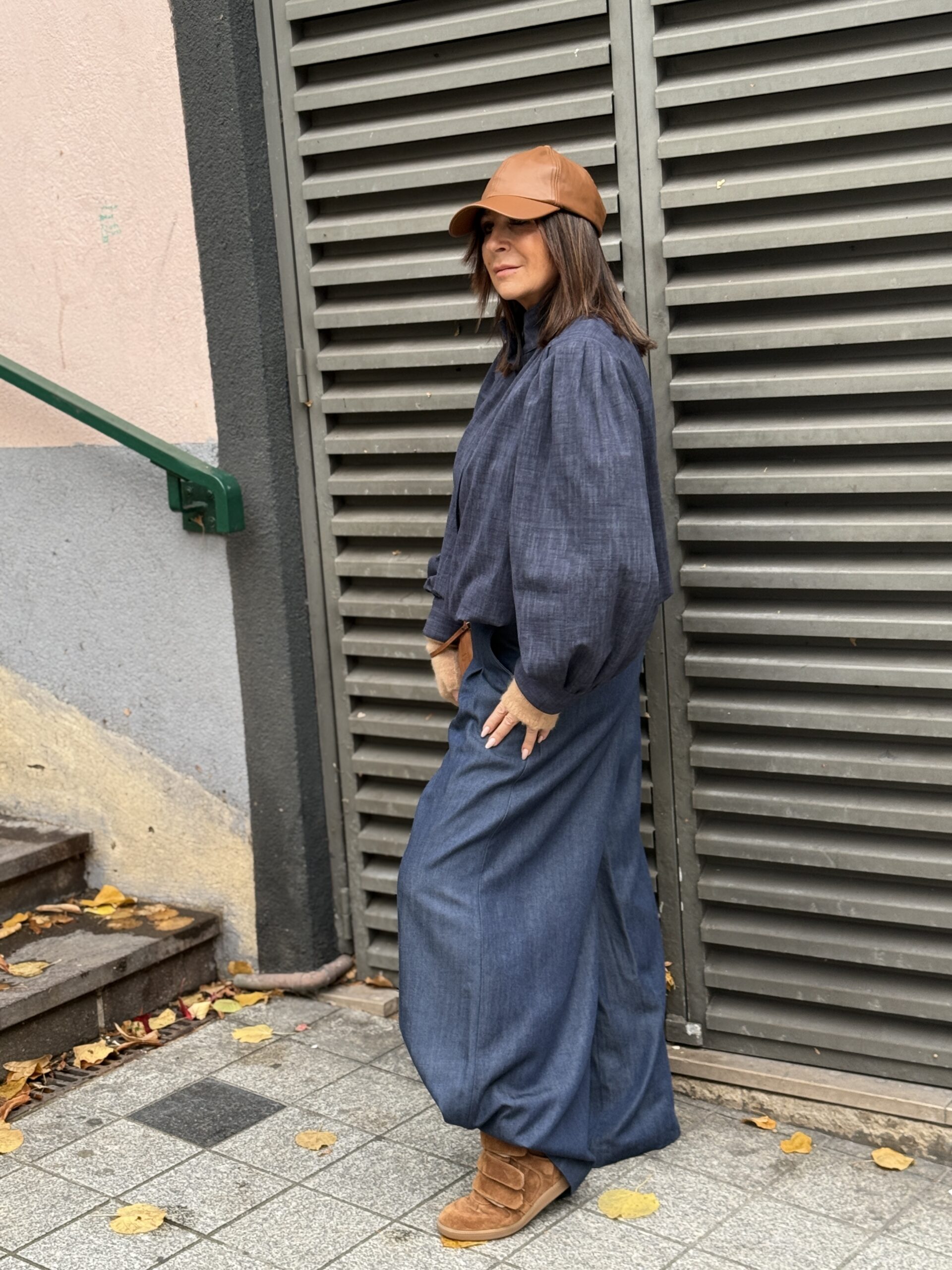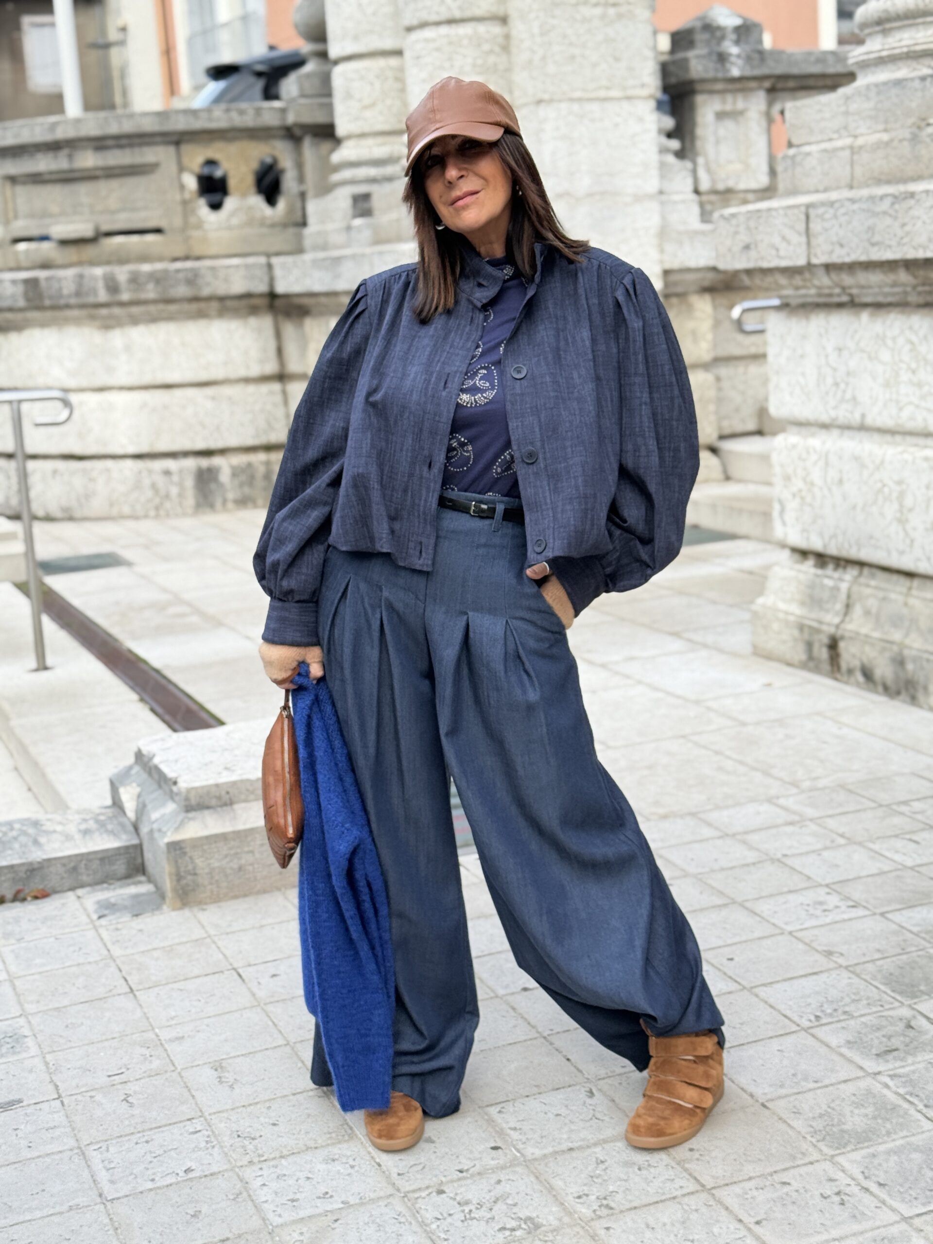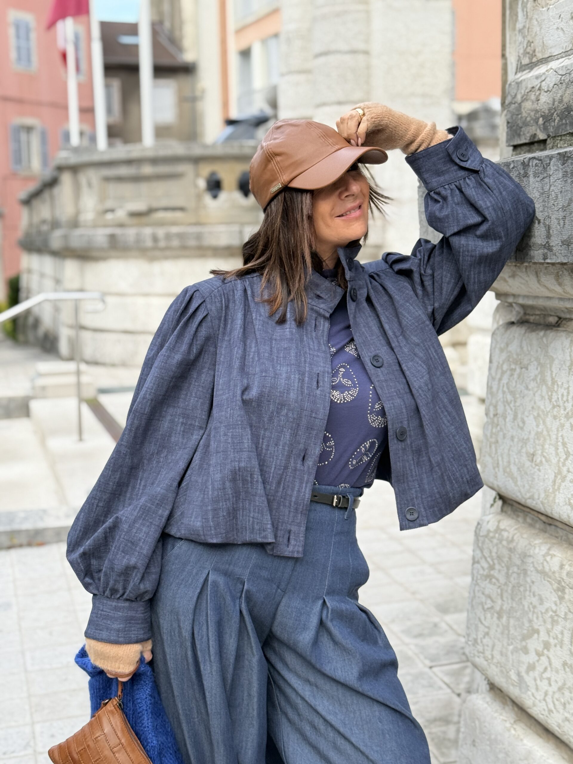 Cette veste courte en denim fluide, à la fois moderne et féminine