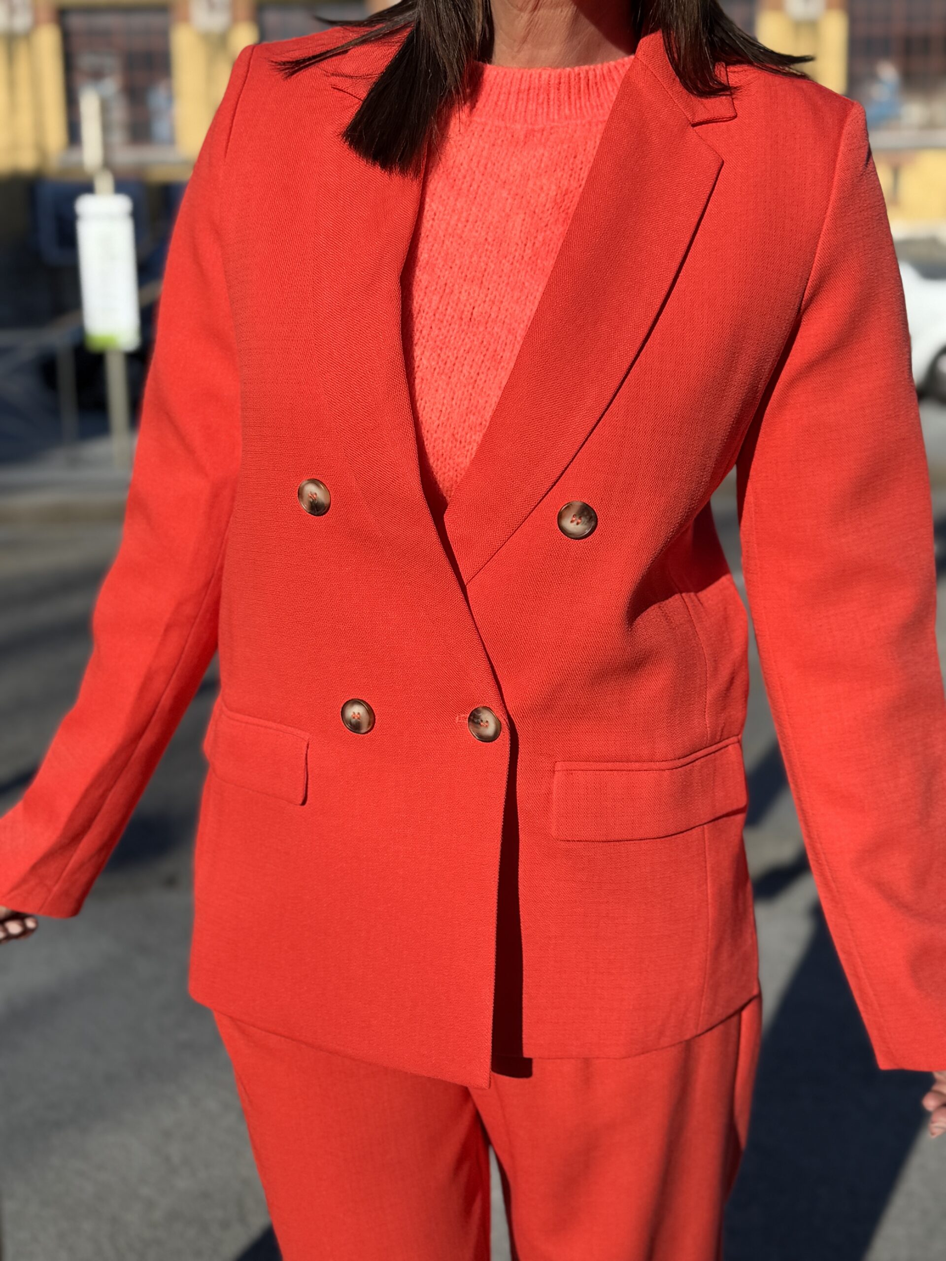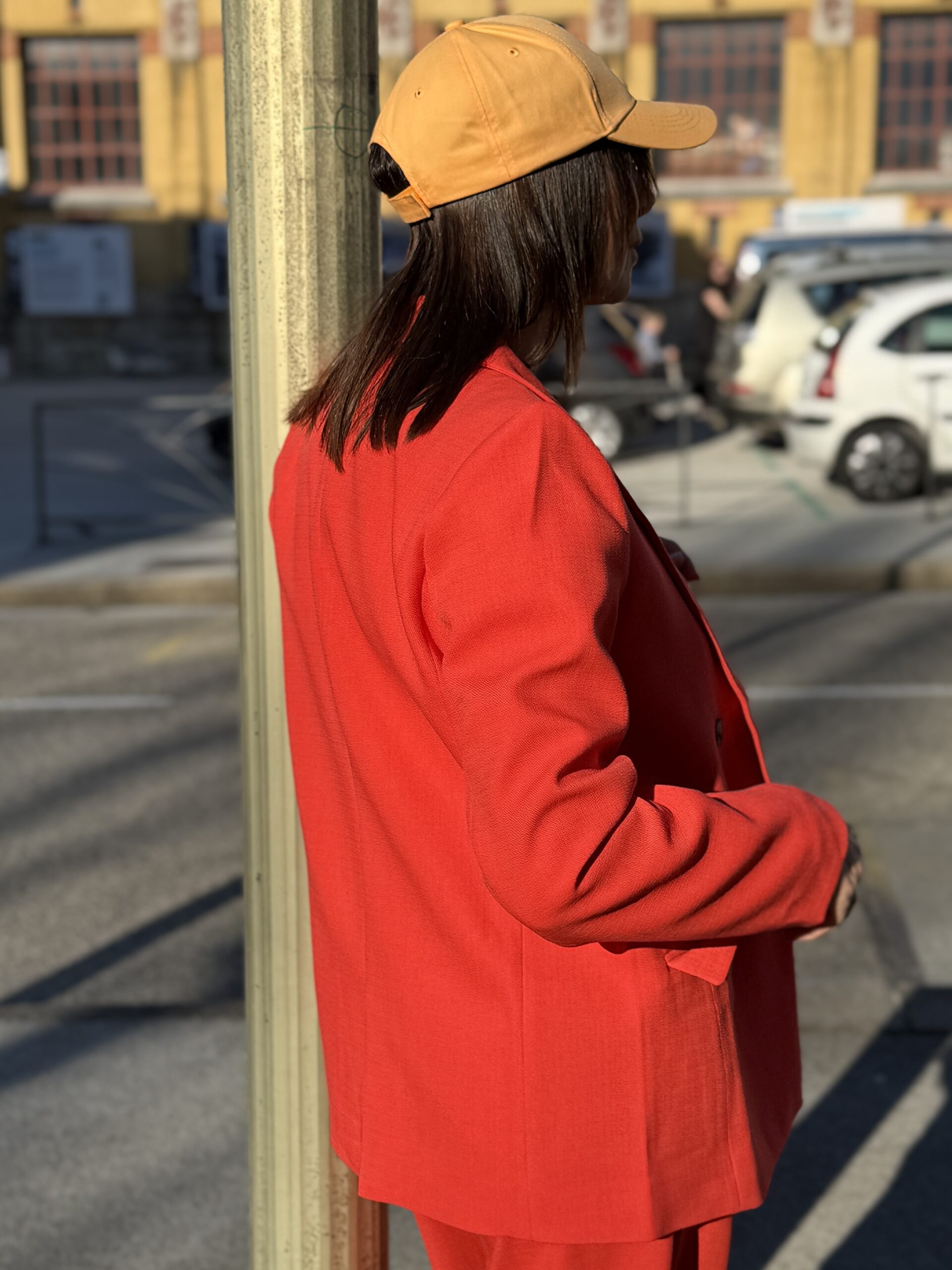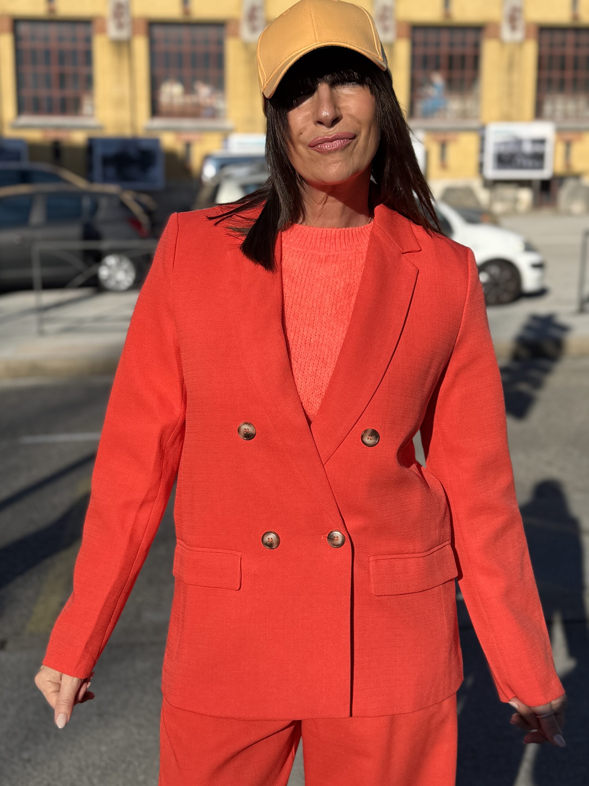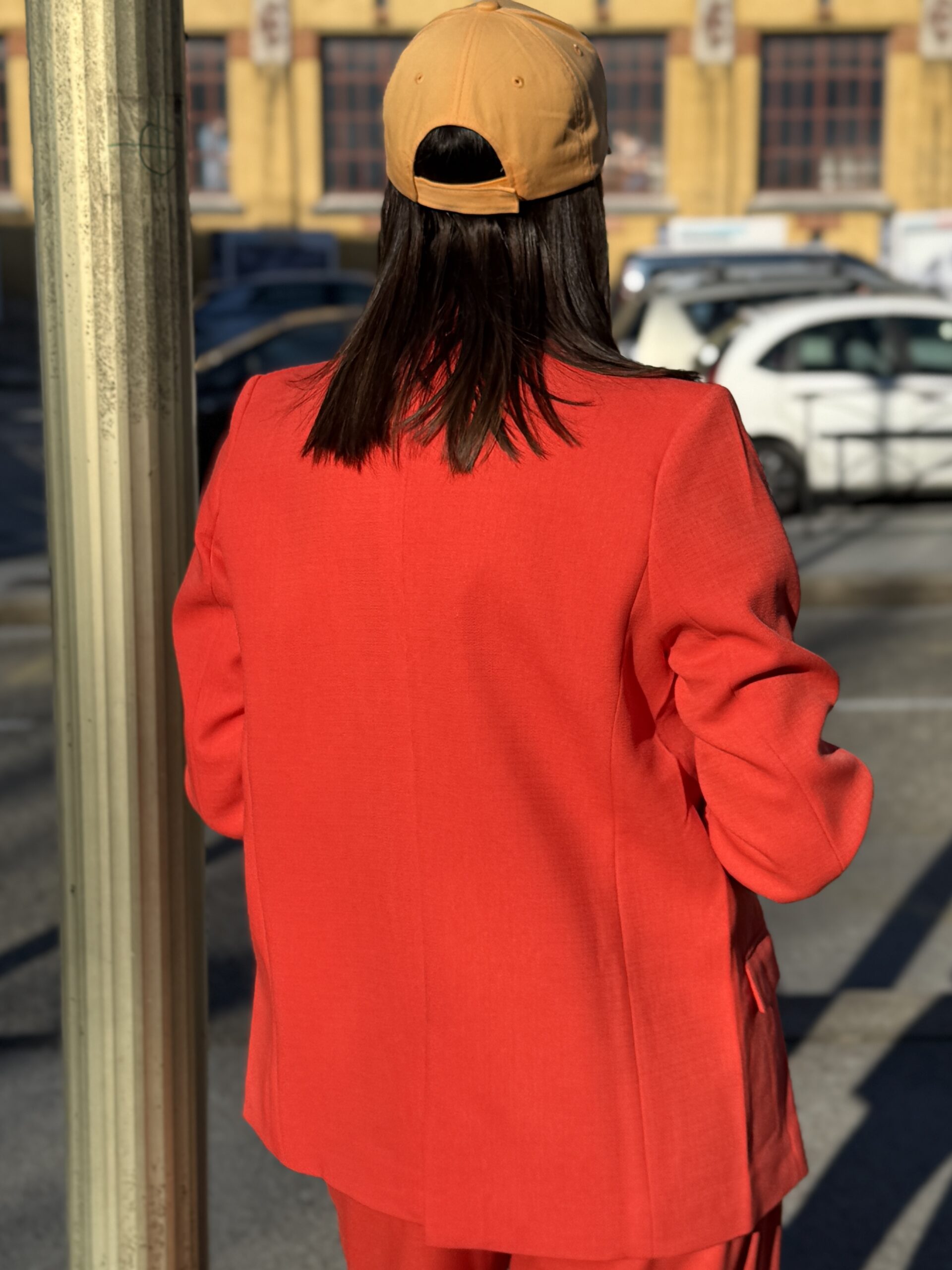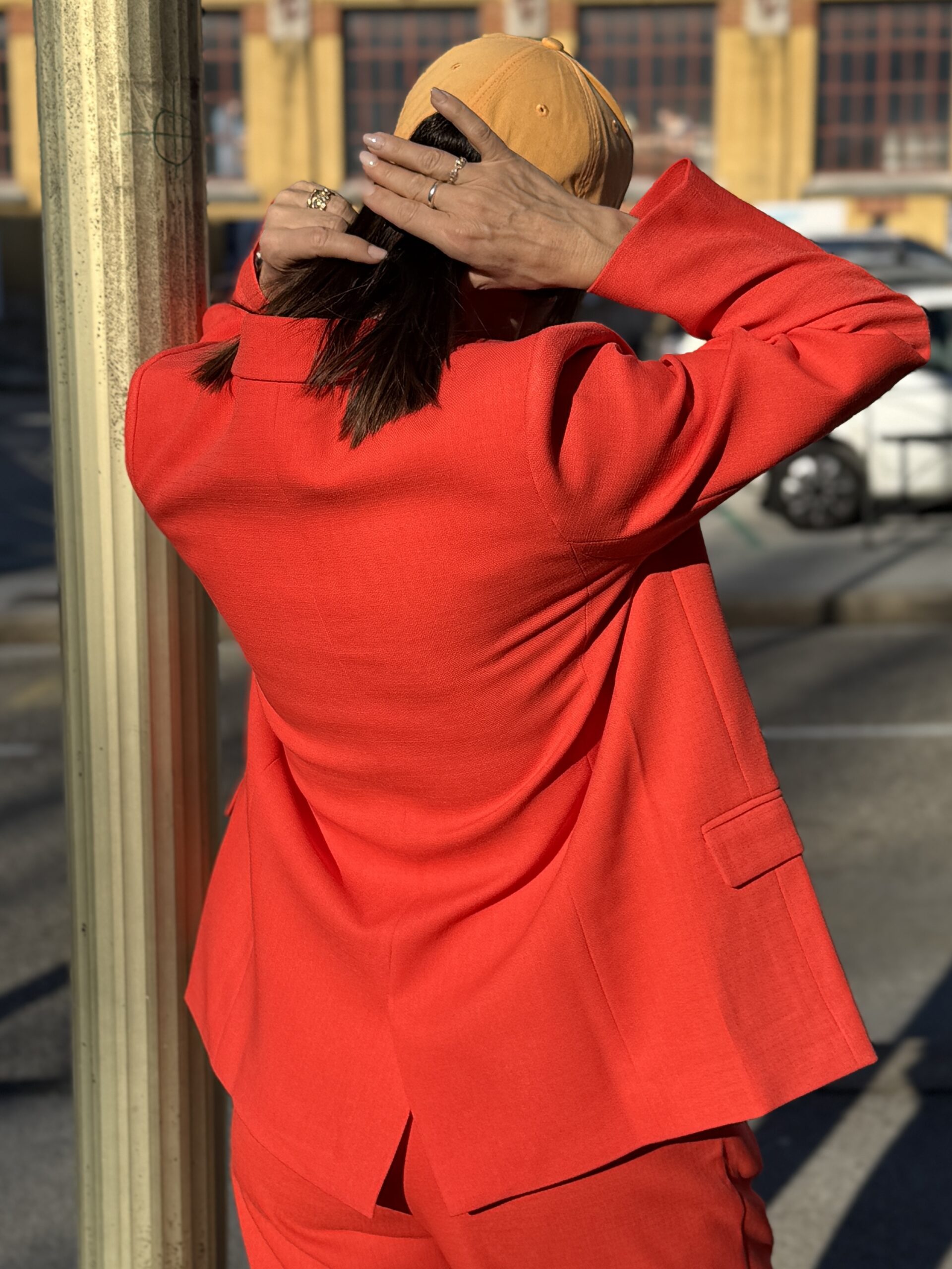 Audacieuse et élégante, cette veste tailleur orange sanguine illumine la silhouette avec caractère. Sa coupe droite structurée et son double boutonnage apportent une allure résolument moderne, parfaite pour affirmer un style chic et contemportain.