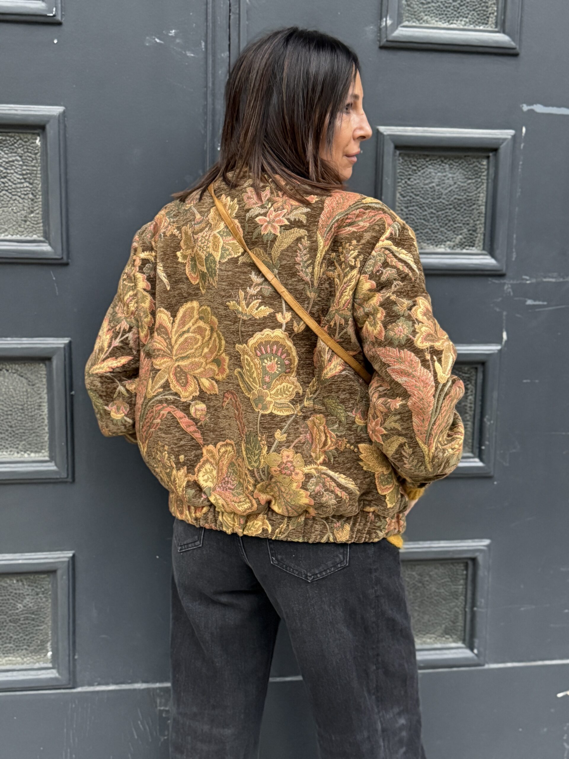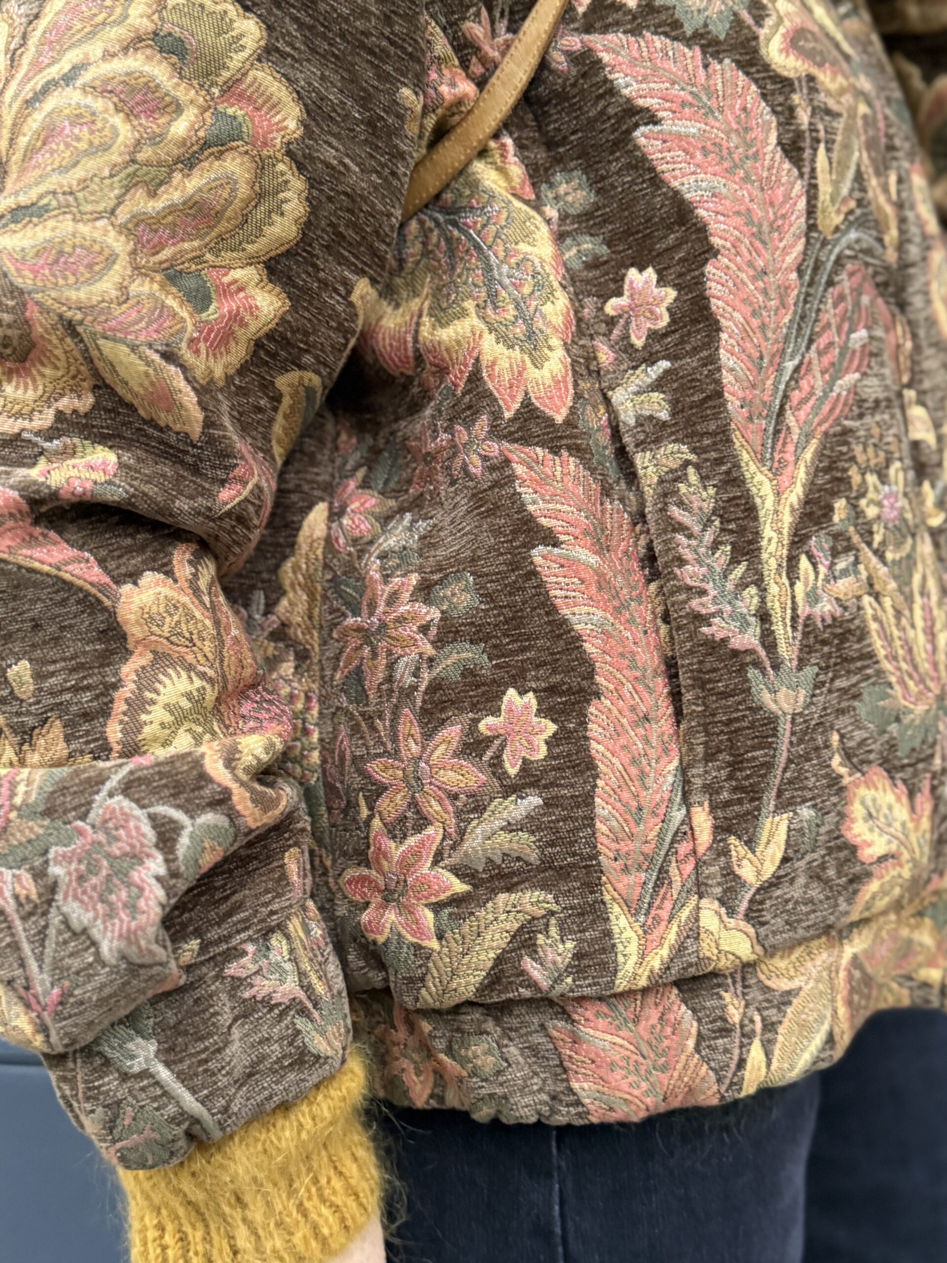 Plongez dans l’élégance rétro avec cette superbe veste jacquard aux motifs floraux multicolores!